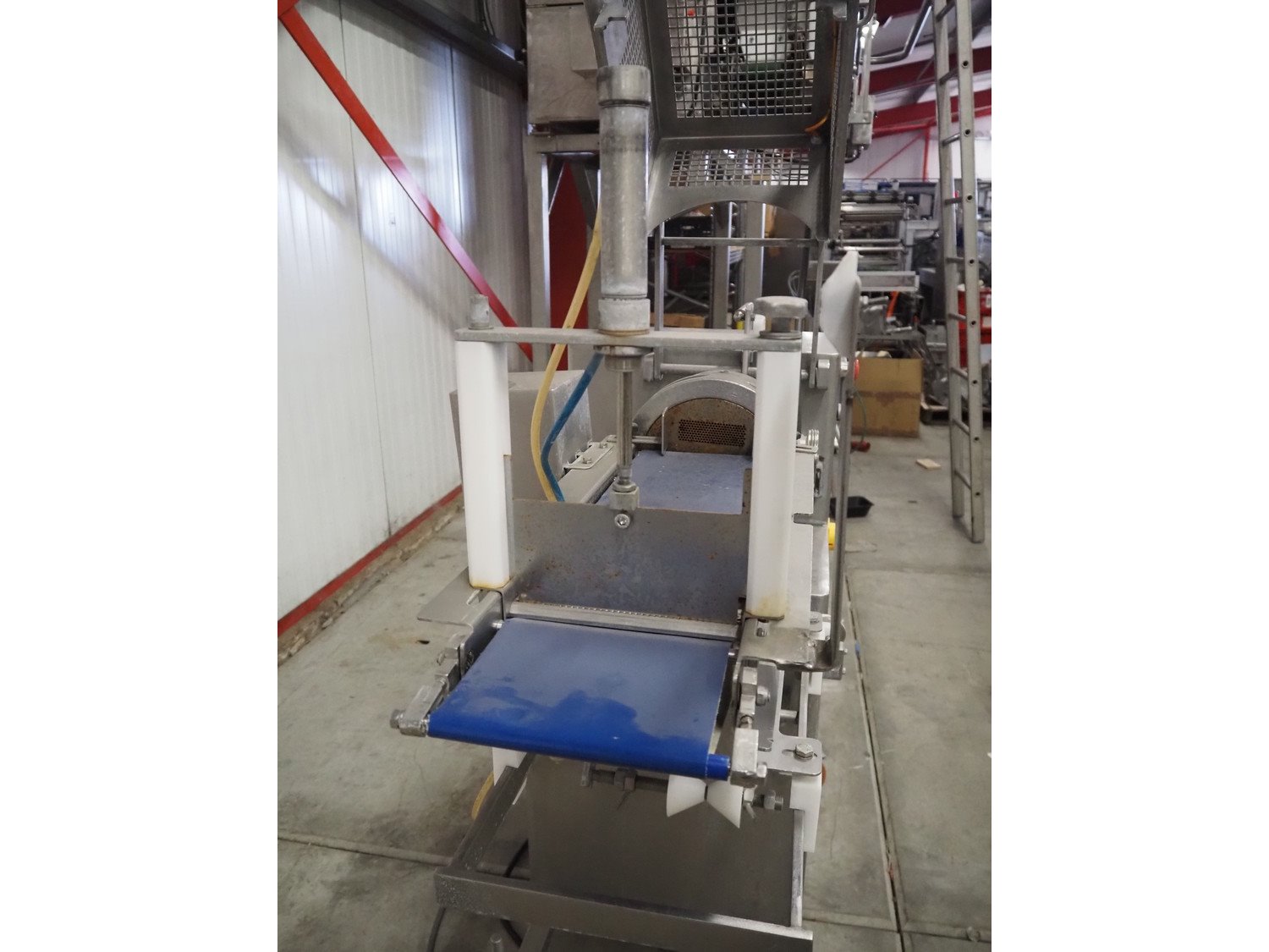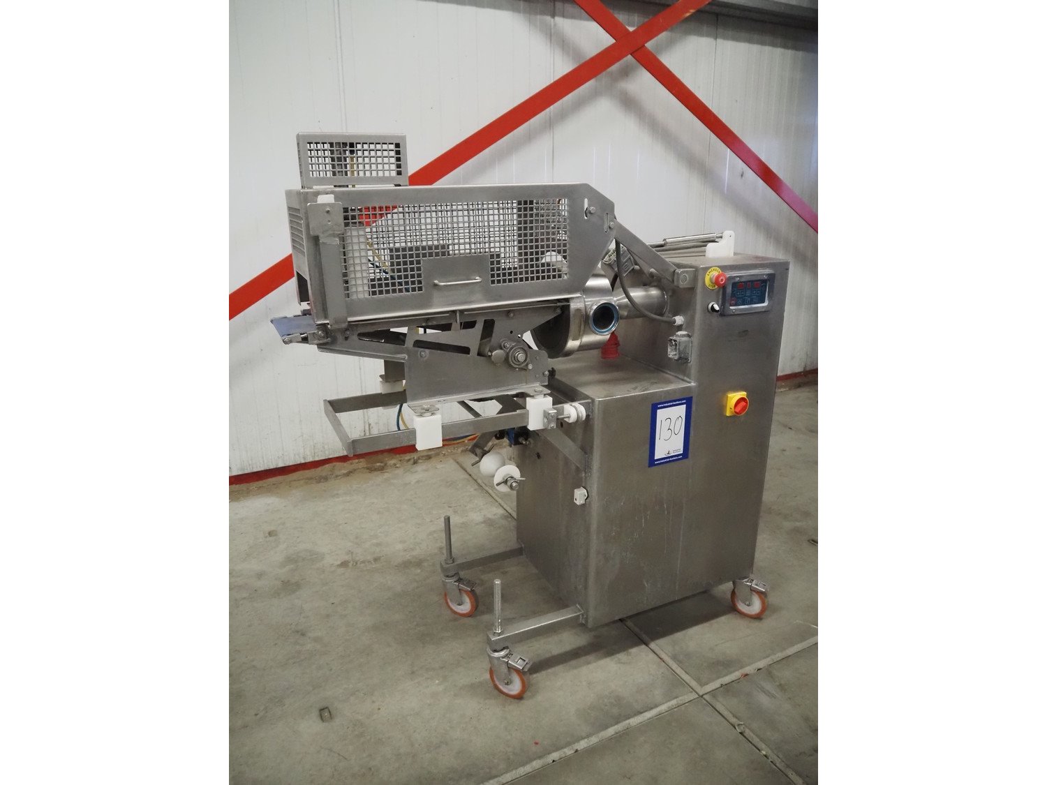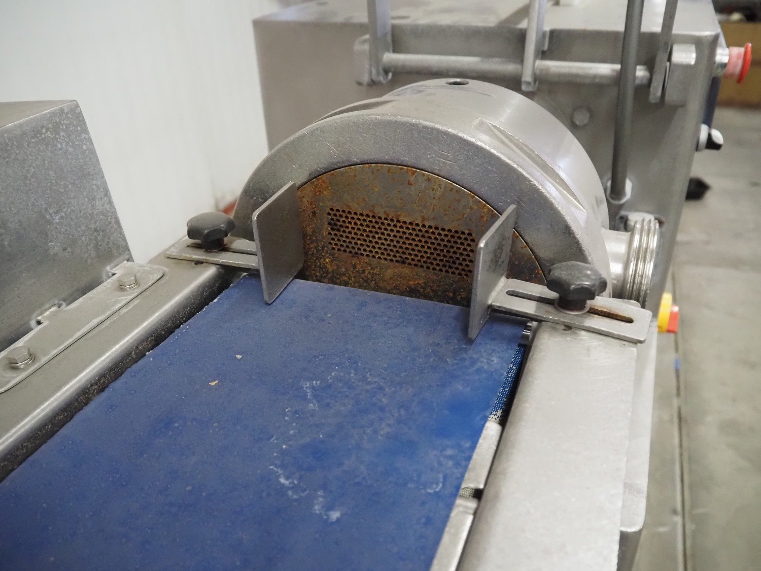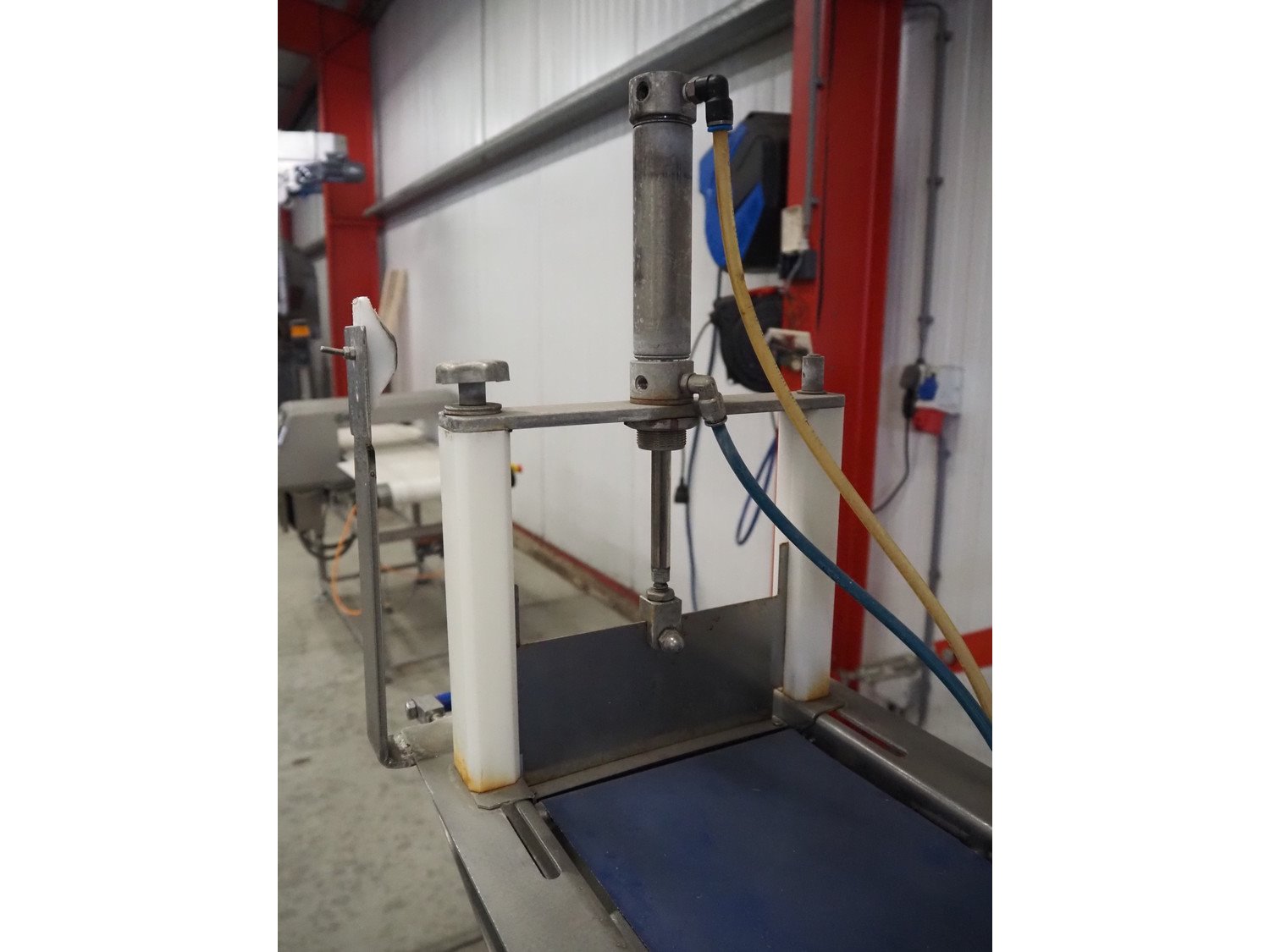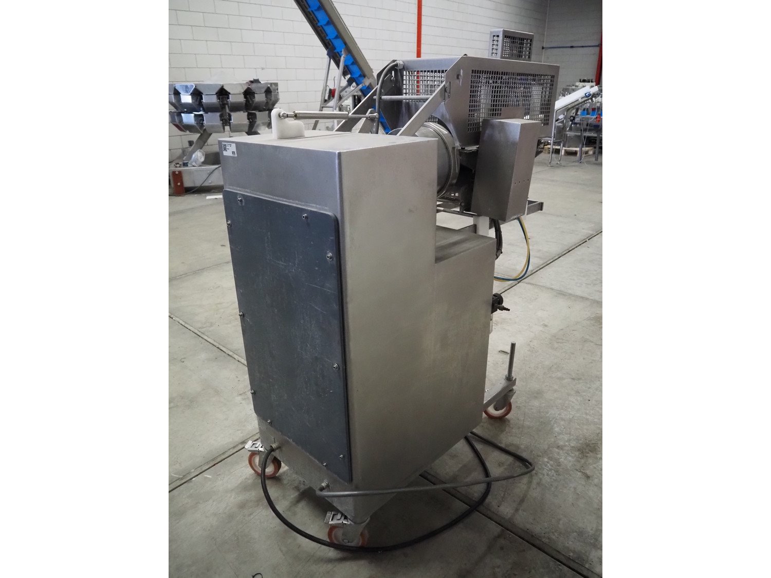 Risco mobile portioning machine for minced meat, type: RS 914, serial number: P510003, year of construction: 2010, 400 V, 3 Ph, 50 Hz, plastic belt, belt width: 180 mm, knife width: 180 mm, total dimensions: 1450 mm x 600 mm x 1580 mm. Kavel locatie: Bedrijfsweg 7, 8304 AA Emmeloord, Nederland