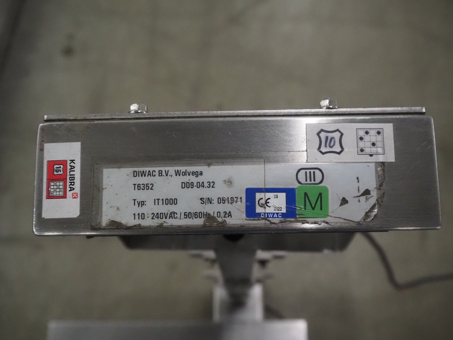 Diwac b.v. weighing scale, type: IT1000, serial number: 051971, 110-240 V, 50/60 Hz, 0.2 A, maximum weight: 30 kg, minimum weight: 0.2 kg, e=d= 0.01 kg, dimensions: 500 mm x 500 mm x 770 mm. Kavel locatie: Bedrijfsweg 7, 8304 AA Emmeloord, Nederland
