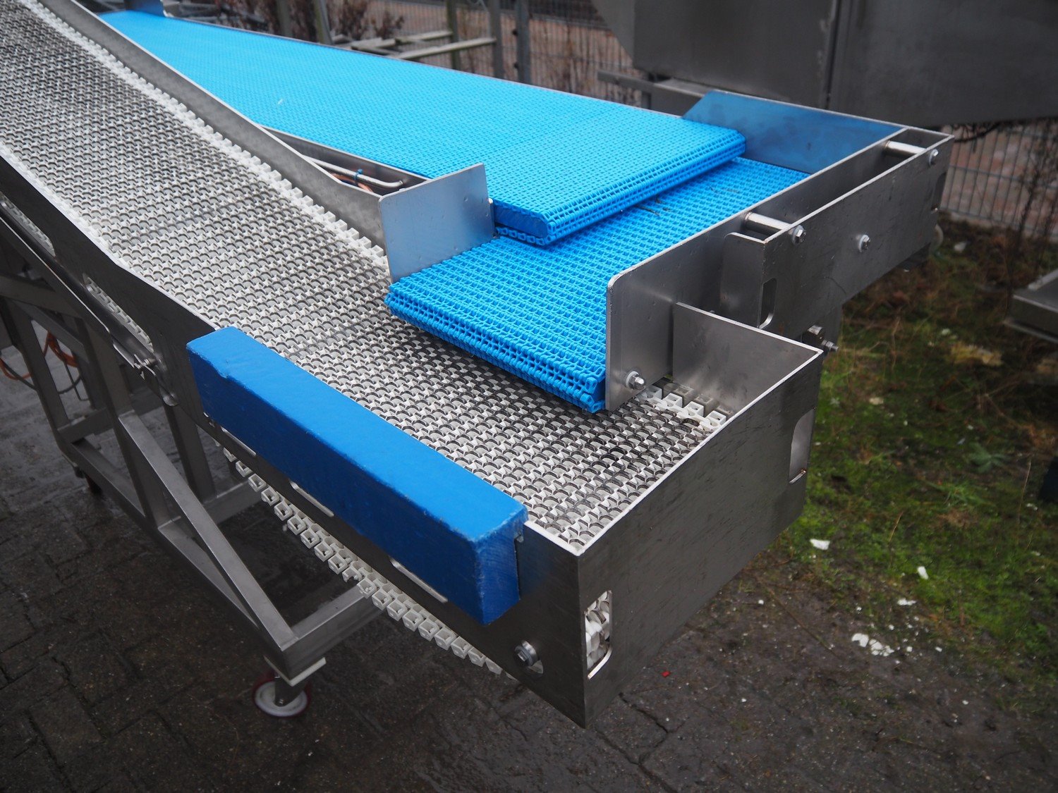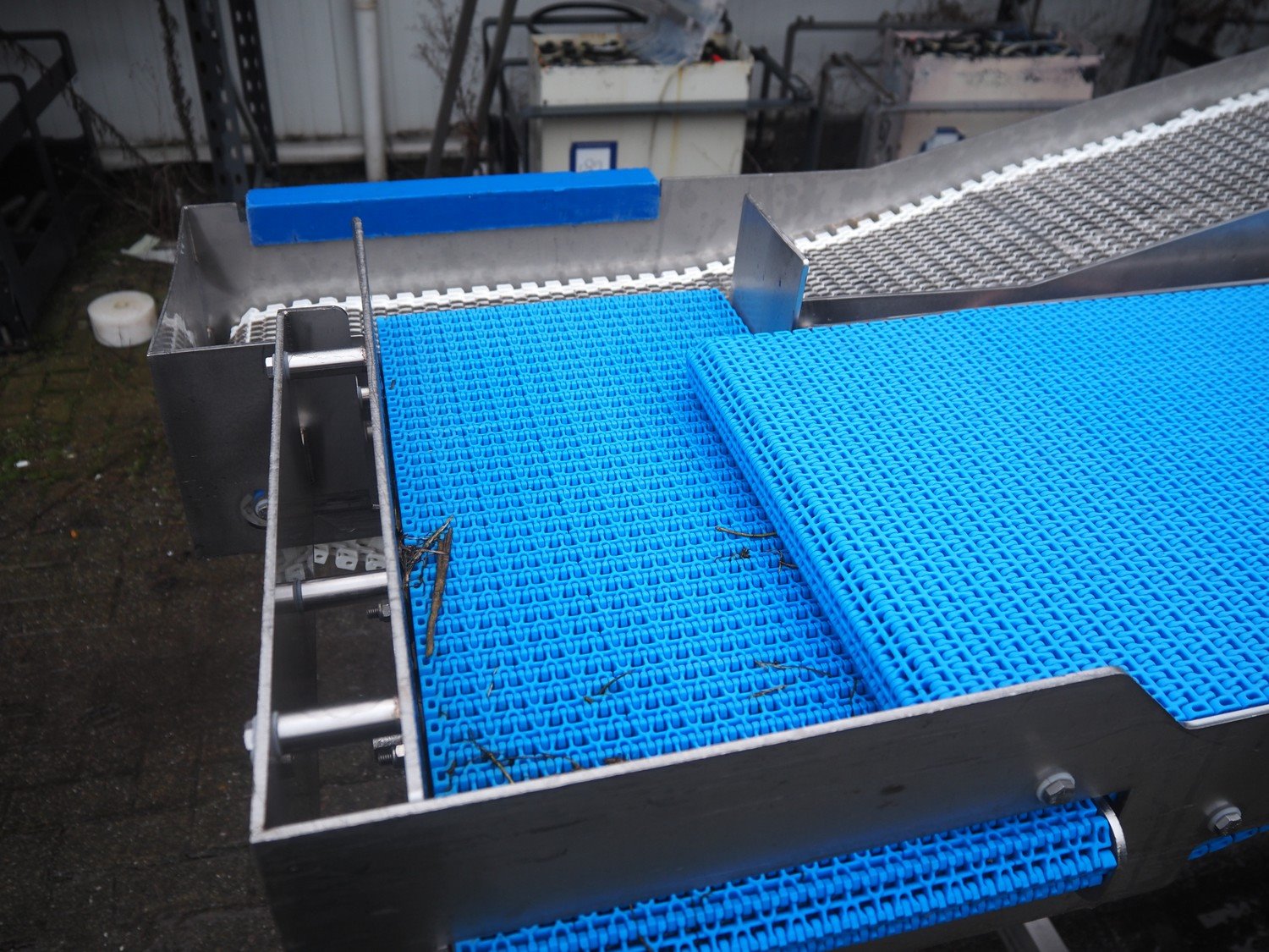 Mobile elevating belt, plastic mesh belt, belt width: 400 mm and 300 mm, elevating height: 1700 mm, total dimensions: 3400 mm x 1000 mm x 2000 mm. Kavel locatie: Bedrijfsweg 7, 8304 AA Emmeloord, Nederland