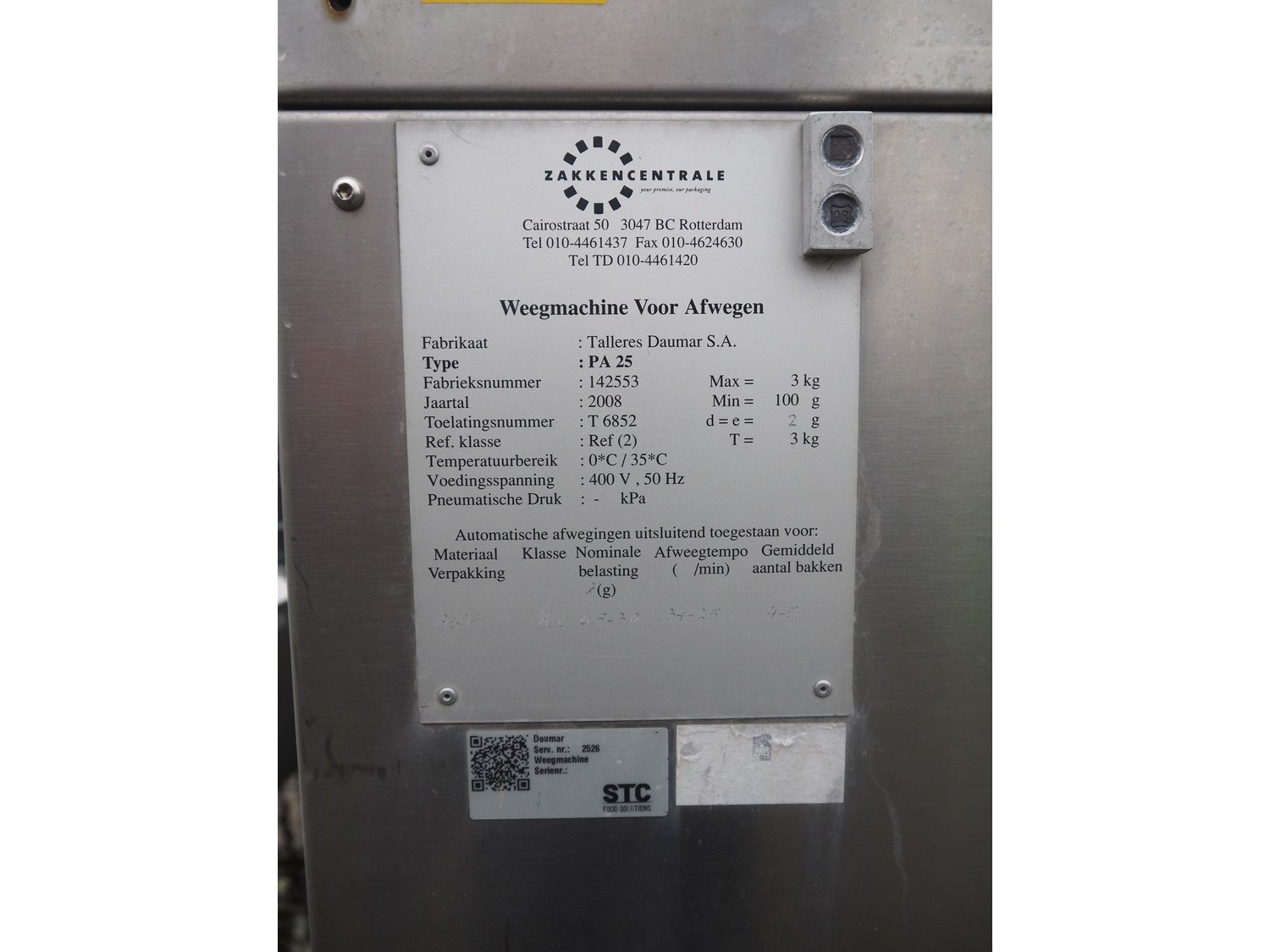 Daumar S.A. multihead weigher, type: PA 25, fabrication number: 142553, year of construction: 2008, 400 V, 50 Hz, maximum weight: 3 kg, minimum weight: 100 gram, d=e=: 2 gram, T= 3 kg, plastic belt, belt width: 220 and 250 mm, total dimensions: 1400 mm x 1400 mm x 2750 mm. Kavel locatie: Bedrijfsweg 7, 8304 AA Emmeloord, Nederland