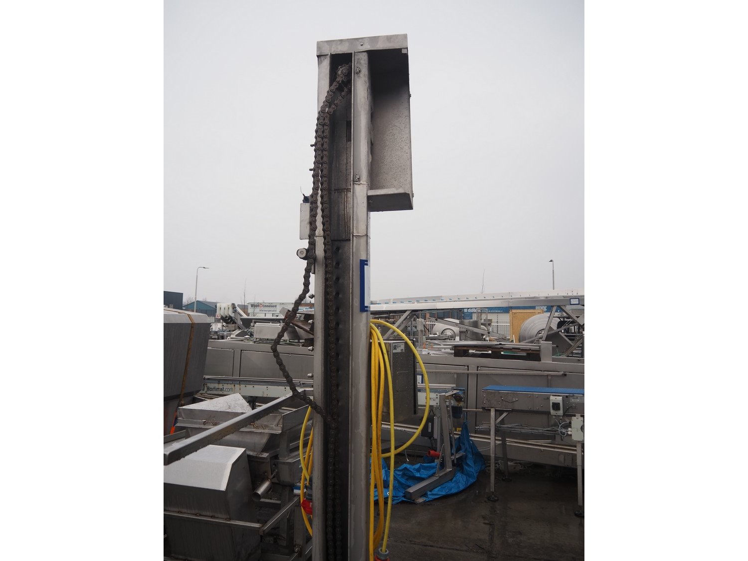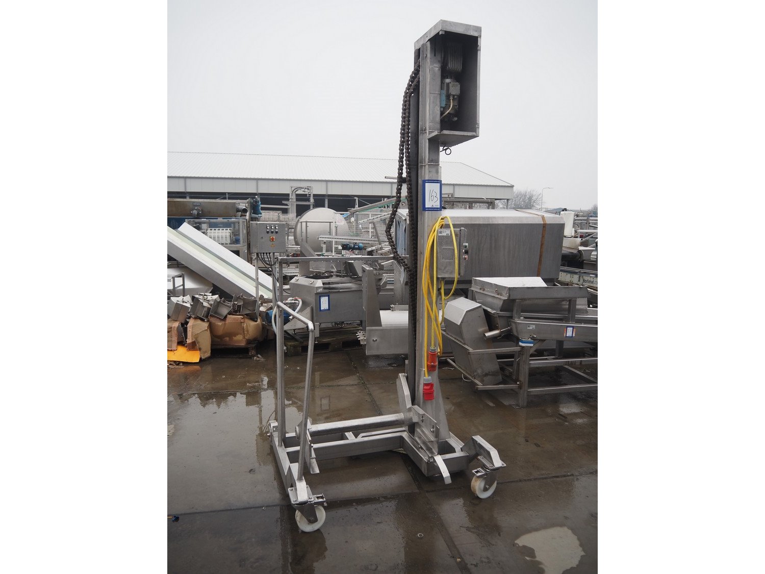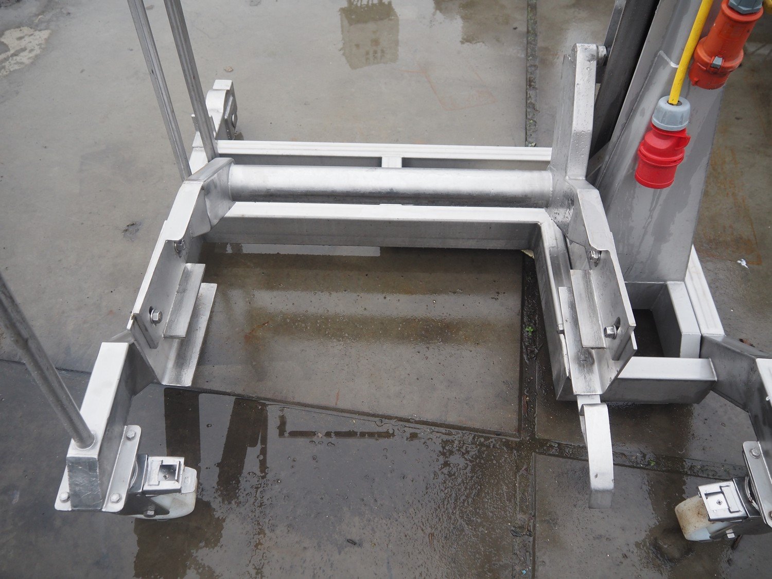 Lifter for 200 liter meat bins, dimensions: 1200 mm x 1240 mm x 2750 mm. Kavel locatie: Bedrijfsweg 7, 8304 AA Emmeloord, Nederland