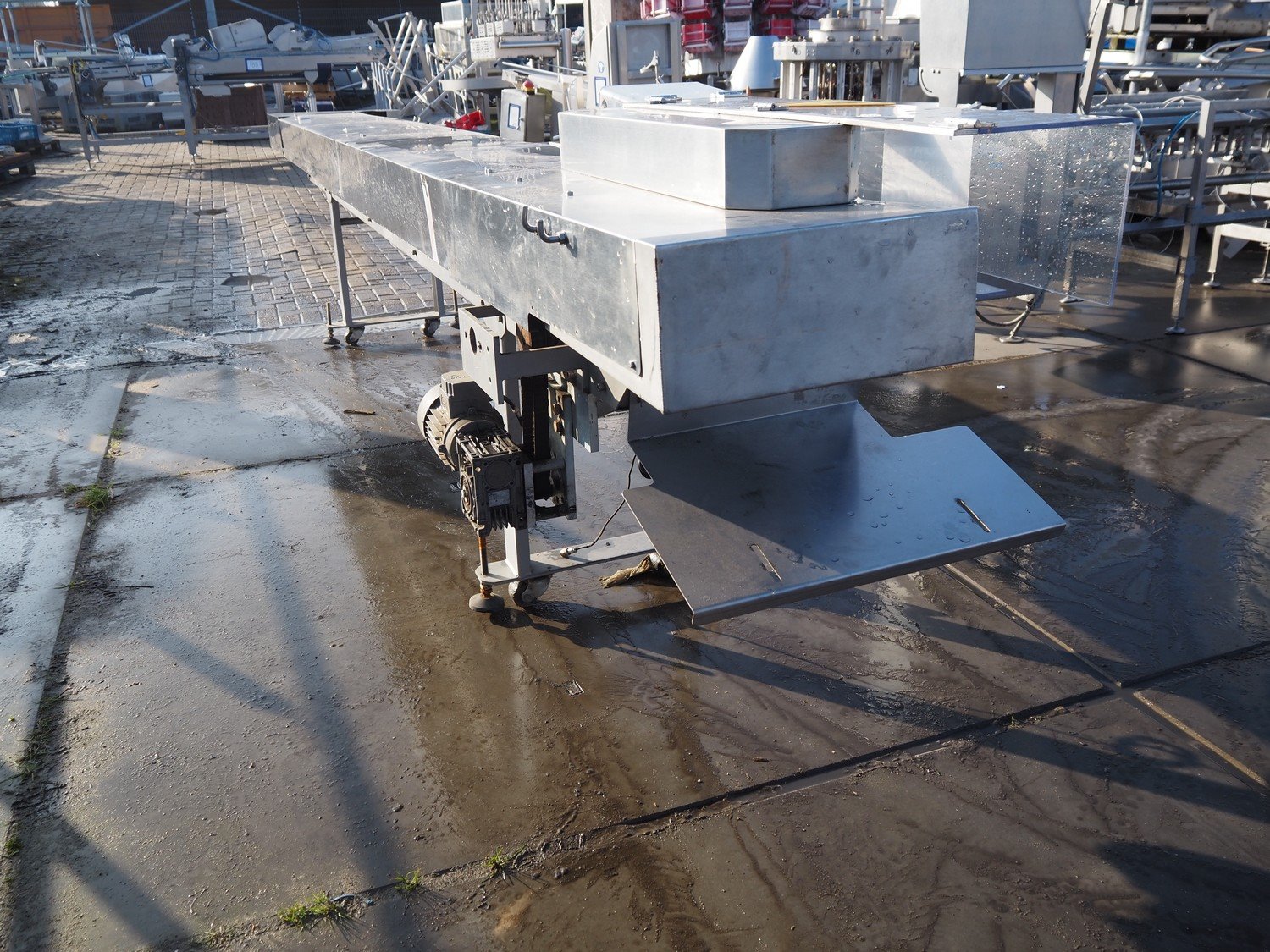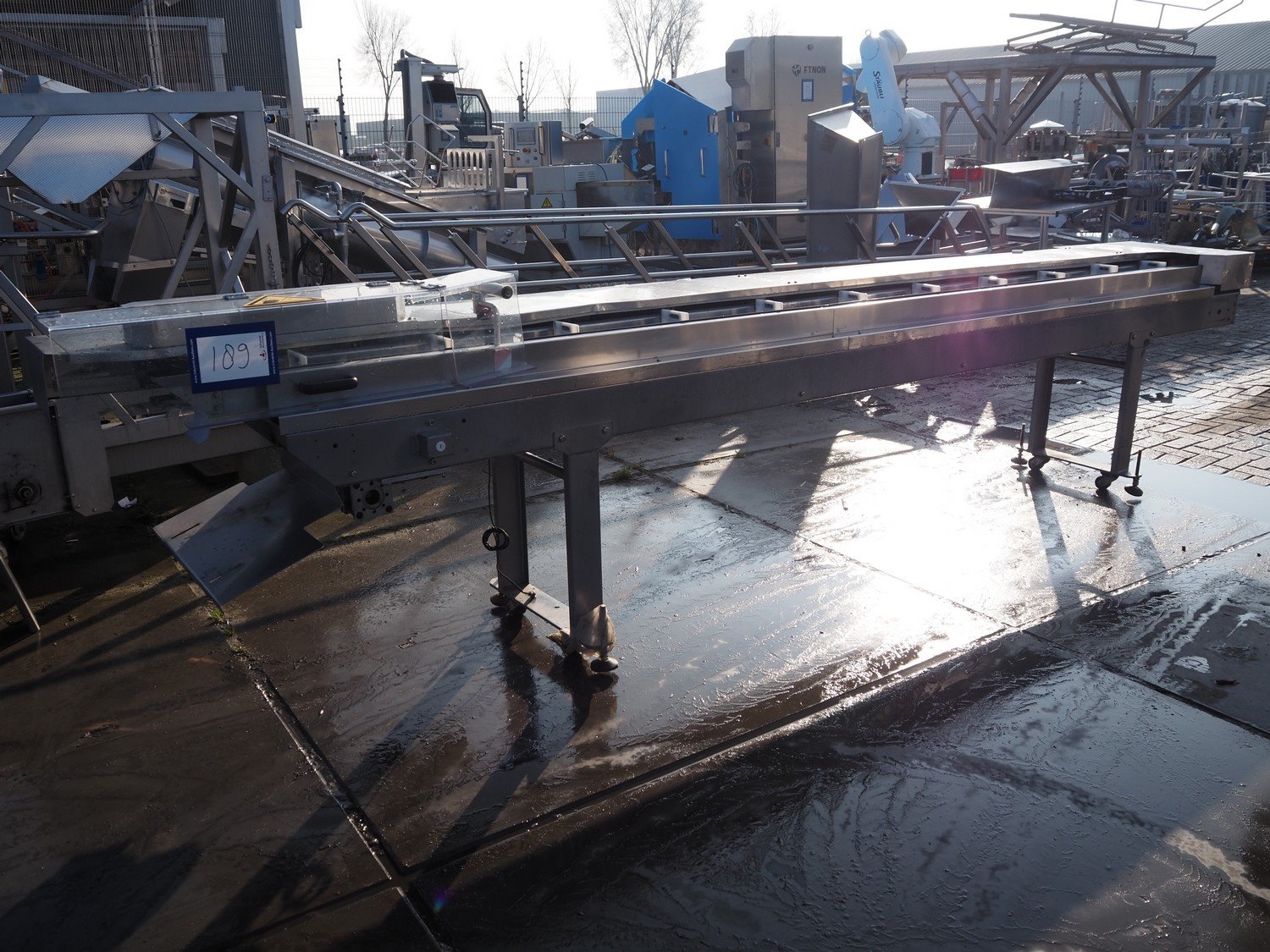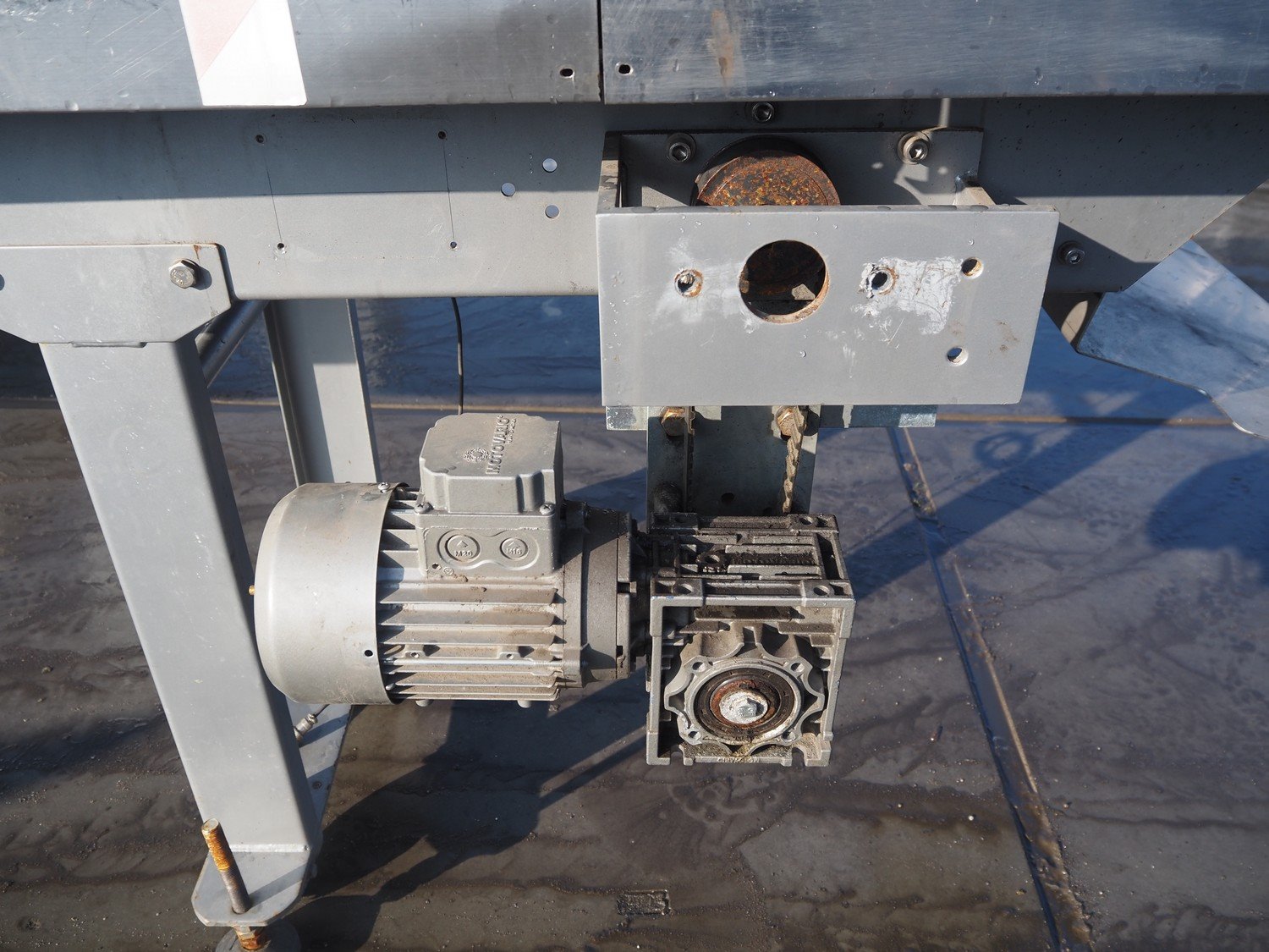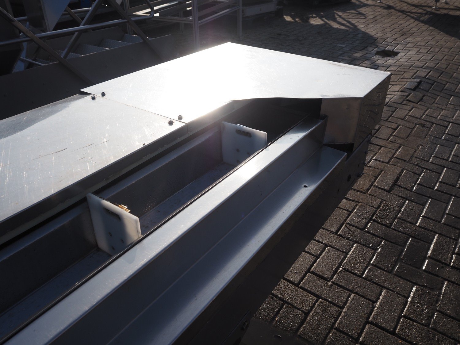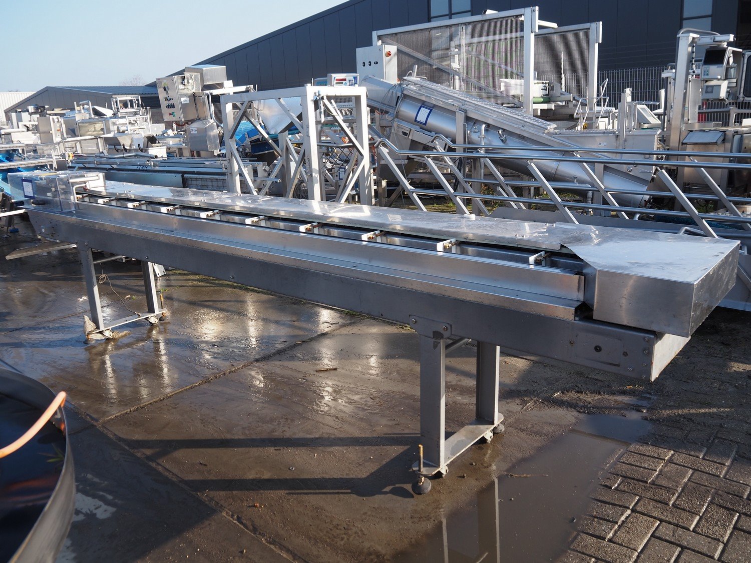 Transport belt, plastic belt, distance between dividers: 125 mm x 125 mm x 380 mm, total dimensions: 4920 mm x 620 mm x 1140 mm. Kavel locatie: Bedrijfsweg 7, 8304 AA Emmeloord, Nederland