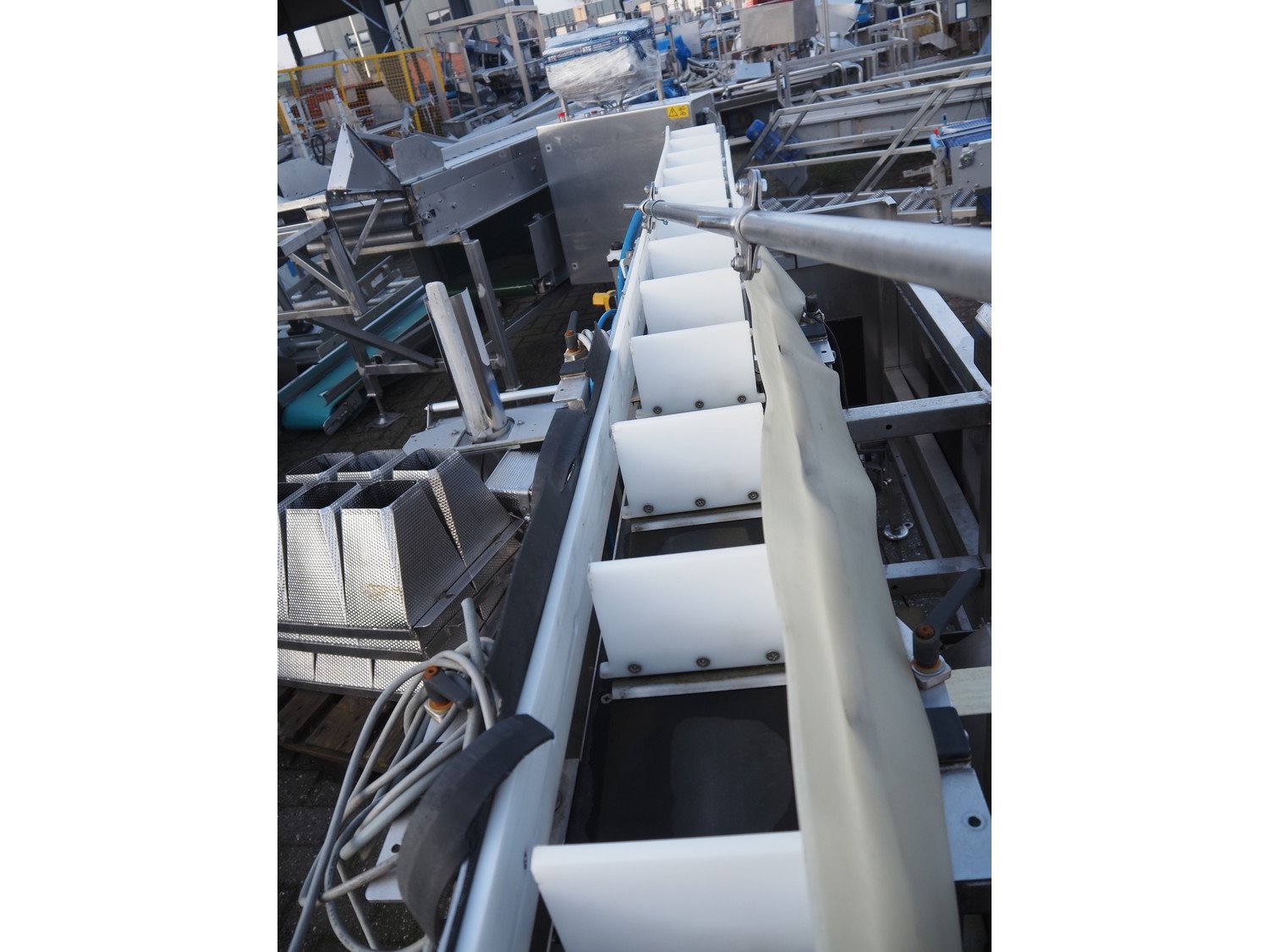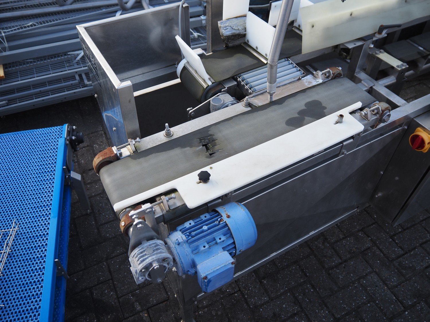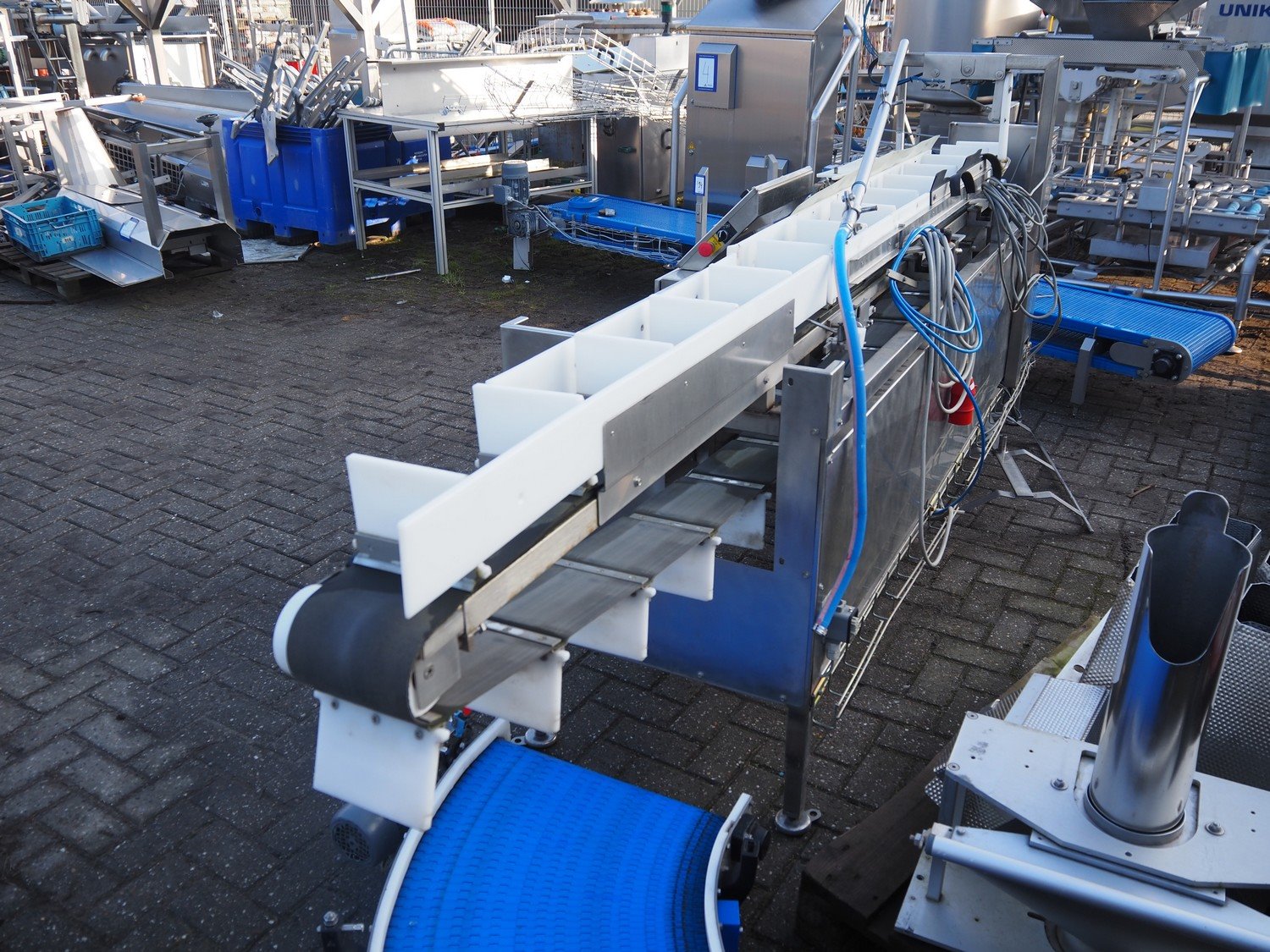 Newtec tray filler, type: NBM61, number: 8581, year of construction: 2007, 400 V, 3 Ph, 3 A, 0.6 kW, plastic belt with dividers, plastic belt, belt width: 150 mm, divider height: 120 mm, distance between dividers: 220 mm, total dimensions: 3600 mm x 900 mm x 1380 mm. Technical condition unknown and incomplete. Kavel locatie: Bedrijfsweg 7, 8304 AA Emmeloord, Nederland