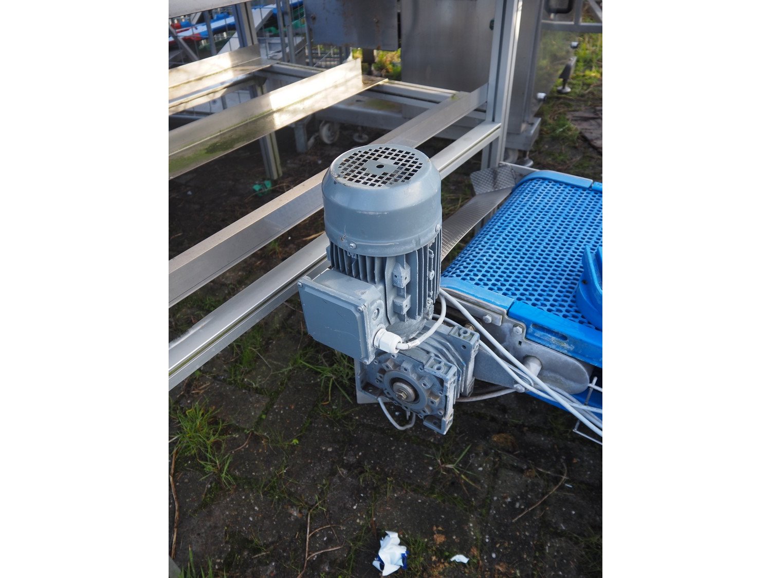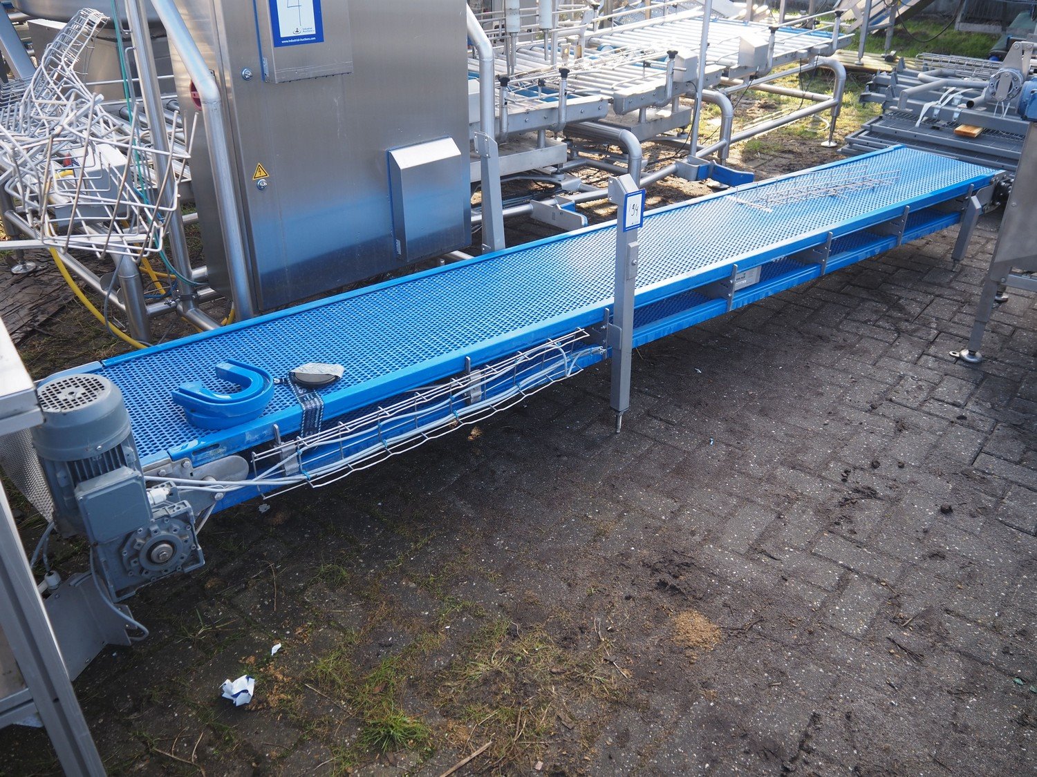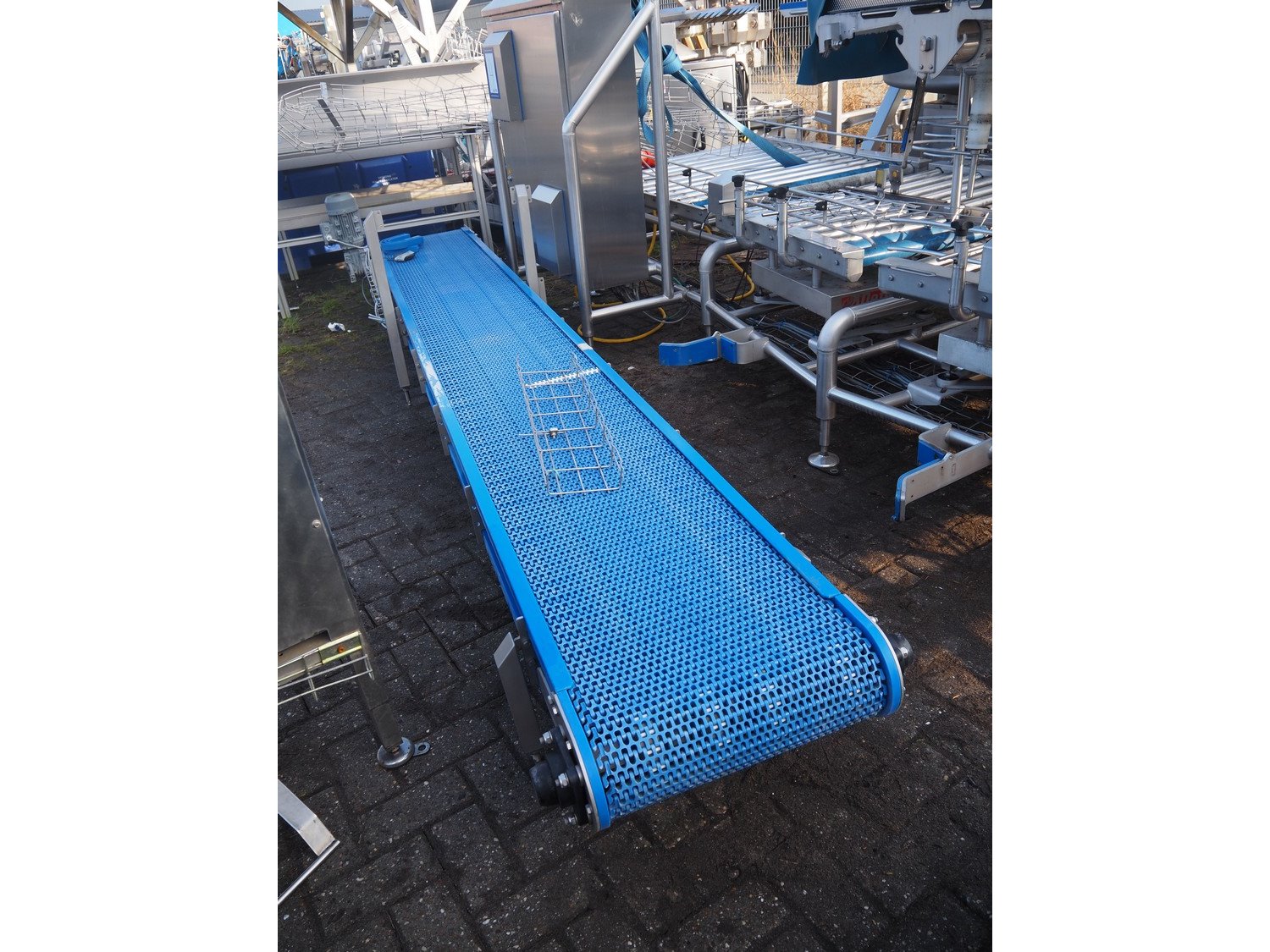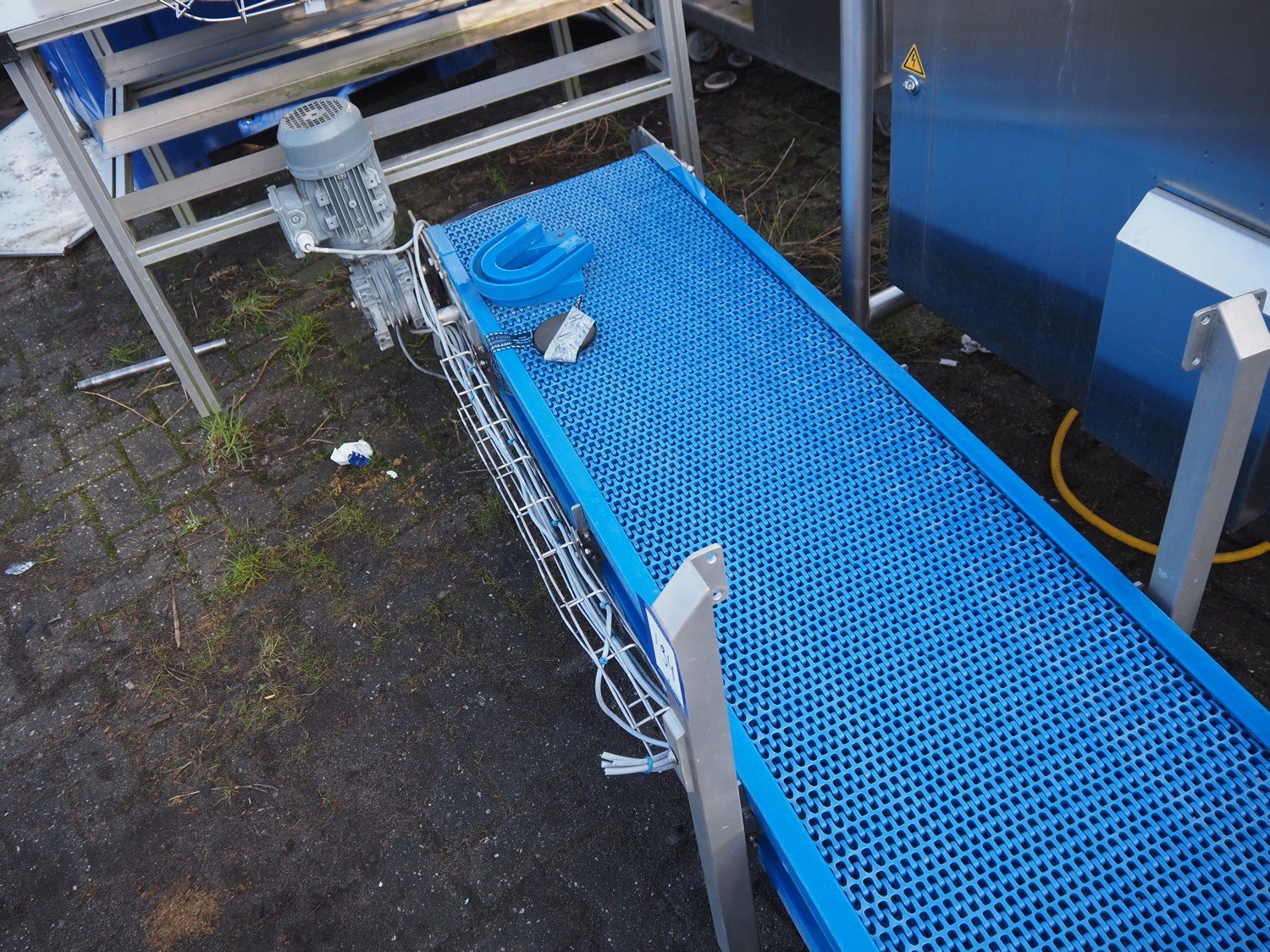 Van Rijn transport belt, plastic mesh belt, belt width: 455 mm, total dimensions: 3800 mm x 840 mm x 760 mm. Kavel locatie: Bedrijfsweg 7, 8304 AA Emmeloord, Nederland