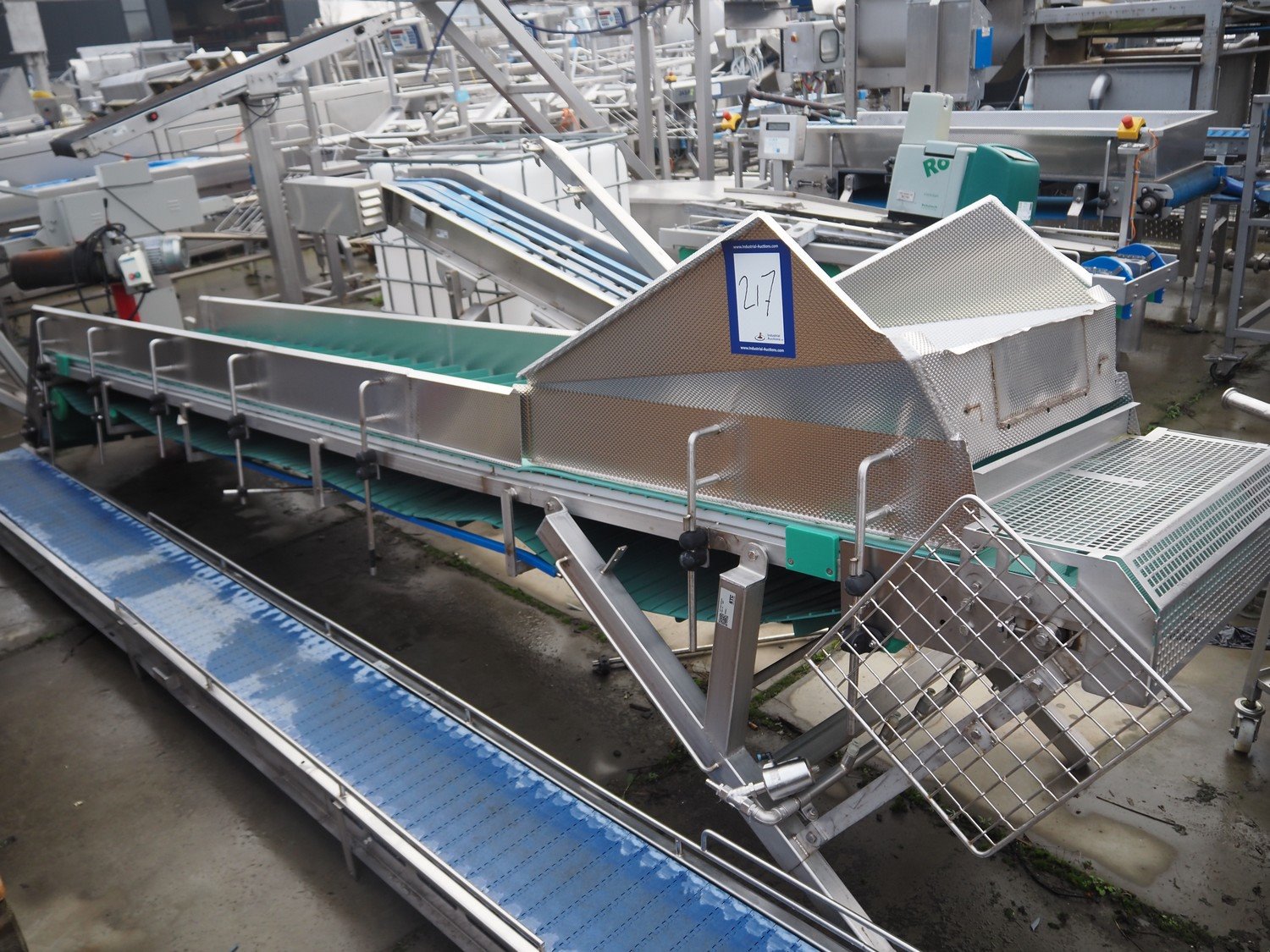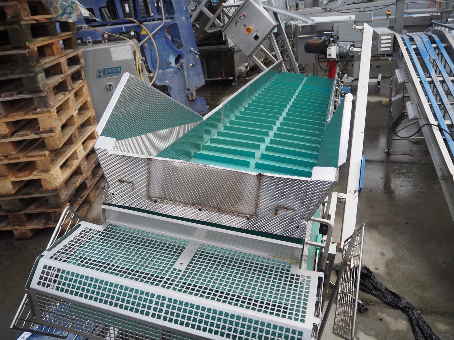 Transport belt, plastic belt, belt width: 305 mm, distance between dividers: 140 mm, divider height: 40 mm, total dimensions: 4830 mm x 1100 mm x 1400 mm. Kavel locatie: Bedrijfsweg 7, 8304 AA Emmeloord, Nederland