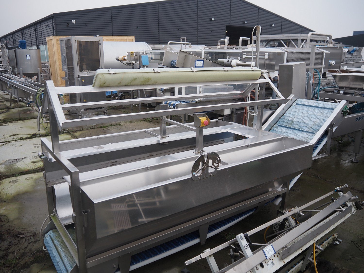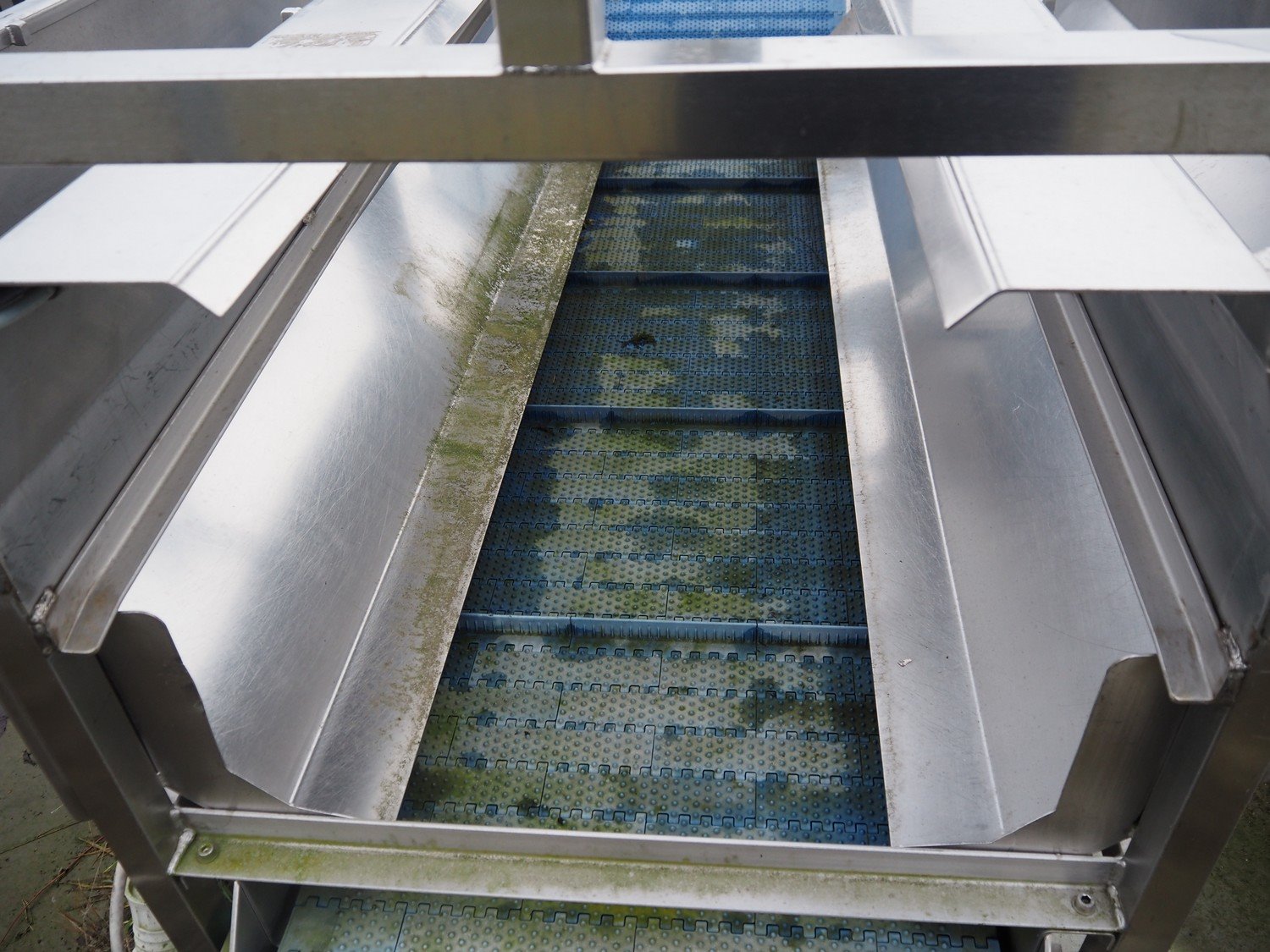 Elevating belt, plastic belt, belt width: 600 mm, distance between dividers: 400 mm, divider height: 25 mm, total dimensions: 3400 mm x 1300 mm x 1930 mm. Kavel locatie: Bedrijfsweg 7, 8304 AA Emmeloord, Nederland