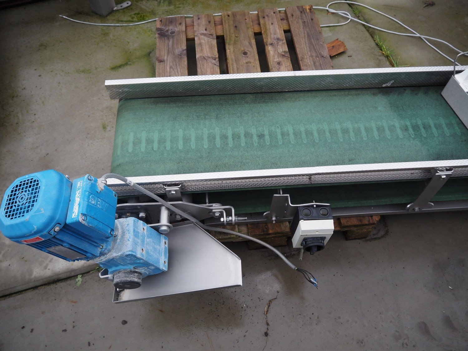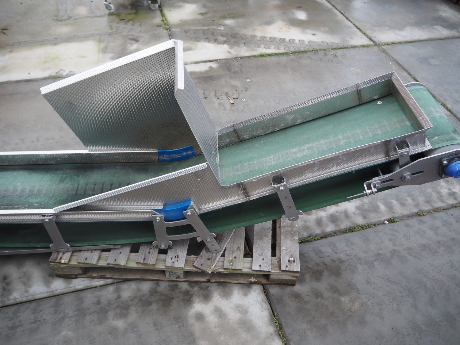 Transport belt, plastic belt, belt width: 400 mm, total dimensions: 10600 mm x 750 mm x 920 mm. Kavel locatie: Bedrijfsweg 7, 8304 AA Emmeloord, Nederland