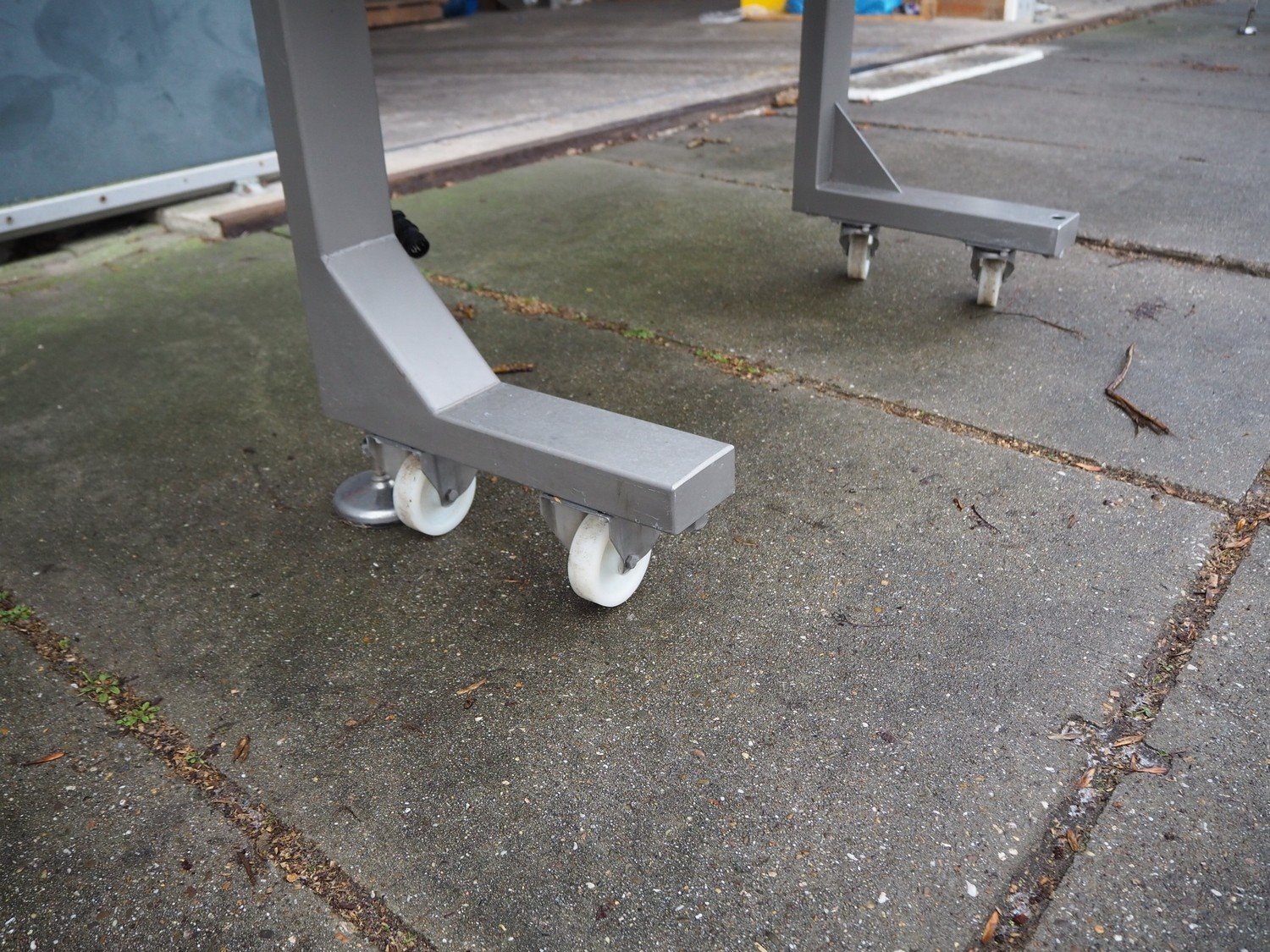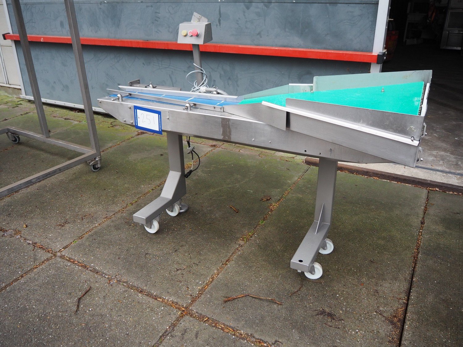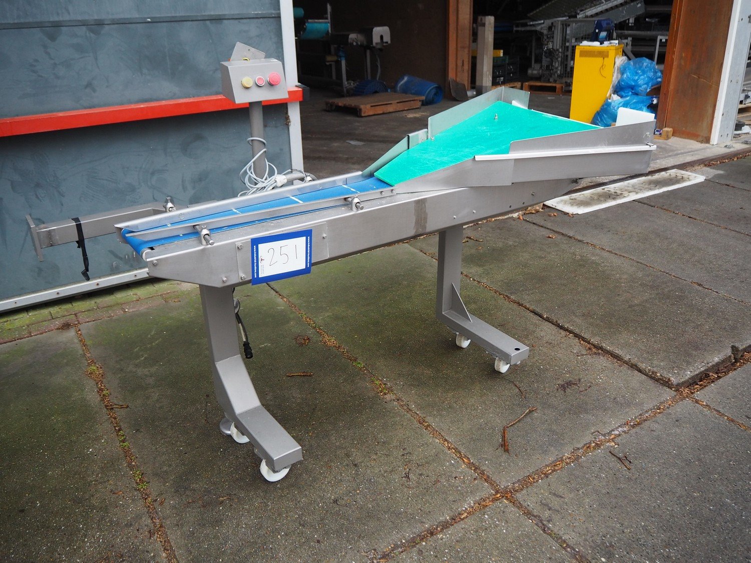 Mobile transport belt with s/s frame, belt width: 200 mm, total dimensions: 2050 mm x 850 mm x 1350 mm. Kavel locatie: Domineesweg 26, 8321 DZ Urk, Nederland