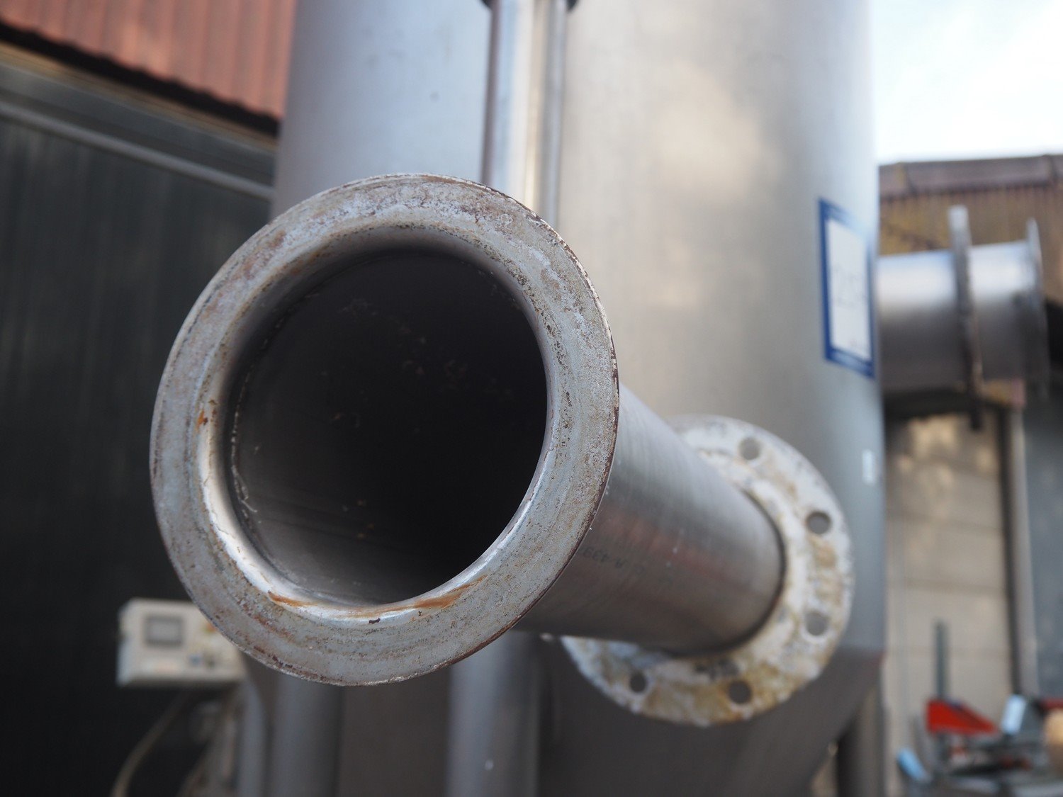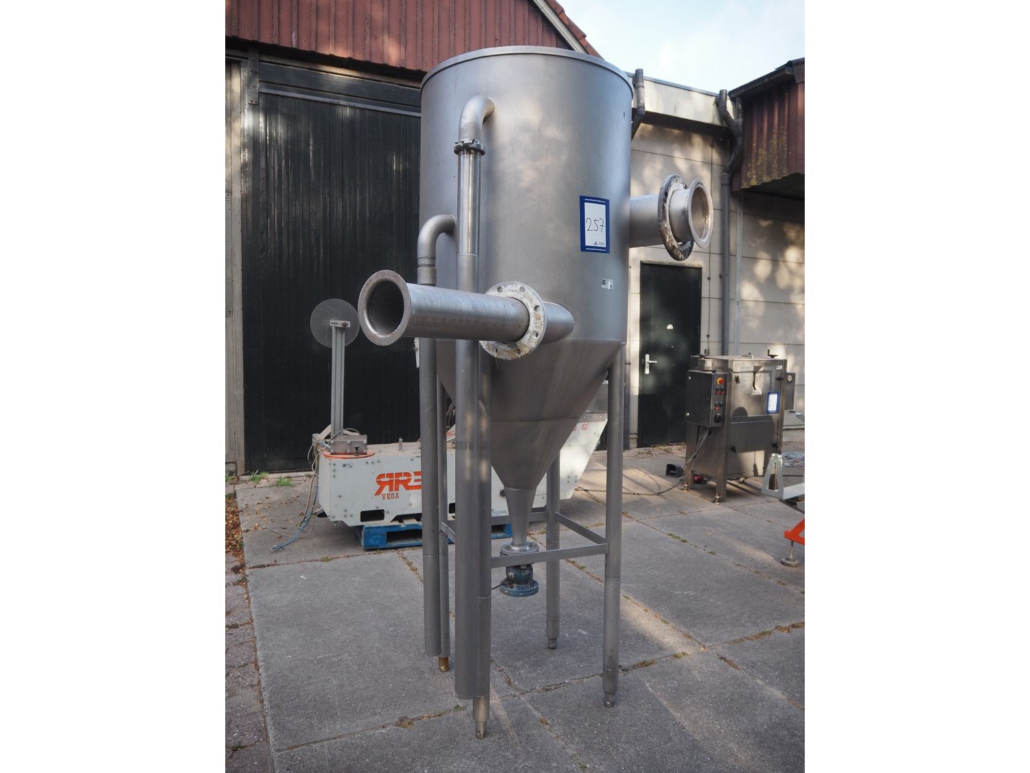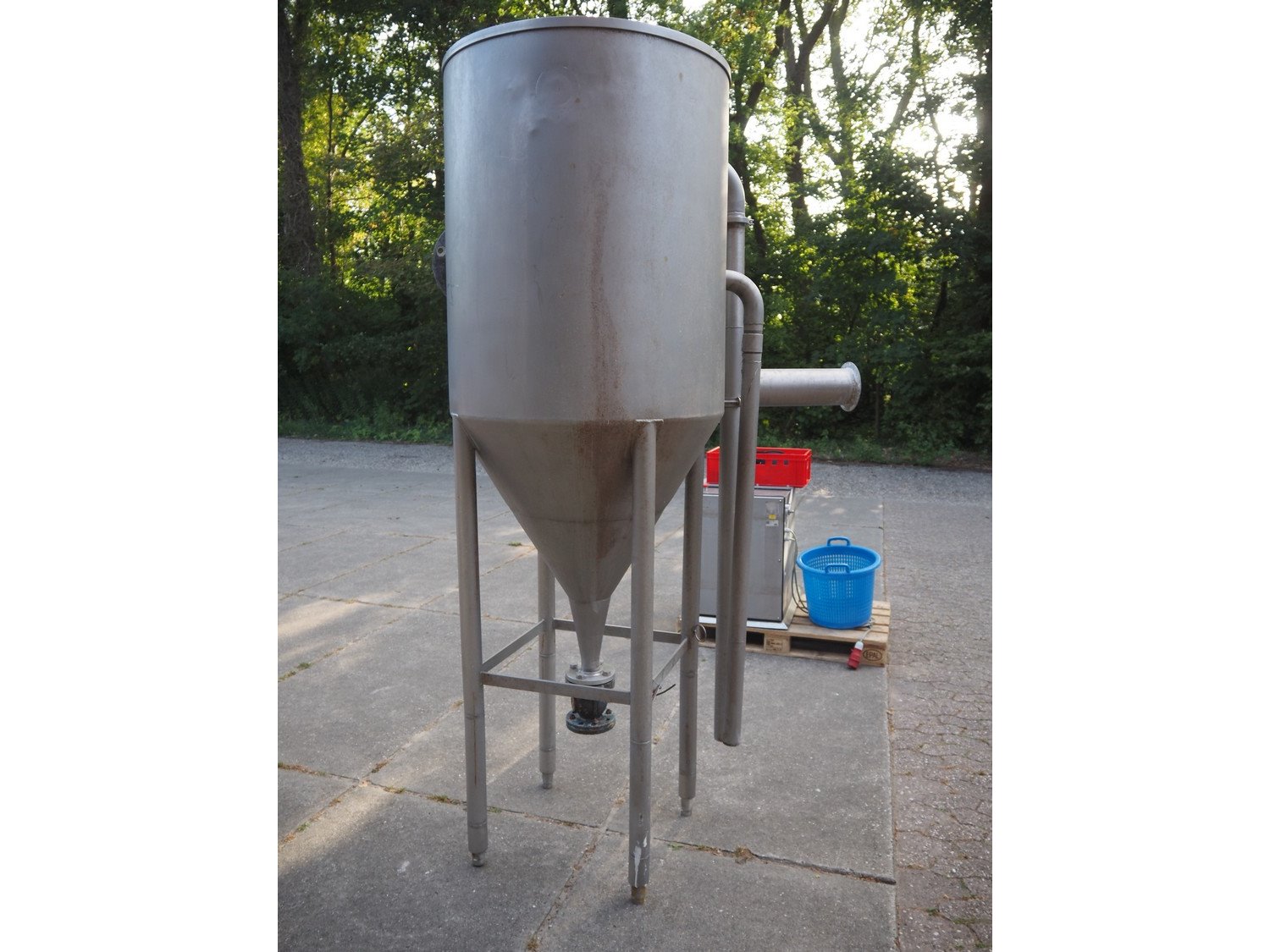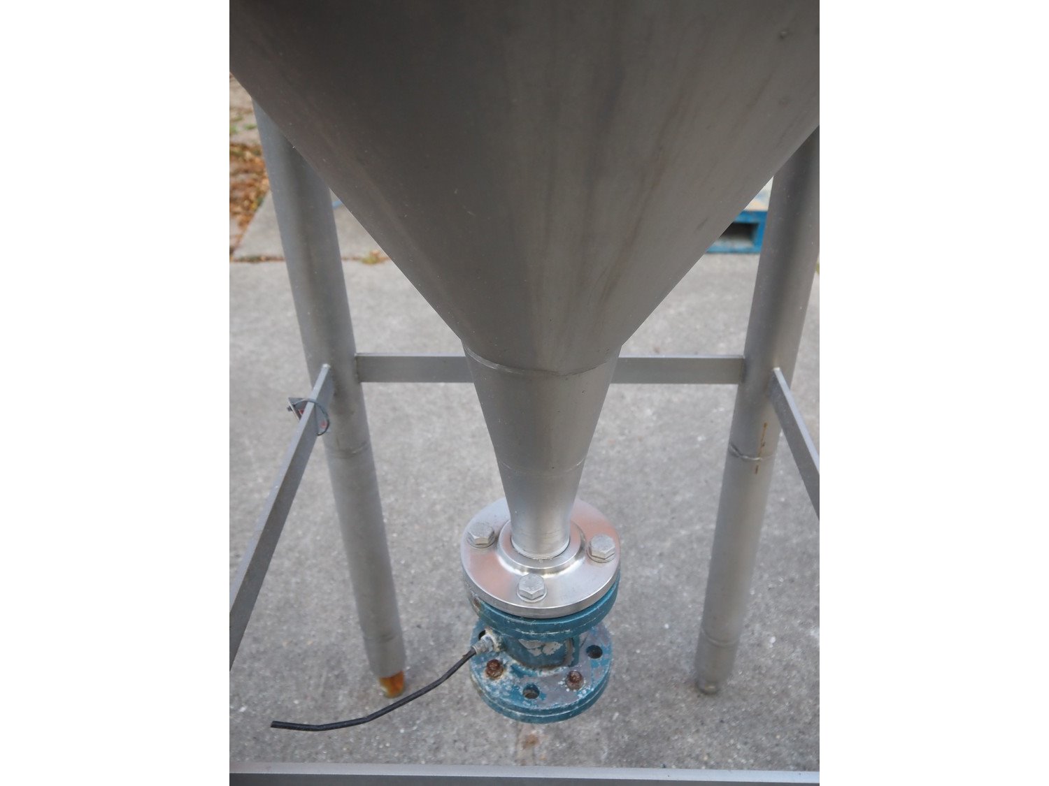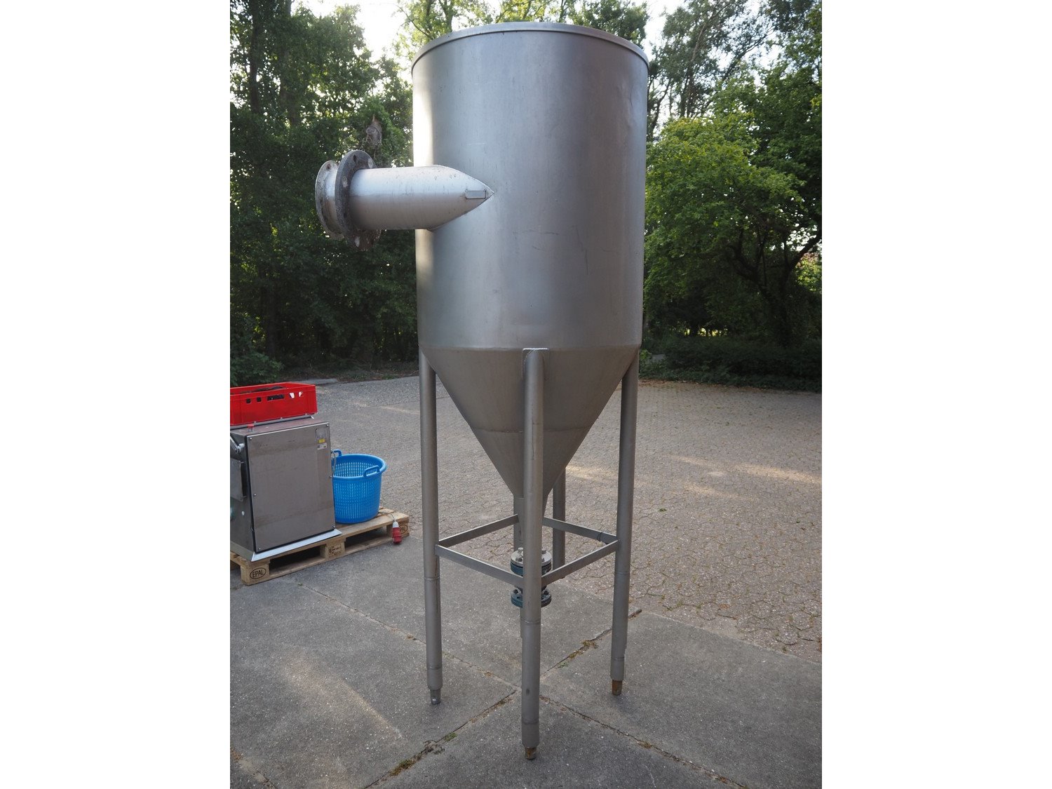 S/s silo, number: 5050, infeed pipe: Ø 200 mm and Ø 135 mm, Ø funnel: 845 mm, depth: 2050 mm, total dimensions: 1530 mm x 1120 mm x 2480 mm. Kavel locatie: Domineesweg 26, 8321 DZ Urk, Nederland