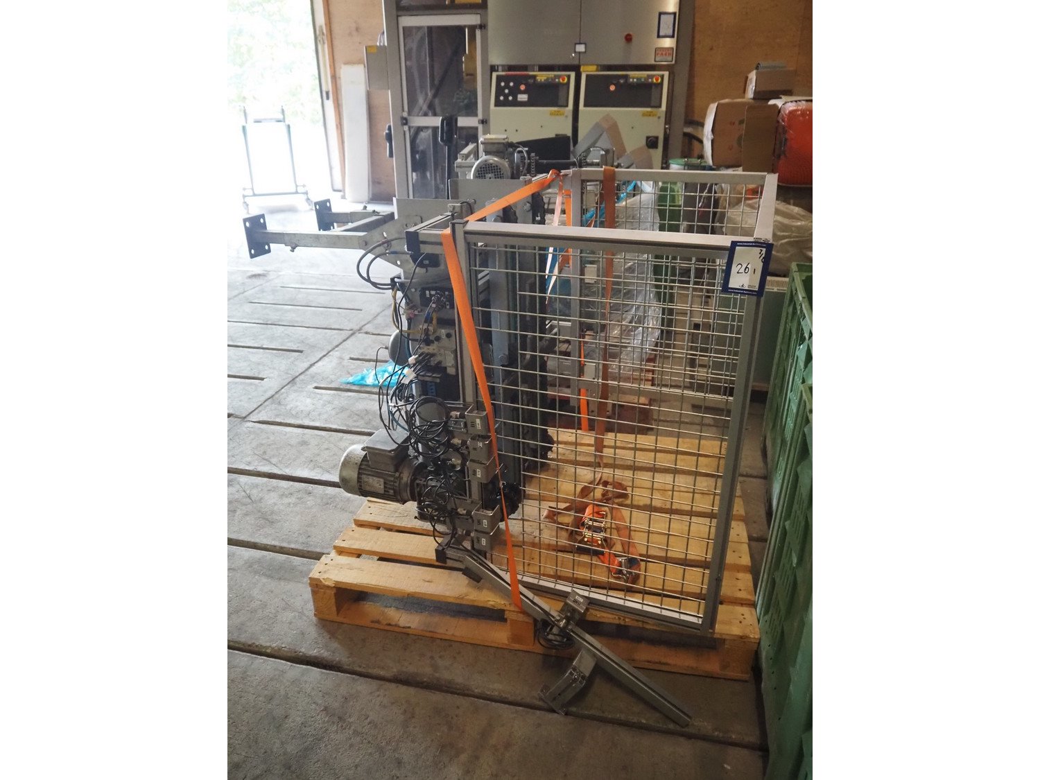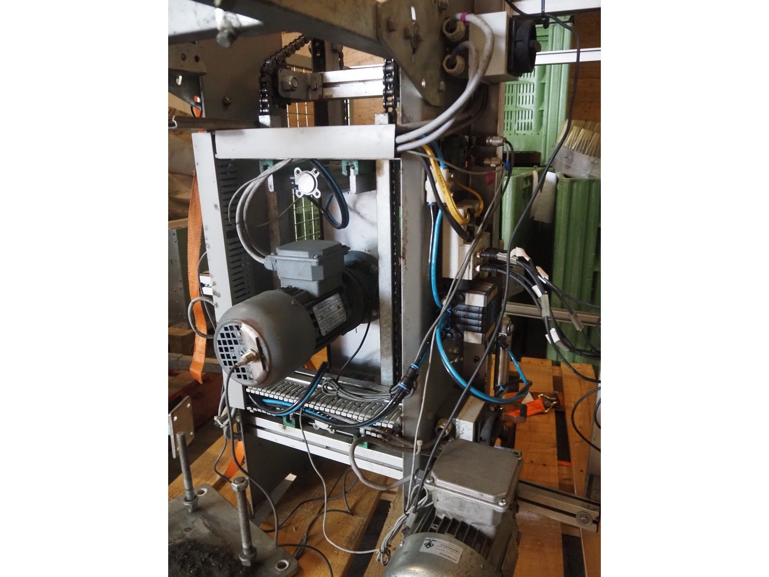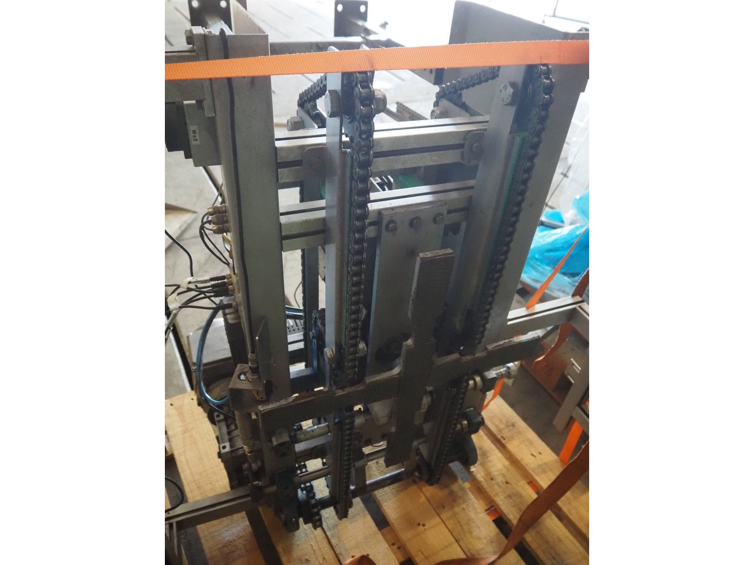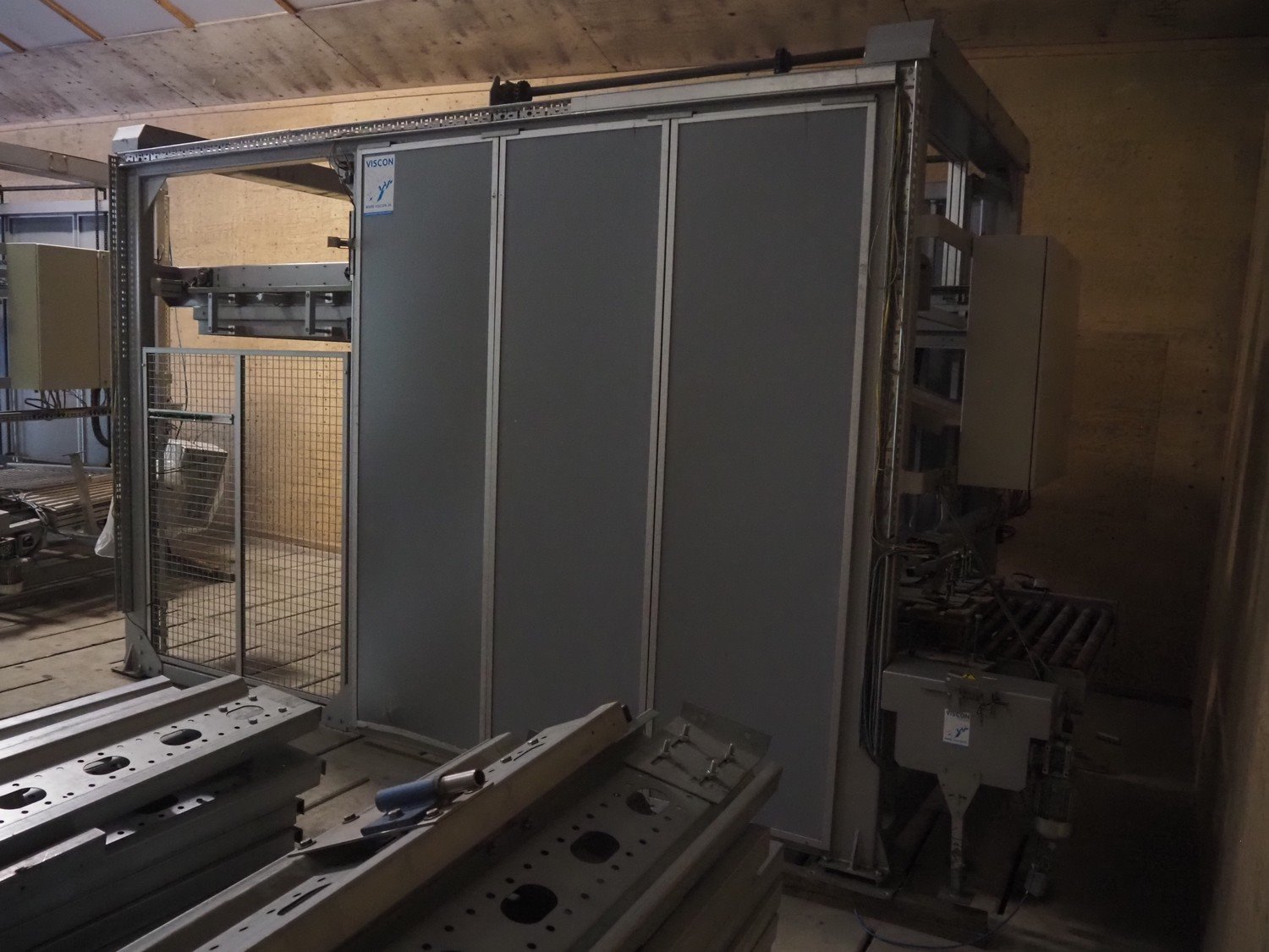 Viscon palletizer, s/s rollers, roller width: 1270 mm, total dimensions: 5300 mm x 2400 mm x 3200 mm. Including turning device, steel chain belt, belt width: 250 mm, dimensions turning device: 1450 mm x 950 mm x 1150 mm. Kavel locatie: Domineesweg 26, 8321 DZ Urk, Nederland