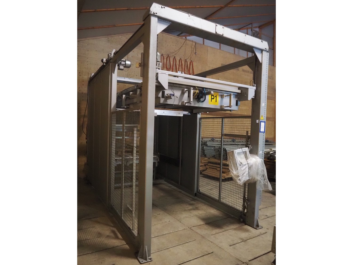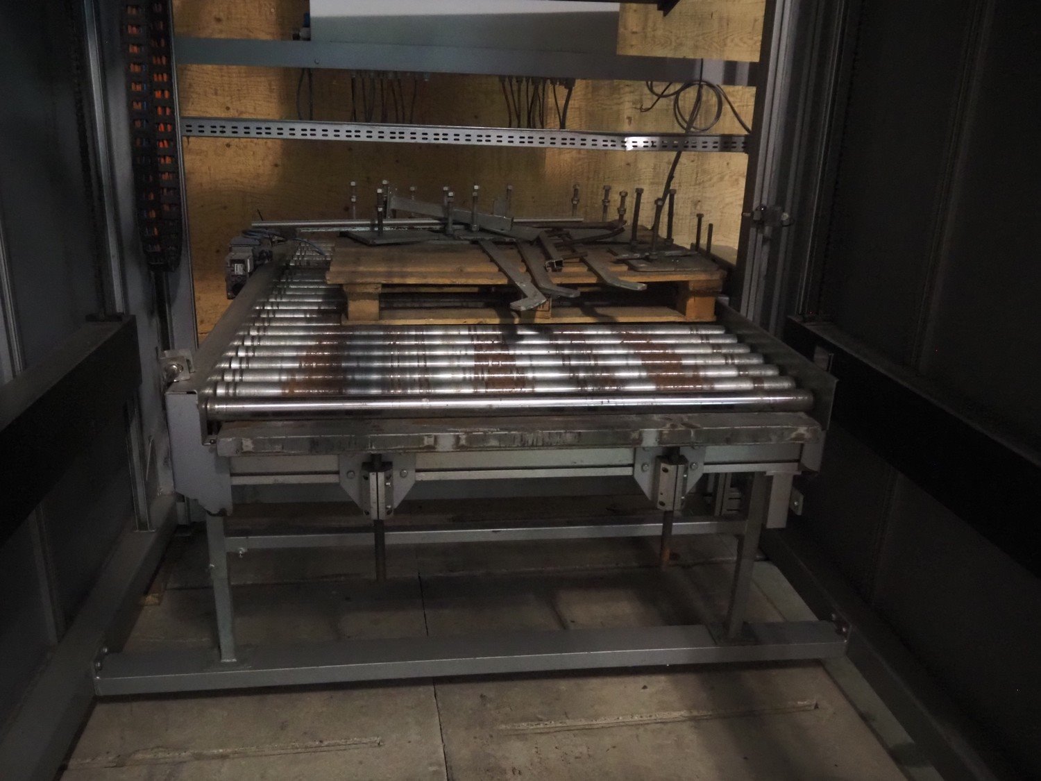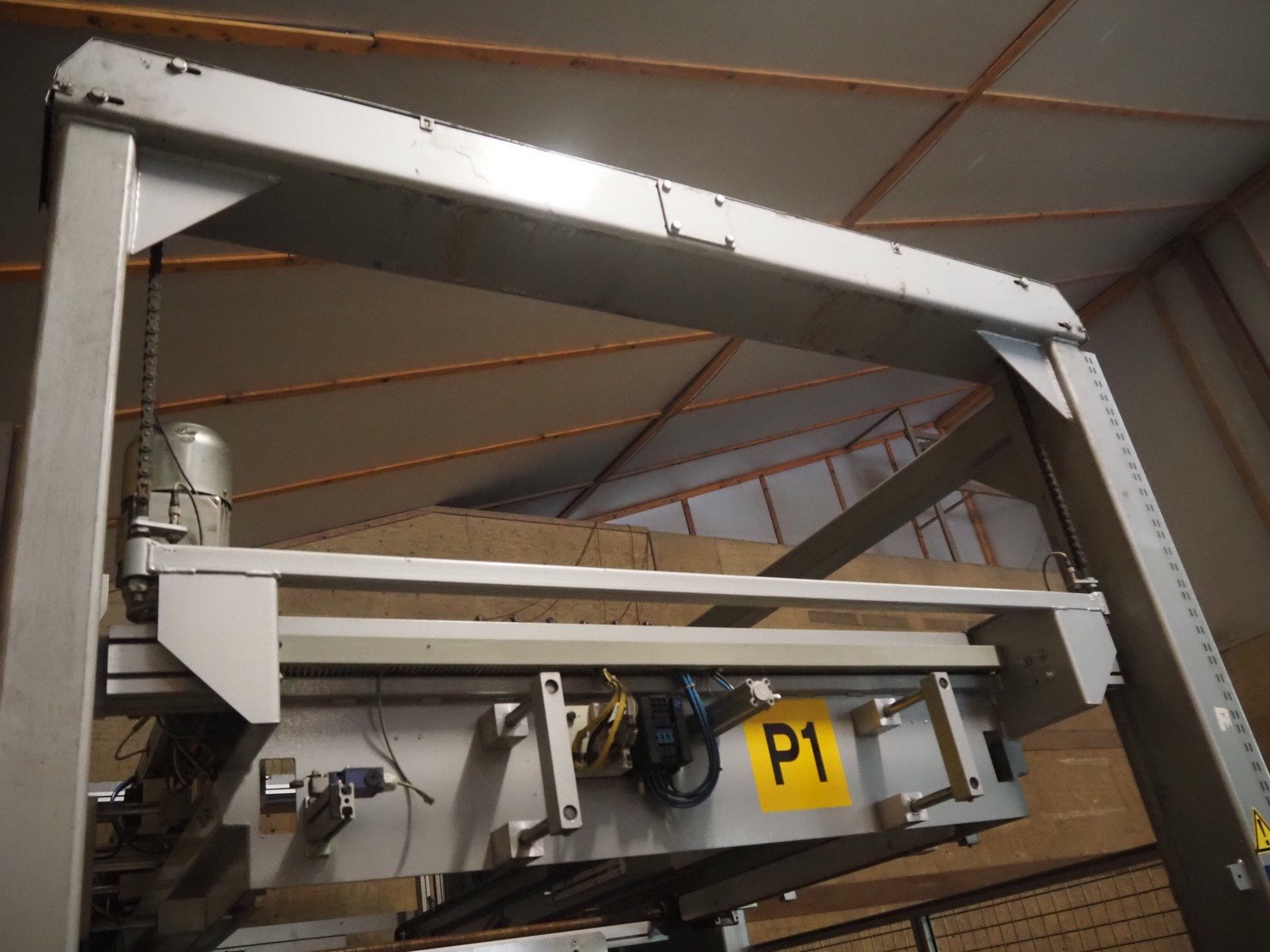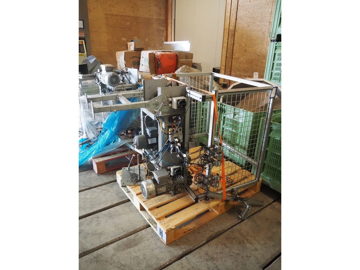 Viscon palletizer, s/s rollers, roller width: 1270 mm, total dimensions: 5300 mm x 2400 mm x 3200 mm. Including turning device, steel chain belt, belt width: 250 mm, dimensions turning device: 1450 mm x 950 mm x 1150 mm. Kavel locatie: Domineesweg 26, 8321 DZ Urk, Nederland