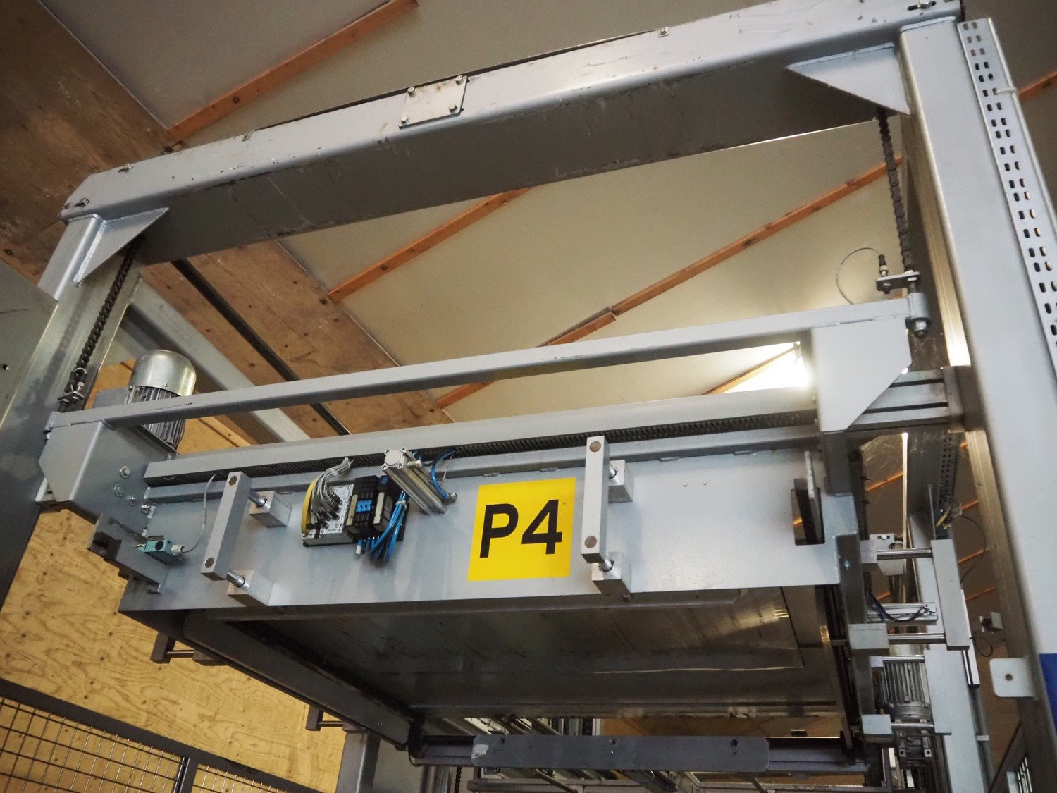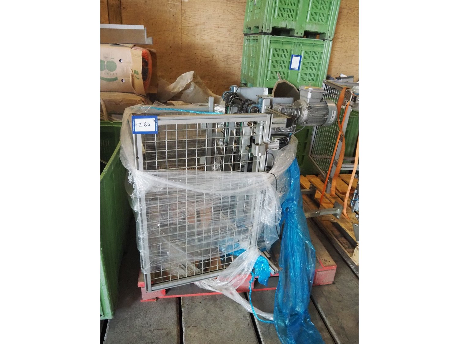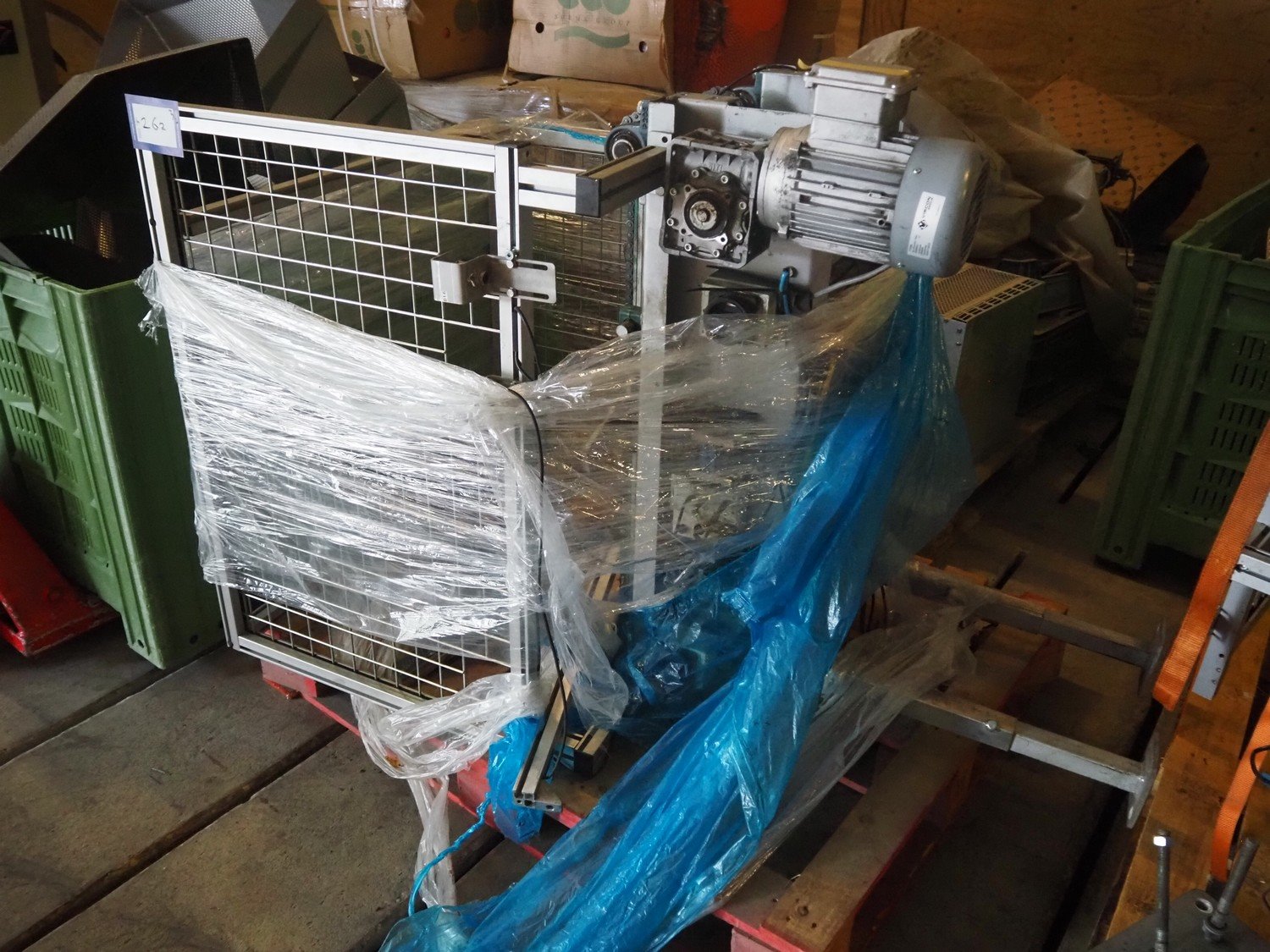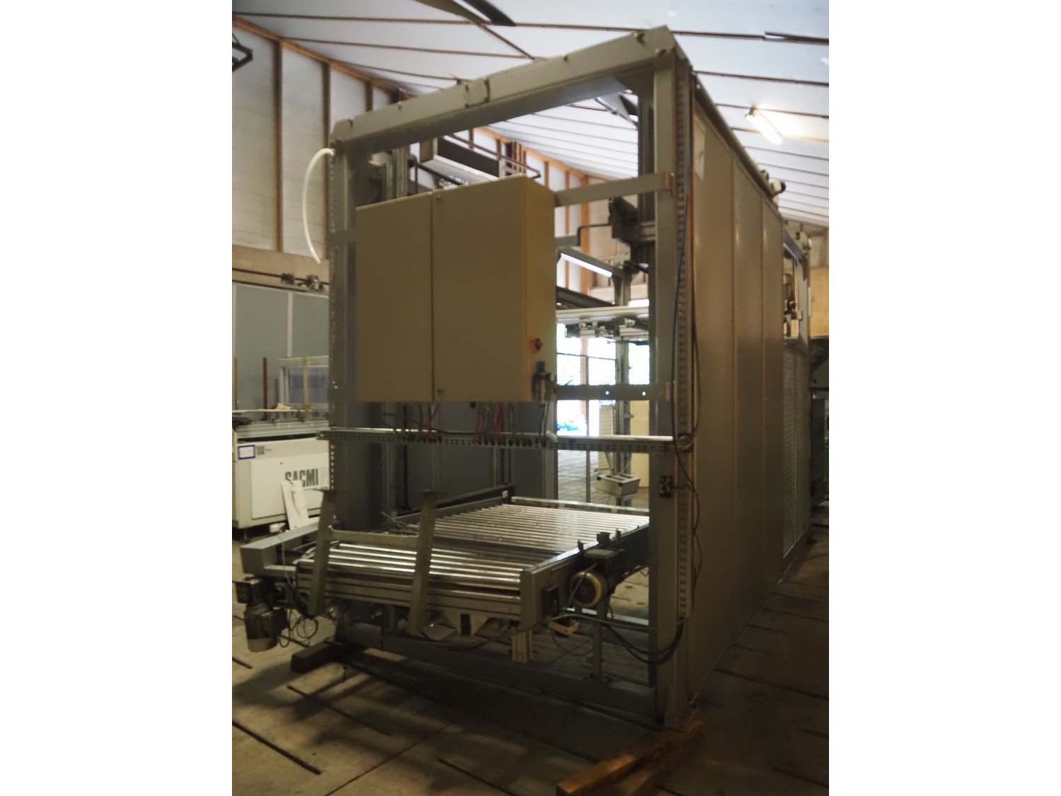 Viscon palletizer, s/s rollers, roller width: 1270 mm, total dimensions: 5300 mm x 2400 mm x 3200 mm. Including turning device, steel chain belt, belt width: 250 mm, dimensions turning device: 1450 mm x 950 mm x 1150 mm. Kavel locatie: Domineesweg 26, 8321 DZ Urk, Nederland