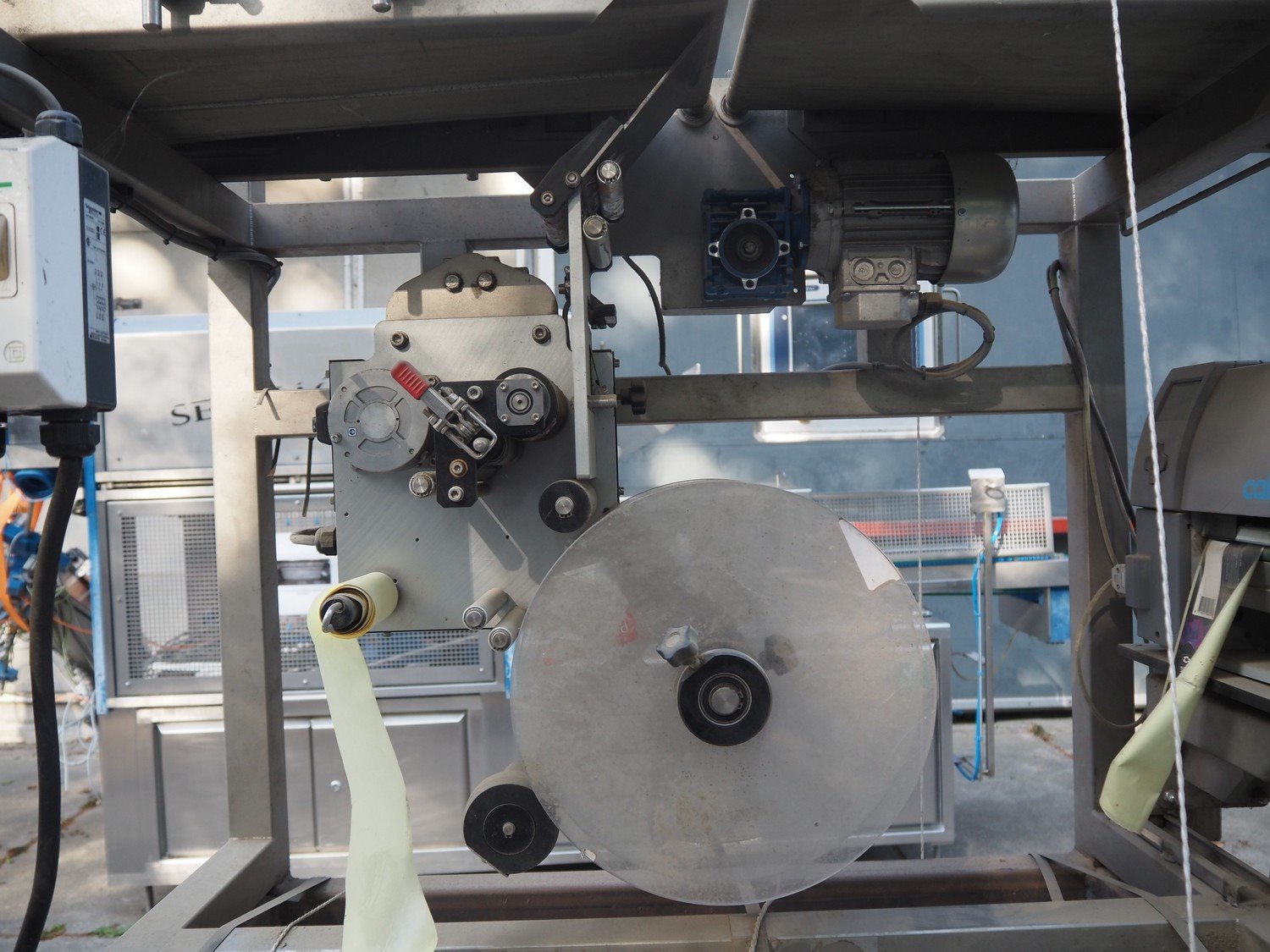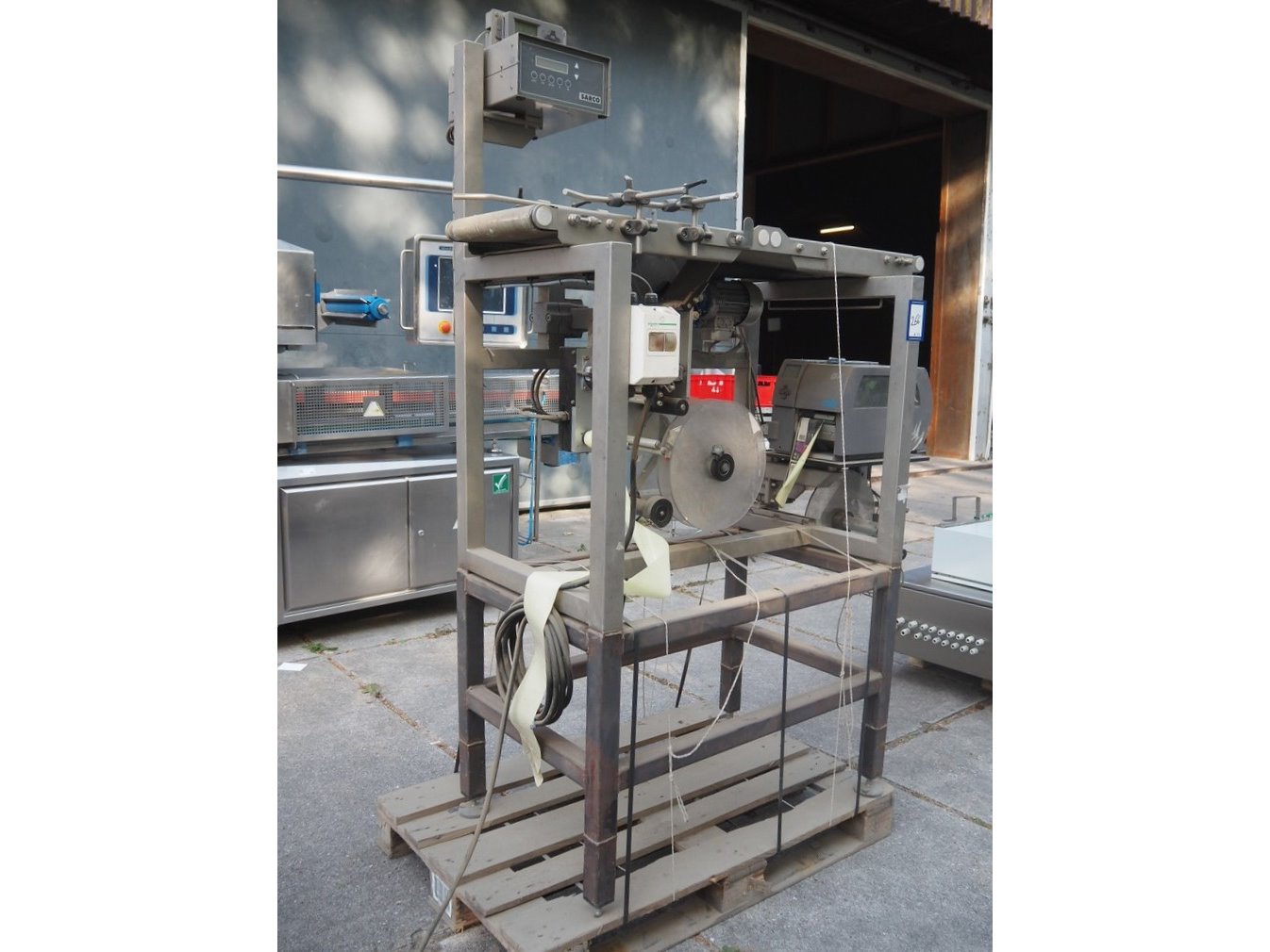 Labelling machine, plastic belt, belt width: 300 mm, total dimensions: 1600 mm x 800 mm x 2100 mm. Kavel locatie: Domineesweg 26, 8321 DZ Urk, Nederland