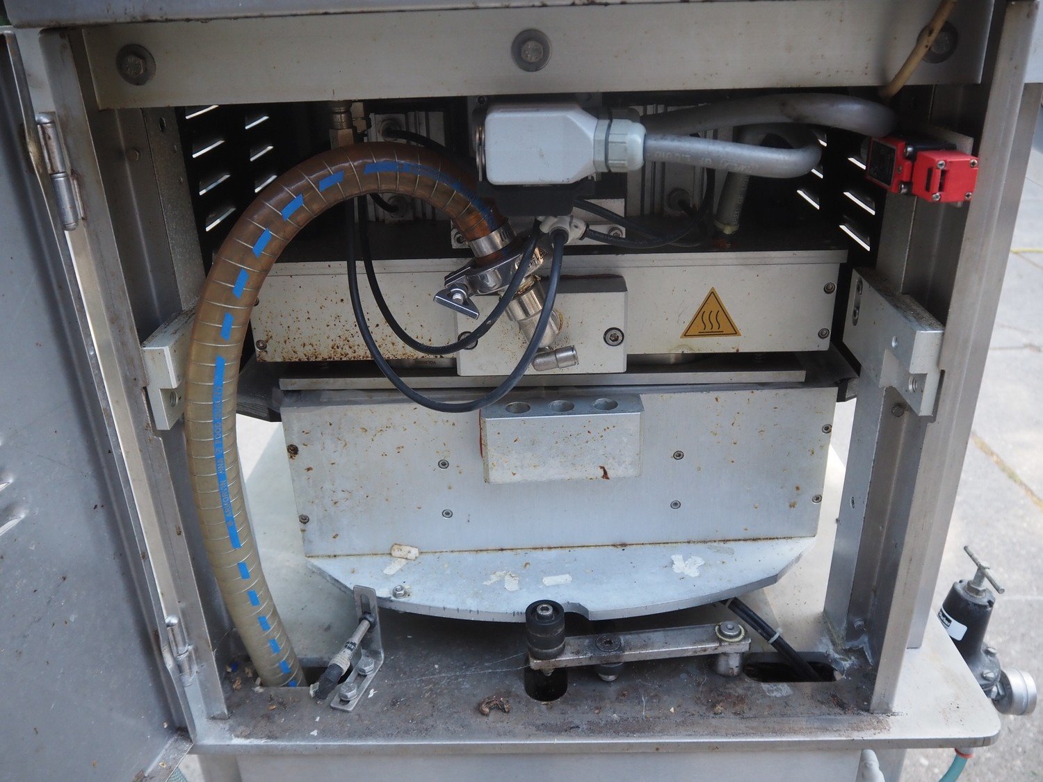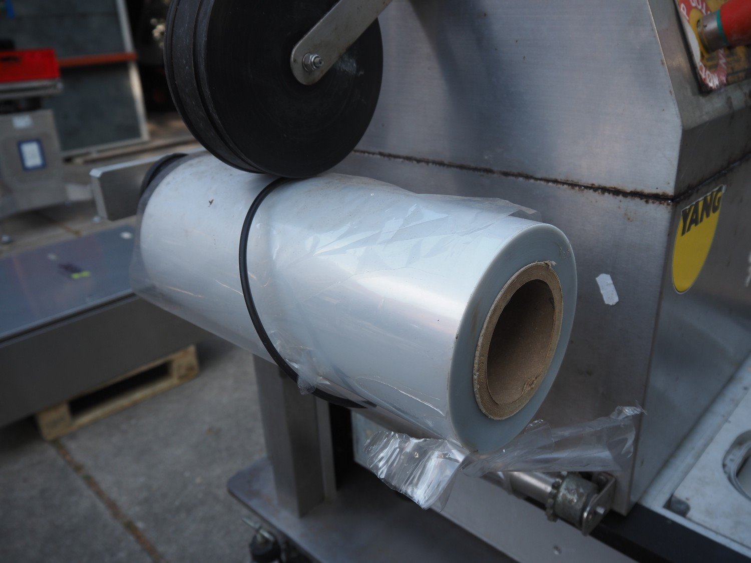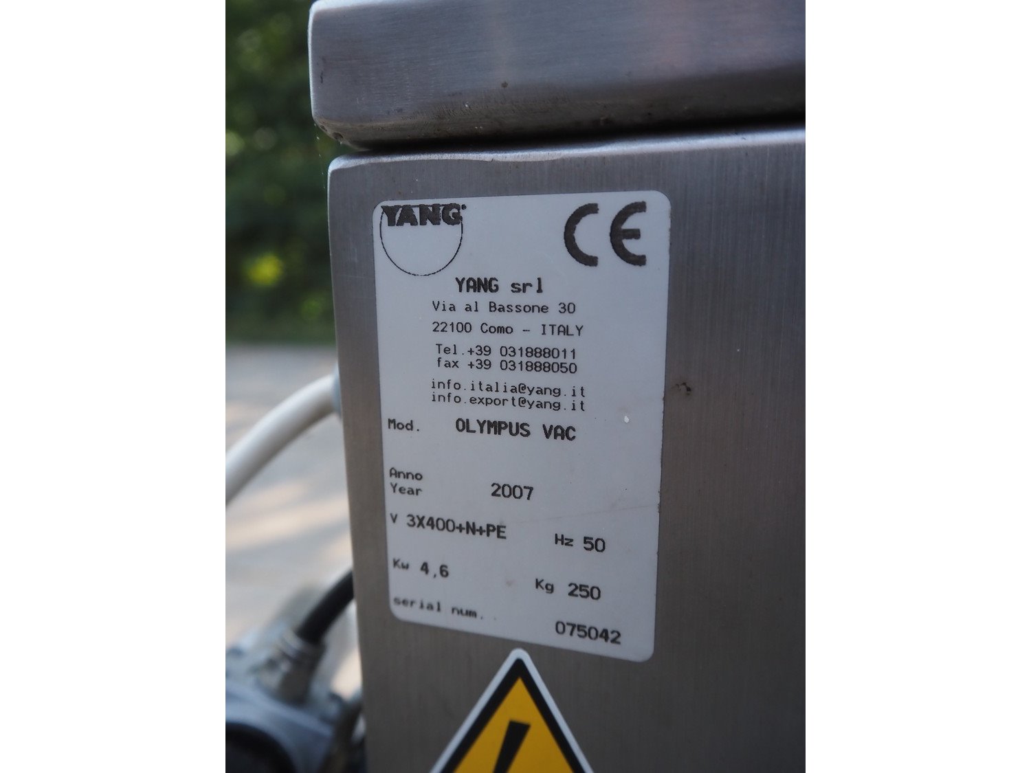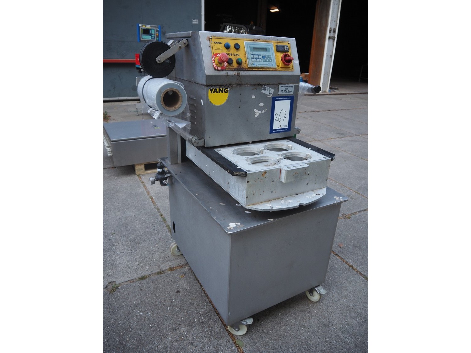 Yang srl mobile traysealer, model: OLYMPUS VAC, serial number: 075042, year of construction: 2007, 400 V, 3 Ph, 50 Hz, 4.6 kW, weight: 250 kg, dye: (4x) 120 mm x 100 mm, total dimensions: 950 mm x 720 mm x 1440 mm. Kavel locatie: Domineesweg 26, 8321 DZ Urk, Nederland