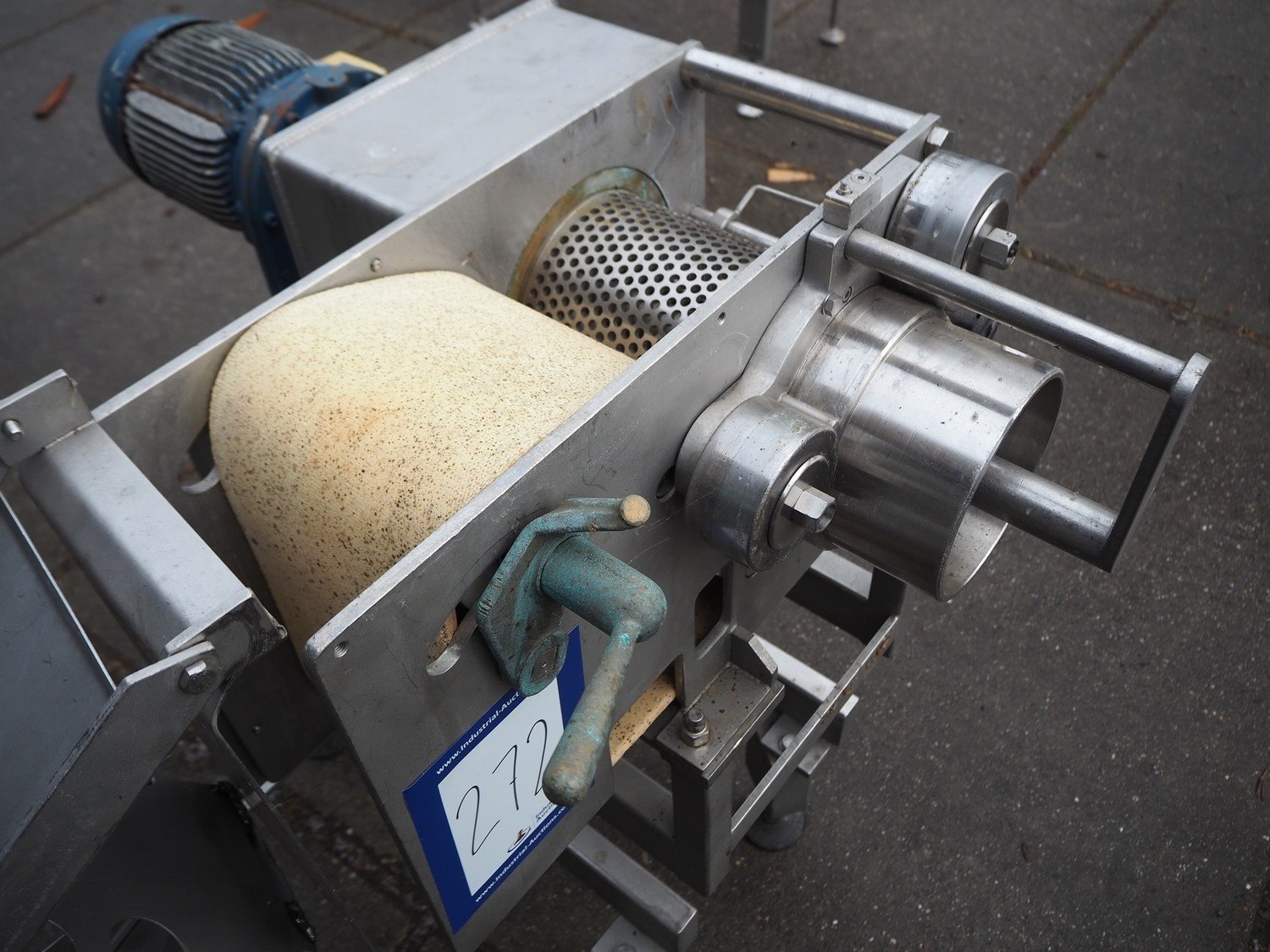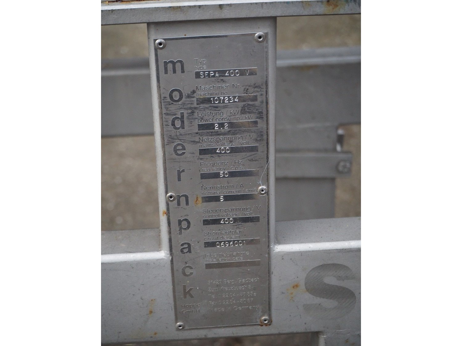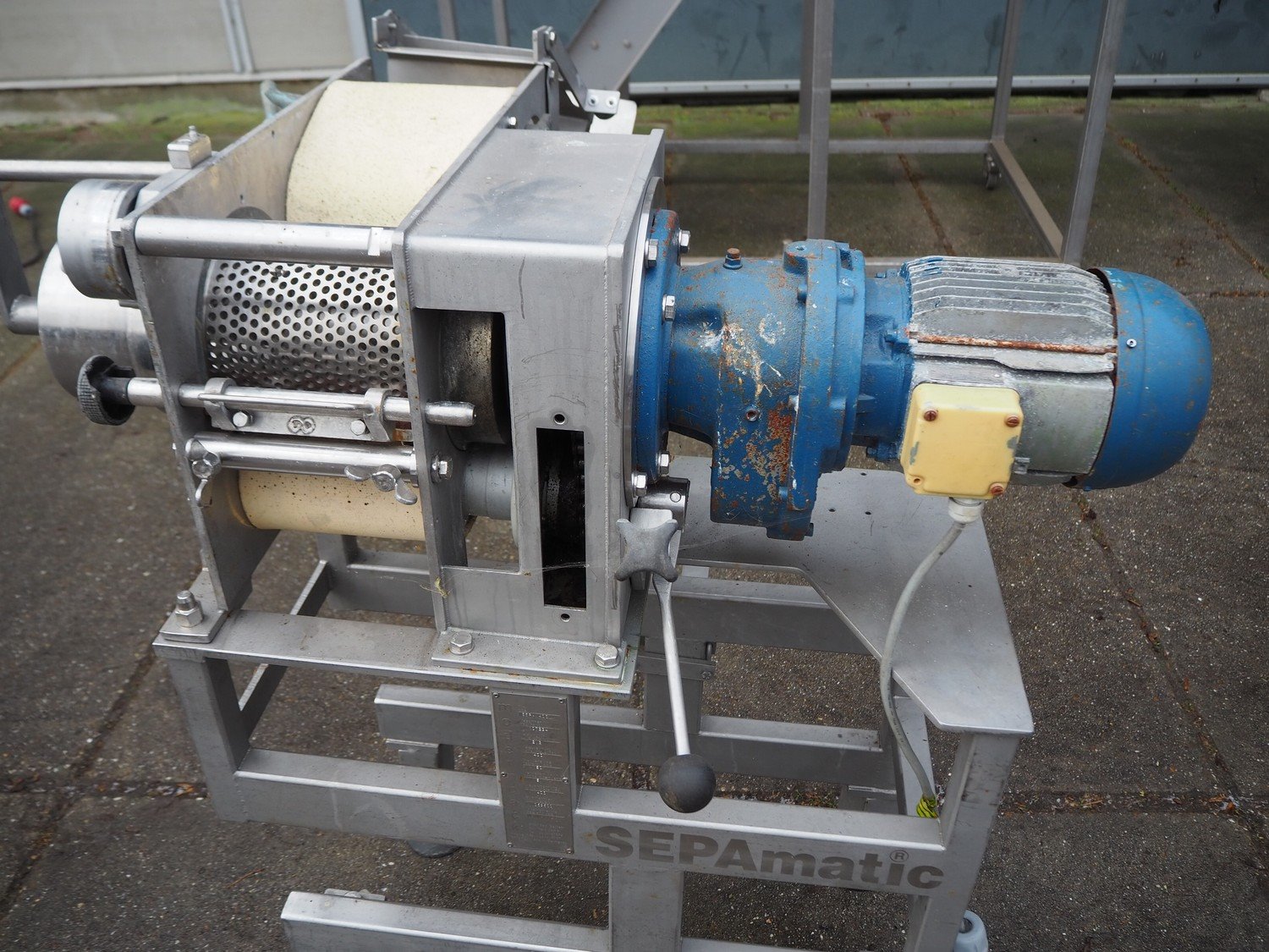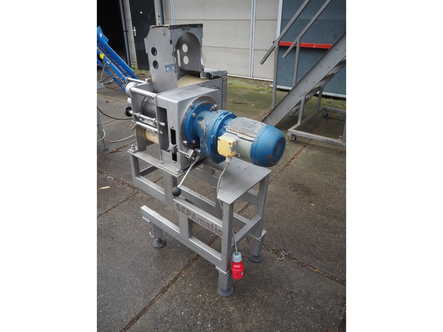 Sepamatic separator, type: SEPA 400 V, machine number: 107234, 400 V, 50 Hz, 3 A, 2.2 kW, plastic belt, belt width: 200 mm, diameter perforations: 10 mm, drum diameter: 170 mm, total dimensions: 1130 mm x 750 mm x 1500 mm. Incomplete. Kavel locatie: Domineesweg 26, 8321 DZ Urk, Nederland