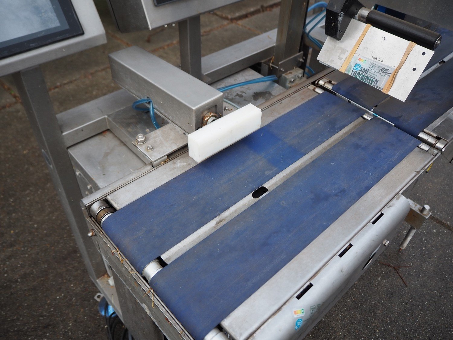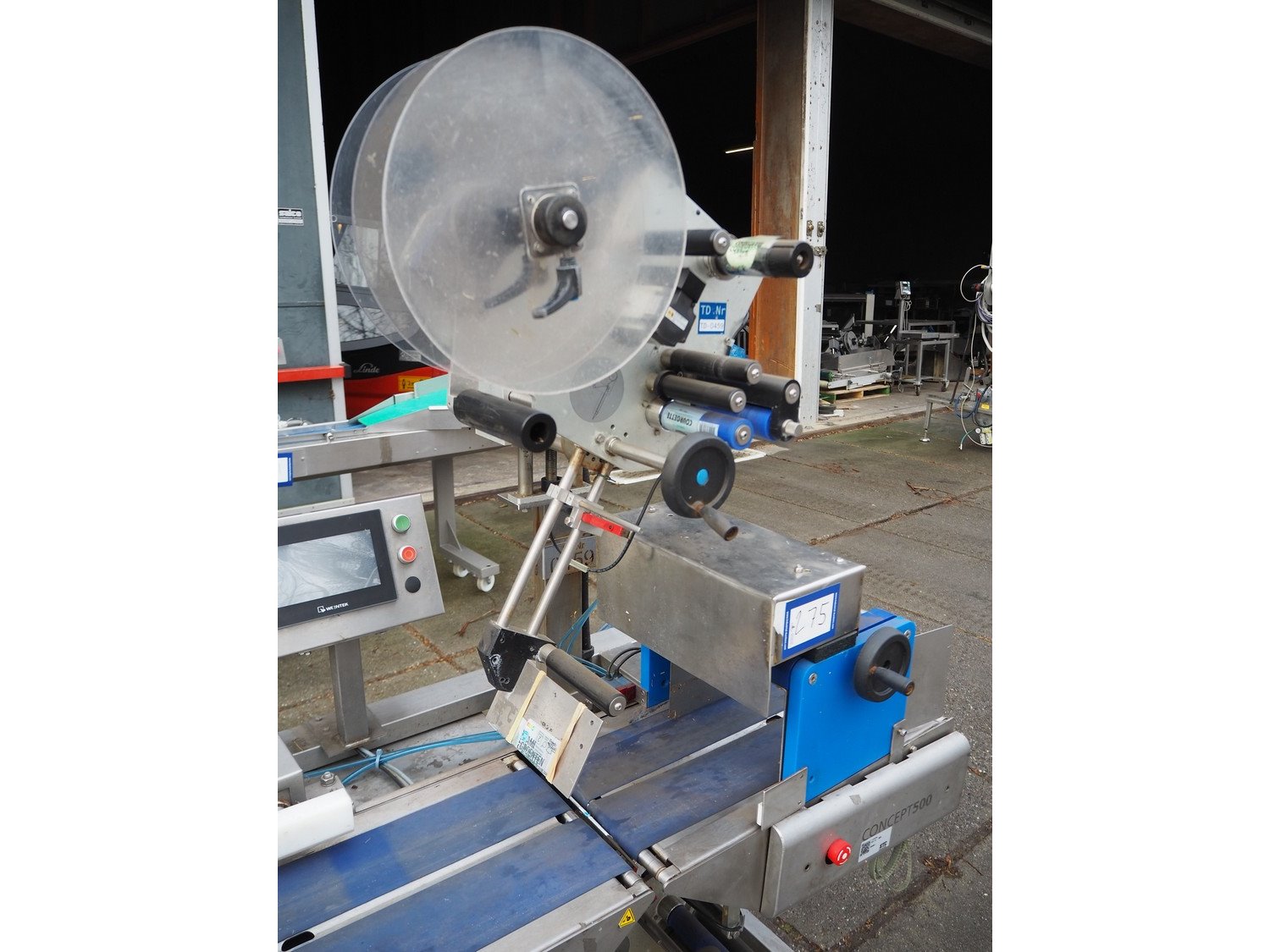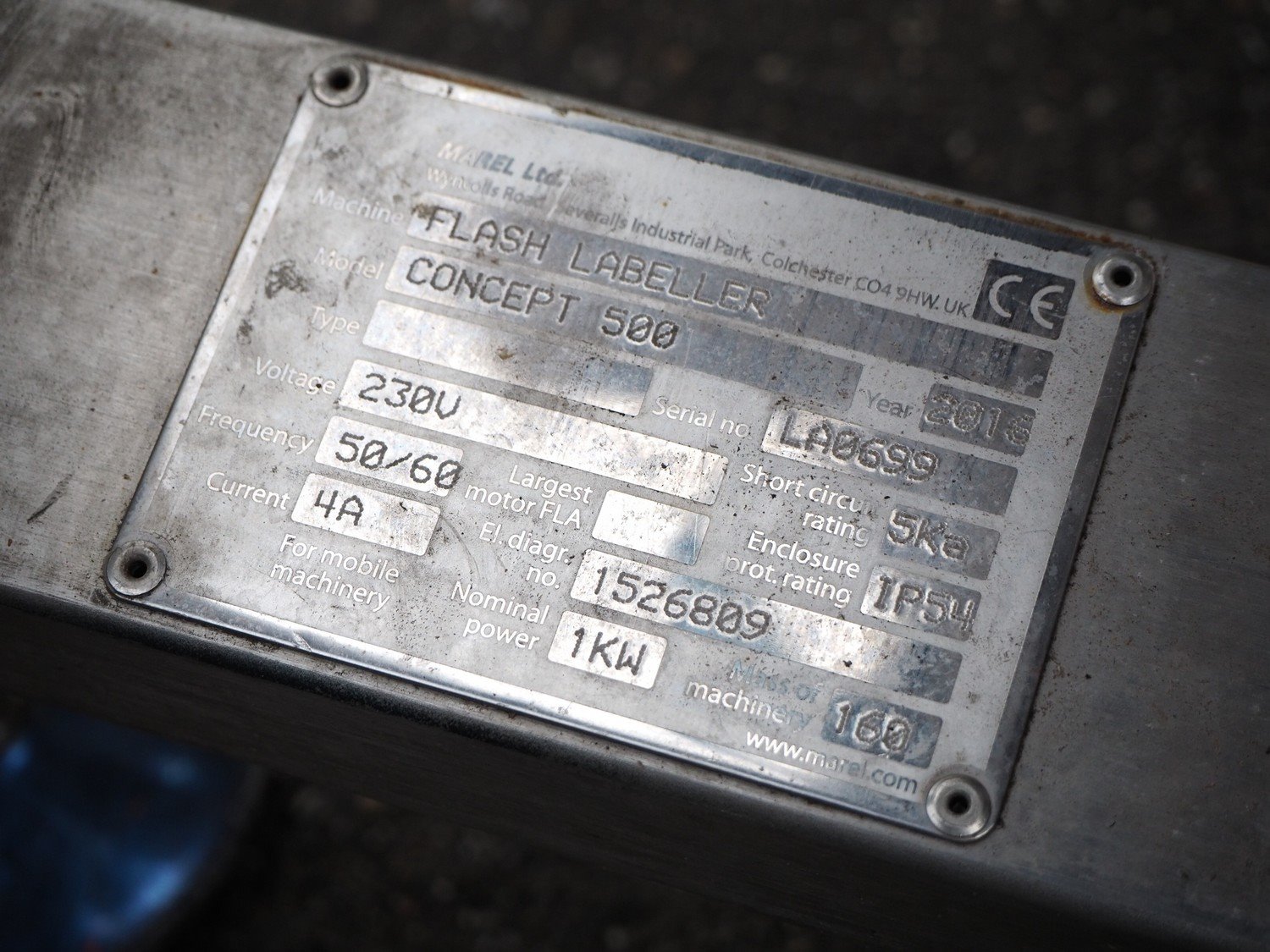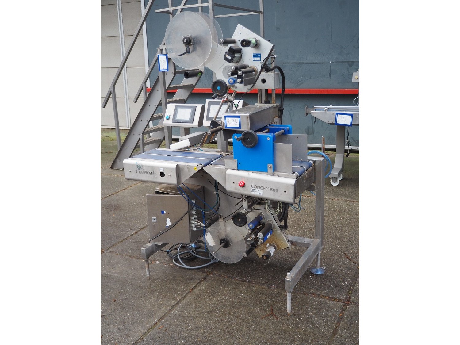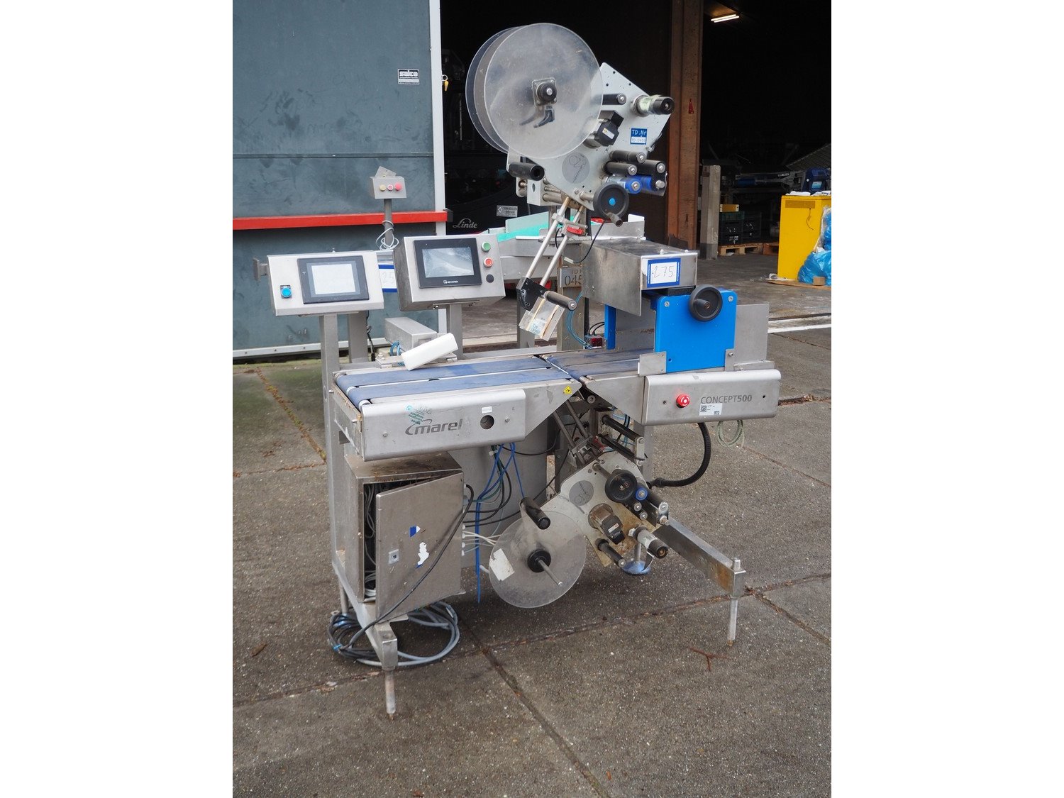Marel top and bottom labeller with rejector, model: Concept 500, serial number: LA0699, year of construction: 2016, 230 V, 50/60 Hz, 4 A, plastic belts, belt width: (4x) 110 mm, total dimensions: 1300 mm x 800 mm x 1810 mm. Kavel locatie: Domineesweg 26, 8321 DZ Urk, Nederland