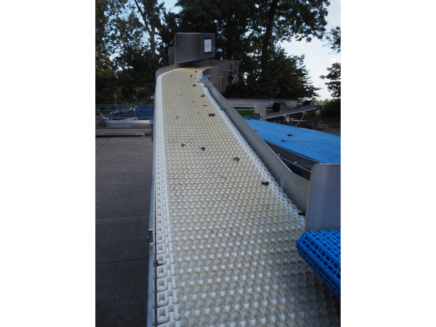 Mobile elevating belt, plastic mesh belt, belt width: 400 mm and 300 mm, elevating height: 1700 mm, total dimensions: 3100 mm x 1000 mm x 2050 mm. Kavel locatie: Domineesweg 26, 8321 DZ Urk, Nederland