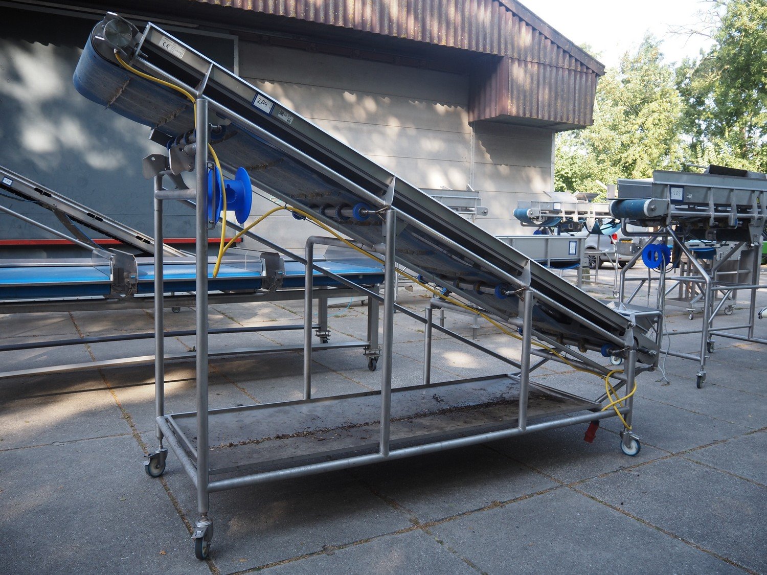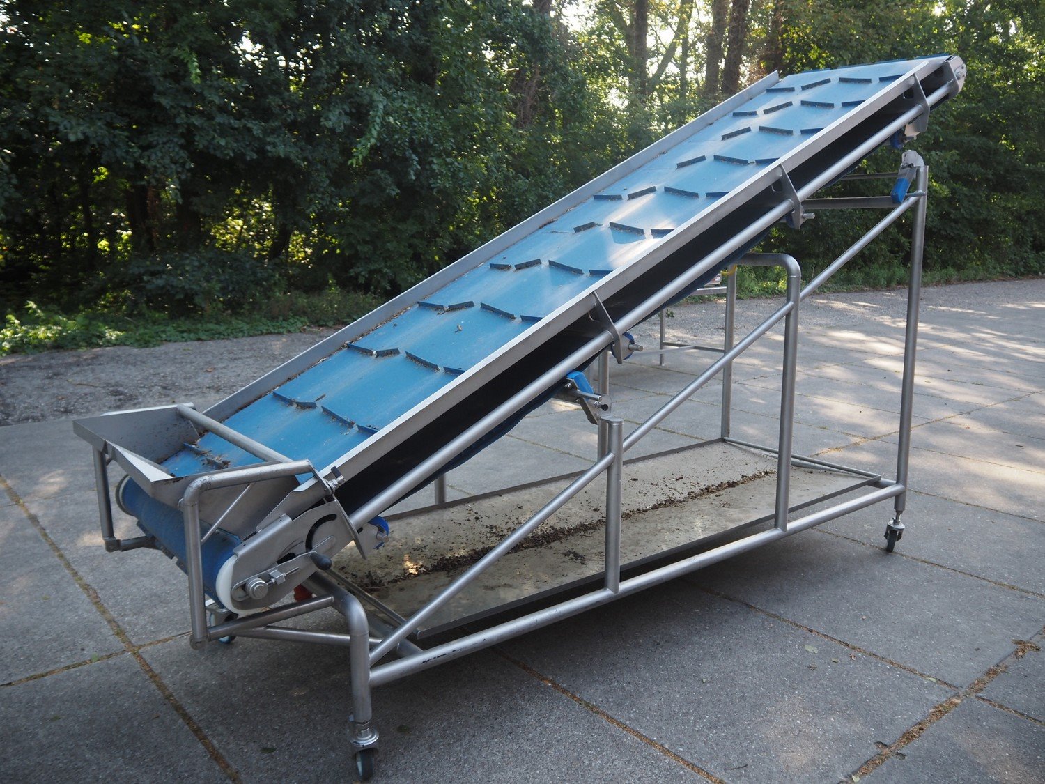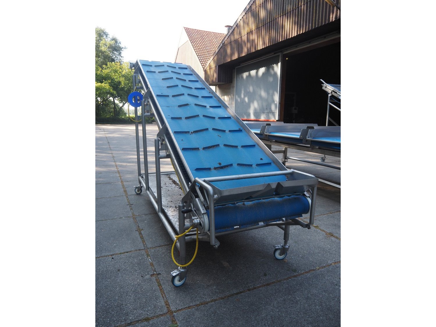 Lumacon mobile elevating belt, type: RC850x3650 Easy clean, serial number: 21-00298-009, year of construction: 2021, speed: 0.16 m/sec, plastic belt with dividers, belt width: 850 mm, distance between dividers: 315 mm, divider height: 20 mm, elevating height: 2200 mm, total dimensions: 3400 mm x 1100 mm x 2300 mm. Kavel locatie: Domineesweg 26, 8321 DZ Urk, Nederland