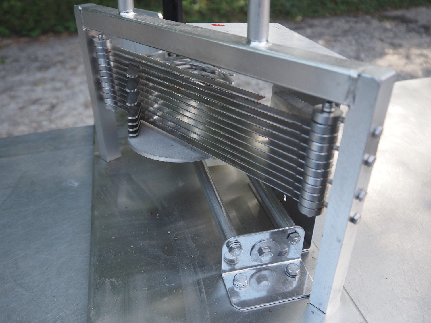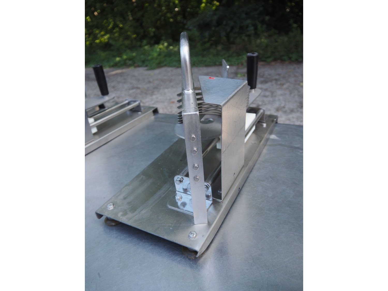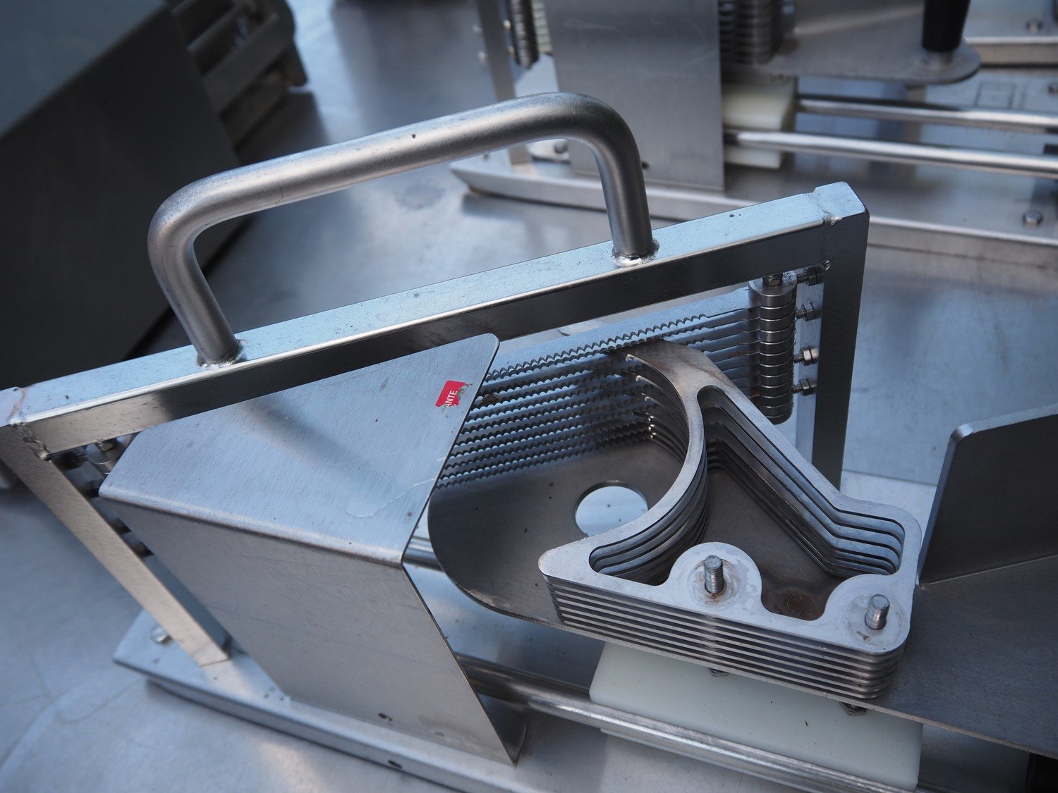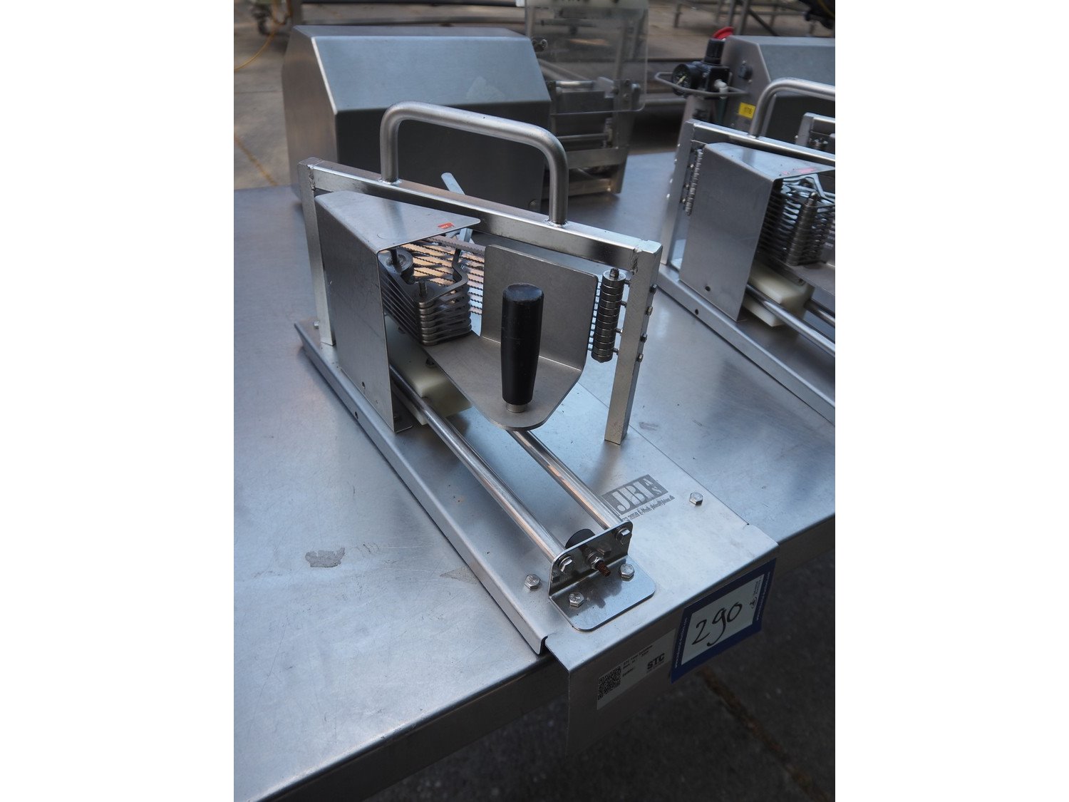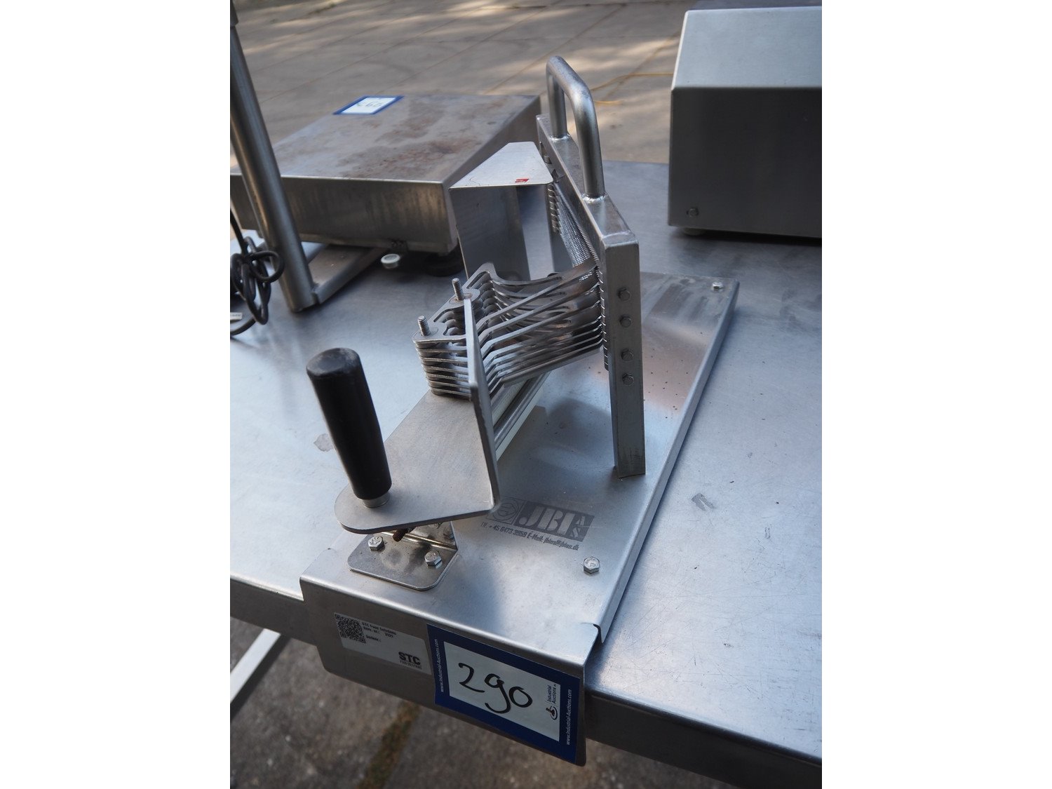 JBI A/S manual tomato slicer, dimensions: 200 mm x 550 mm x 300 mm. Some knives are broken. Kavel locatie: Domineesweg 26, 8321 DZ Urk, Nederland