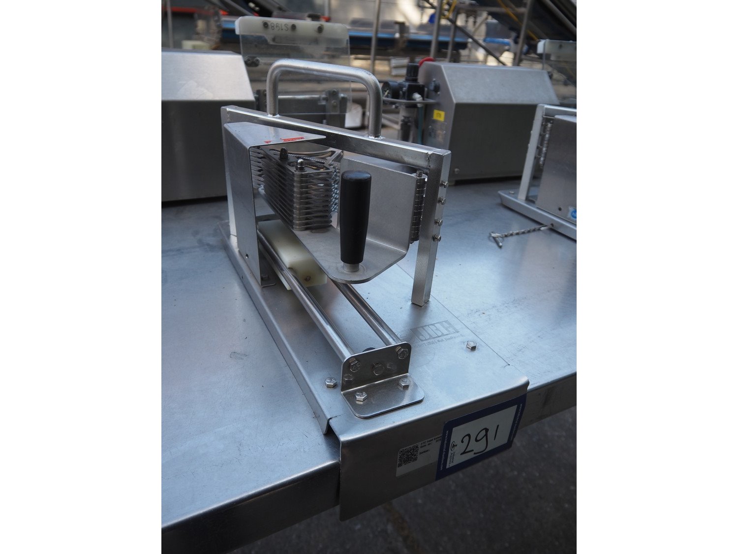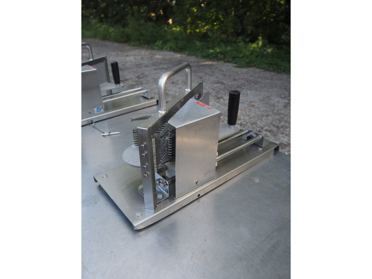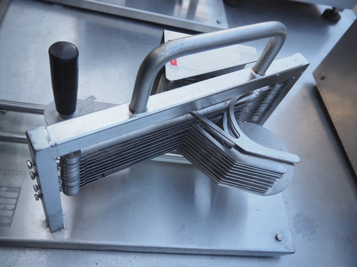 JBI A/S manual tomato slicer, dimensions: 200 mm x 550 mm x 300 mm. Some knives are broken. Kavel locatie: Domineesweg 26, 8321 DZ Urk, Nederland