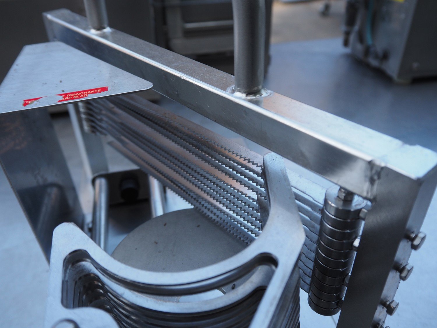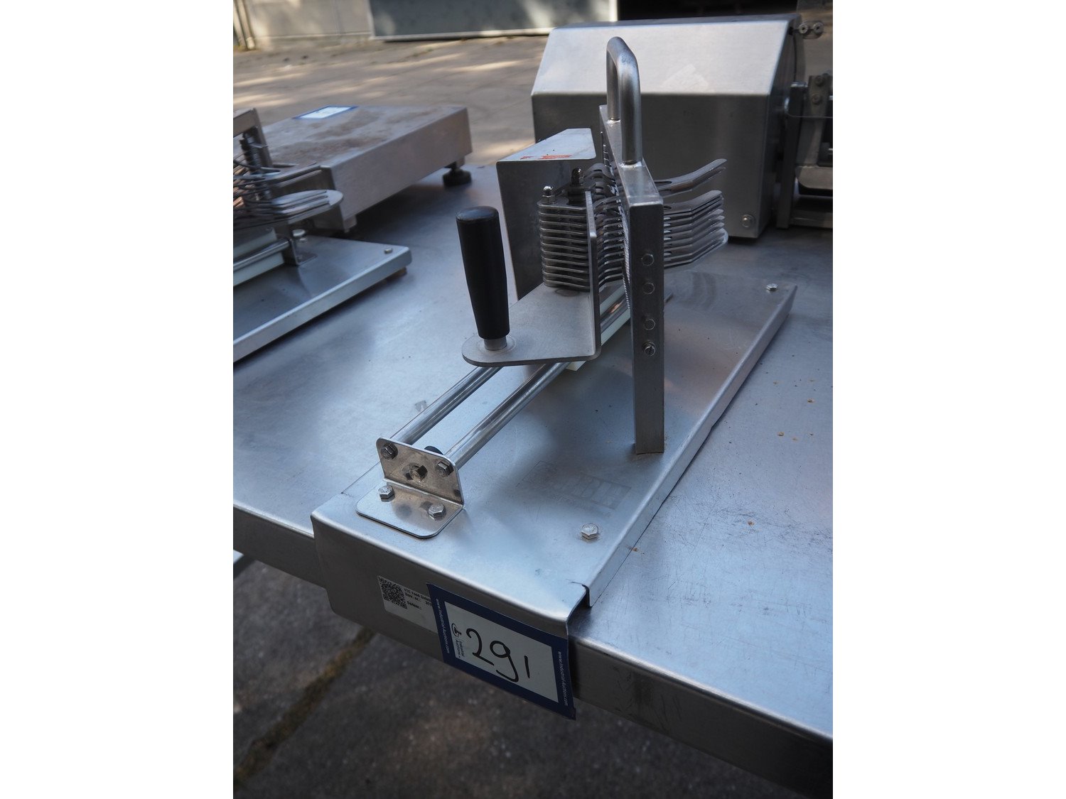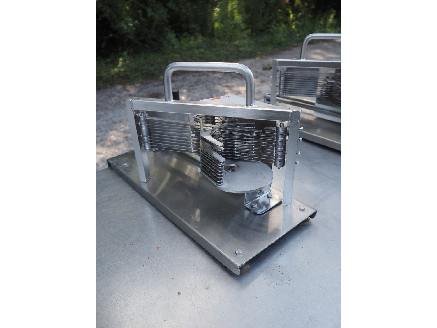 JBI A/S manual tomato slicer, dimensions: 200 mm x 550 mm x 300 mm. Some knives are broken. Kavel locatie: Domineesweg 26, 8321 DZ Urk, Nederland
