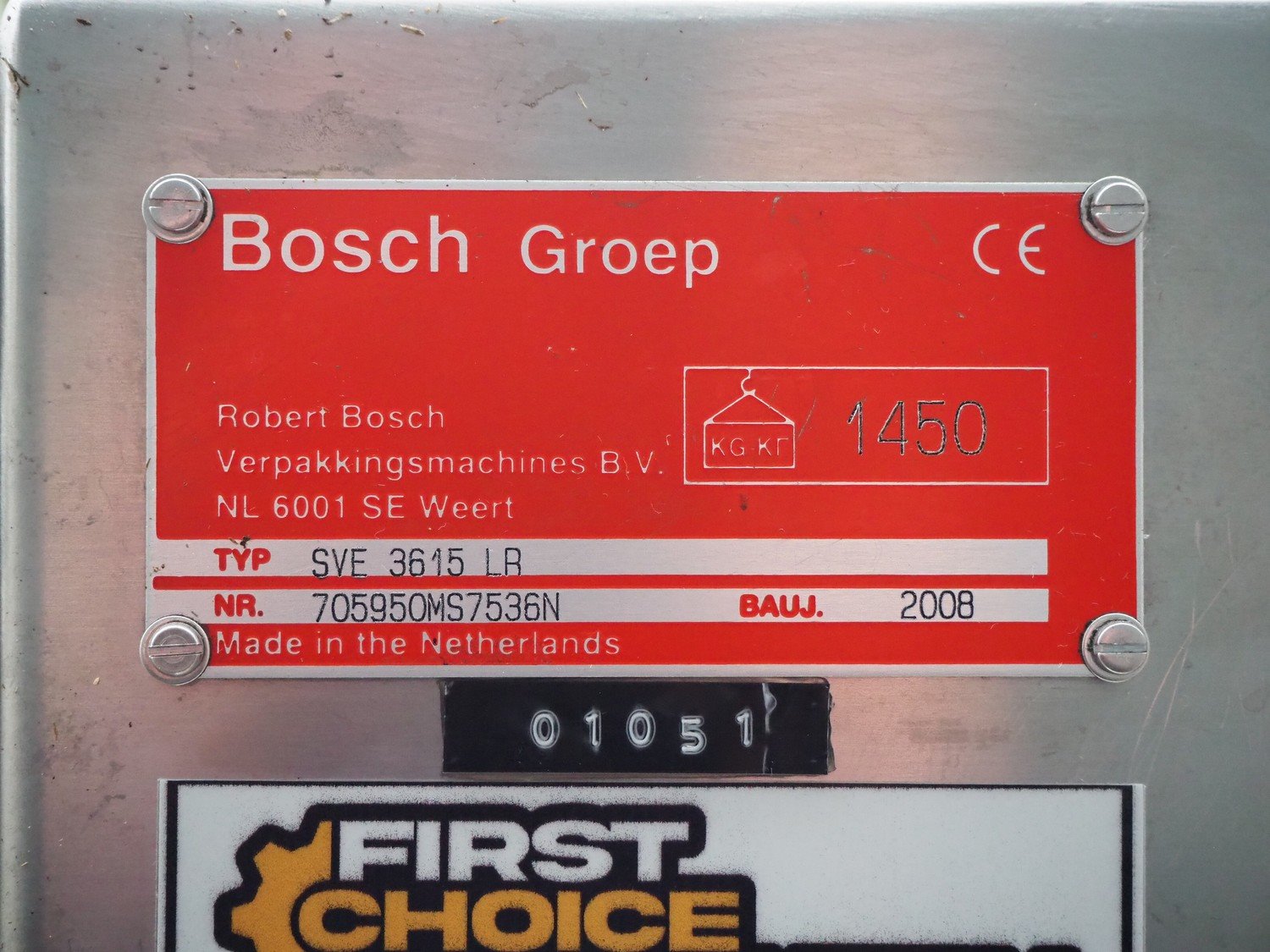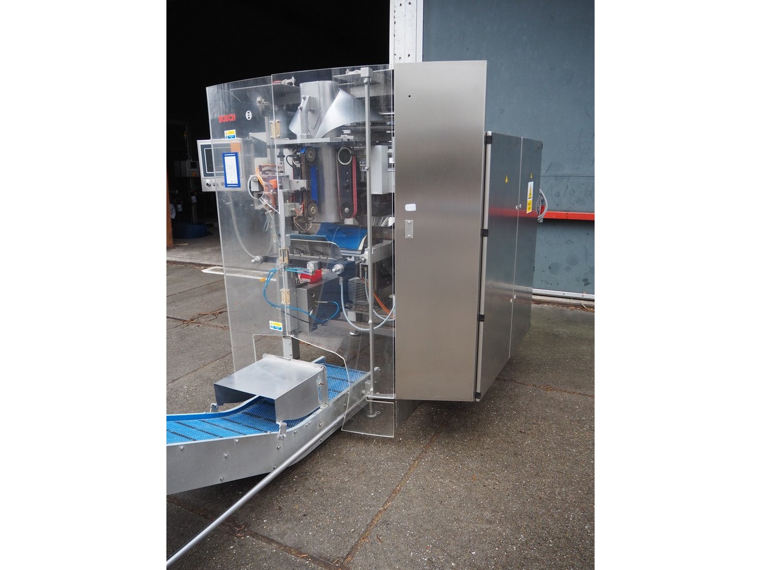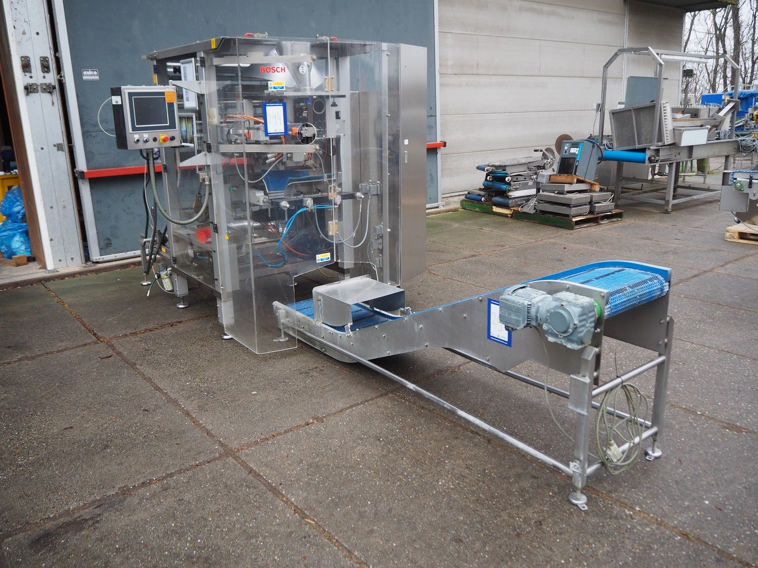 Bosch vertical bag form-, fill-, and seal machine, type: SVE 3615 LR, number: 705950MS7536N, year of construction: 2008, Becker vacuum pump, type: VT 4.25, weight: 1450 kg, film width: 710 mm, dimensions pipe: 230 mm x 155 mm, horizontal seal length: 375 mm, total dimensions: 1850 mm x 2550 mm x 2000 mm. Incomplete, vertical seal is missing. Including outfeed elevating belt with plastic mesh belt , belt width: 455 mm, elevating height: 860 mm, total dimensions outfeed belt: 2800 mm x 800 mm x 890 mm. Kavel locatie: Domineesweg 26, 8321 DZ Urk, Nederland