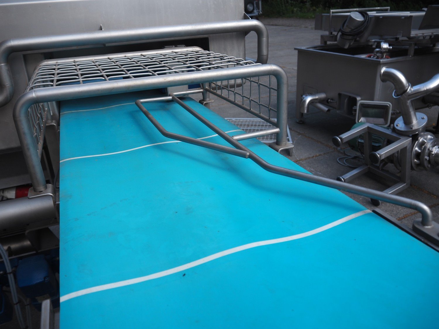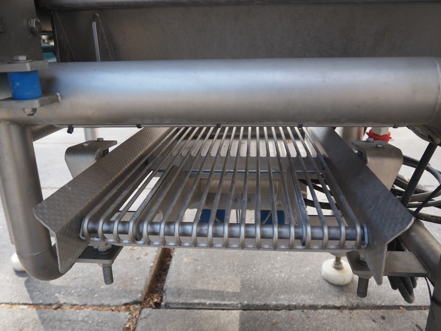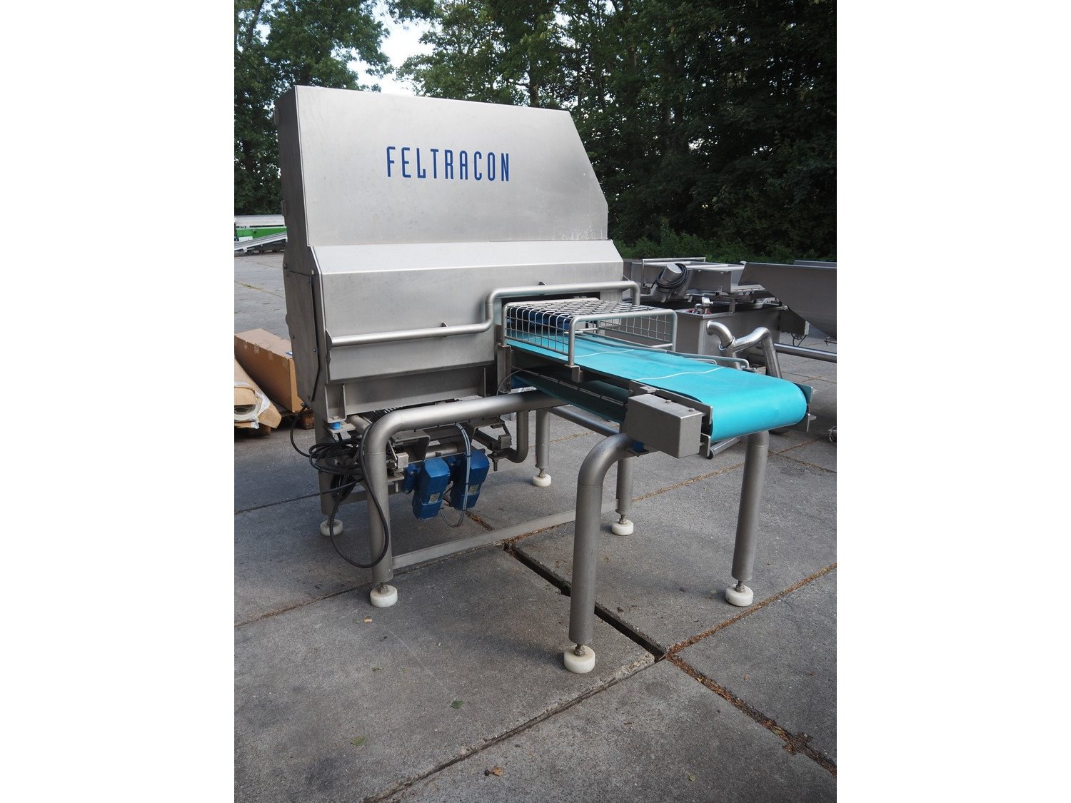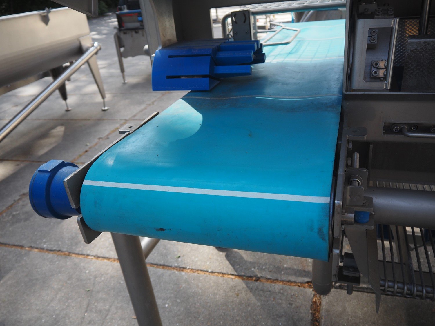 Feltracon melon slicer, type: 61D, number 3814-61D1, year of construction: 2010, 230/400 V, 0.6 kW, plastic belt, belt width: 400 mm, working width: 300 mm, distance between knives: 40 mm, vibrating gutter, gutter width: 330 mm, total dimensions: 2000 mm x 1400 mm x 1860 mm. Kavel locatie: Domineesweg 26, 8321 DZ Urk, Nederland