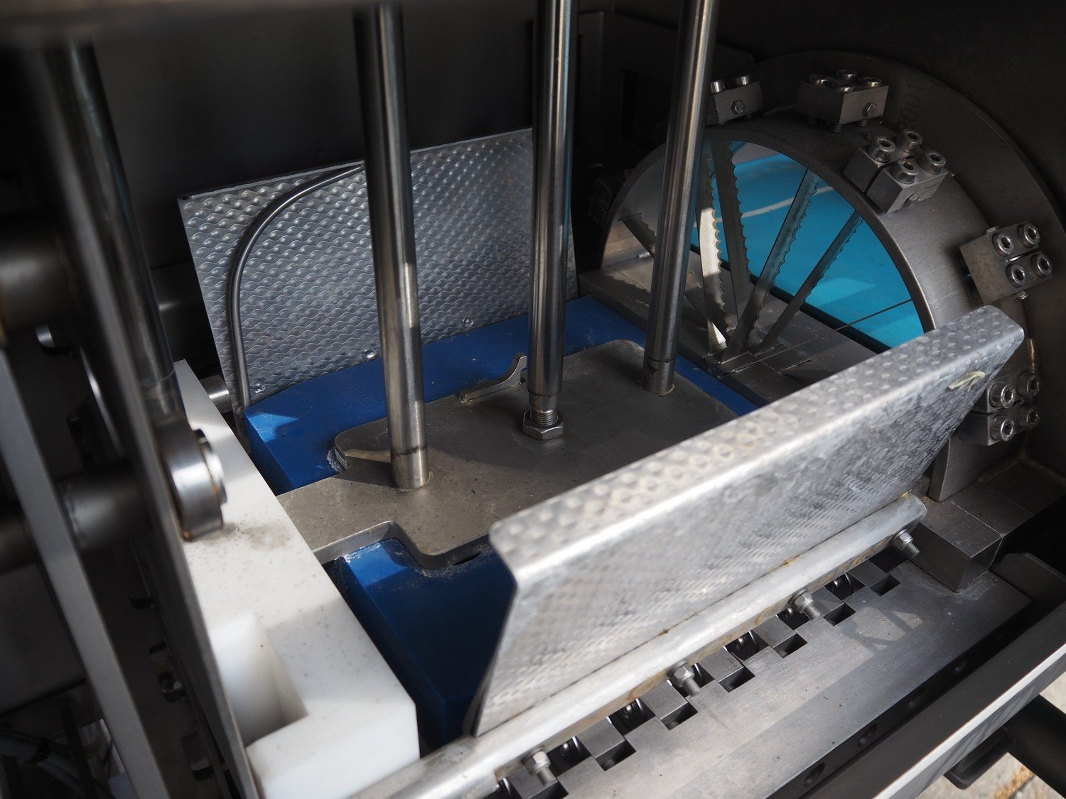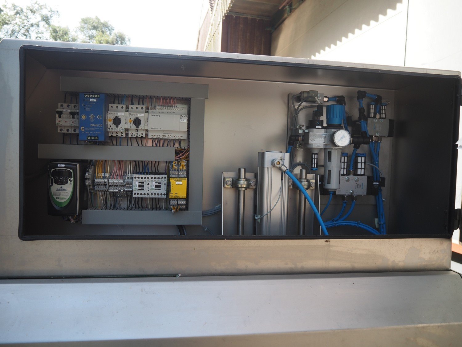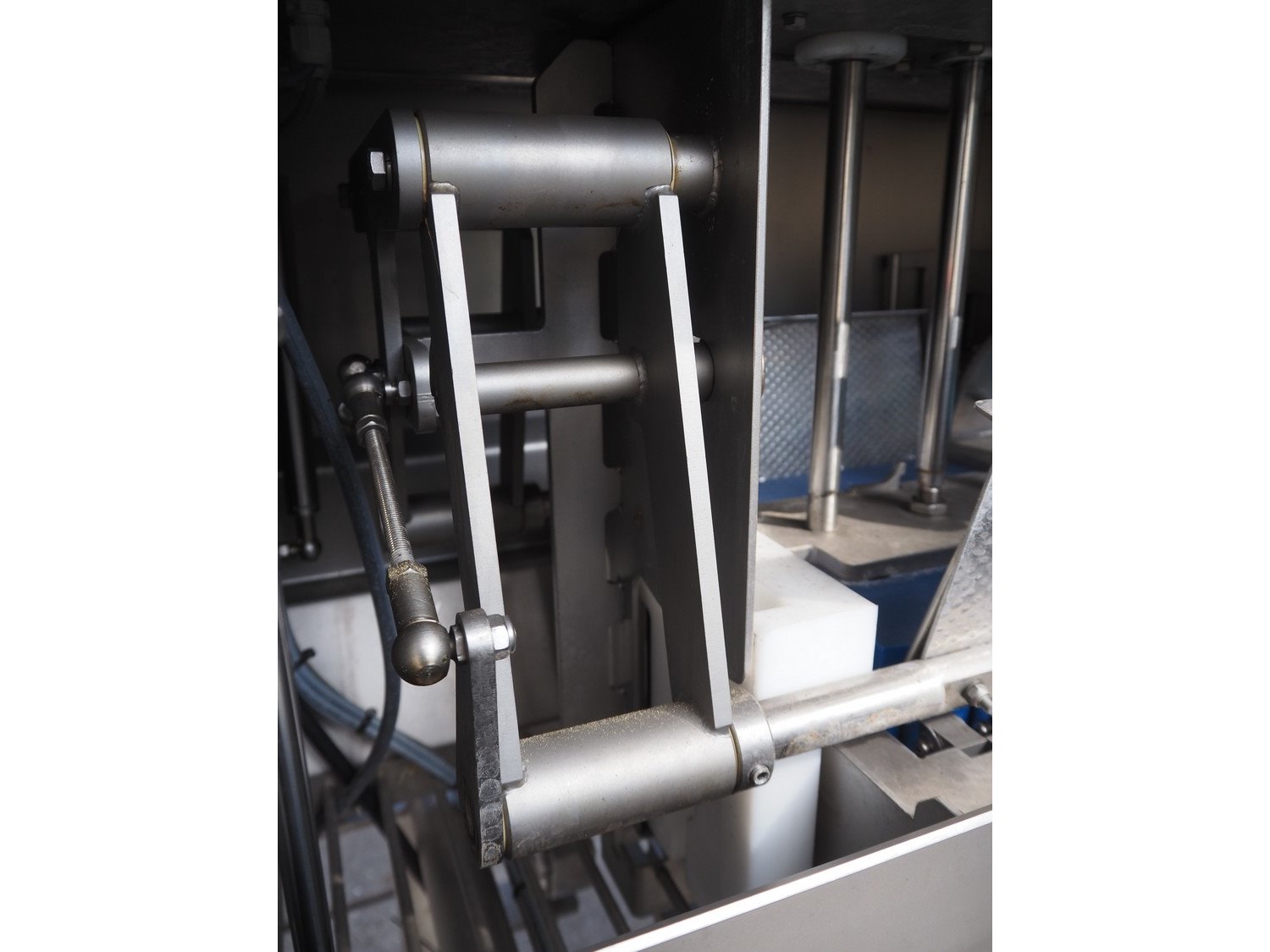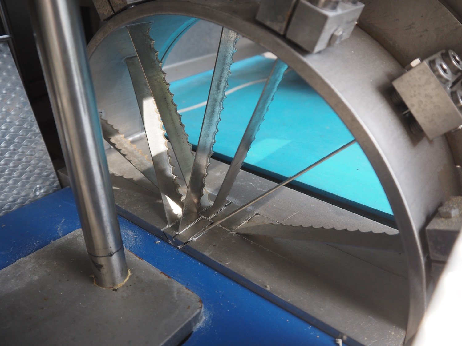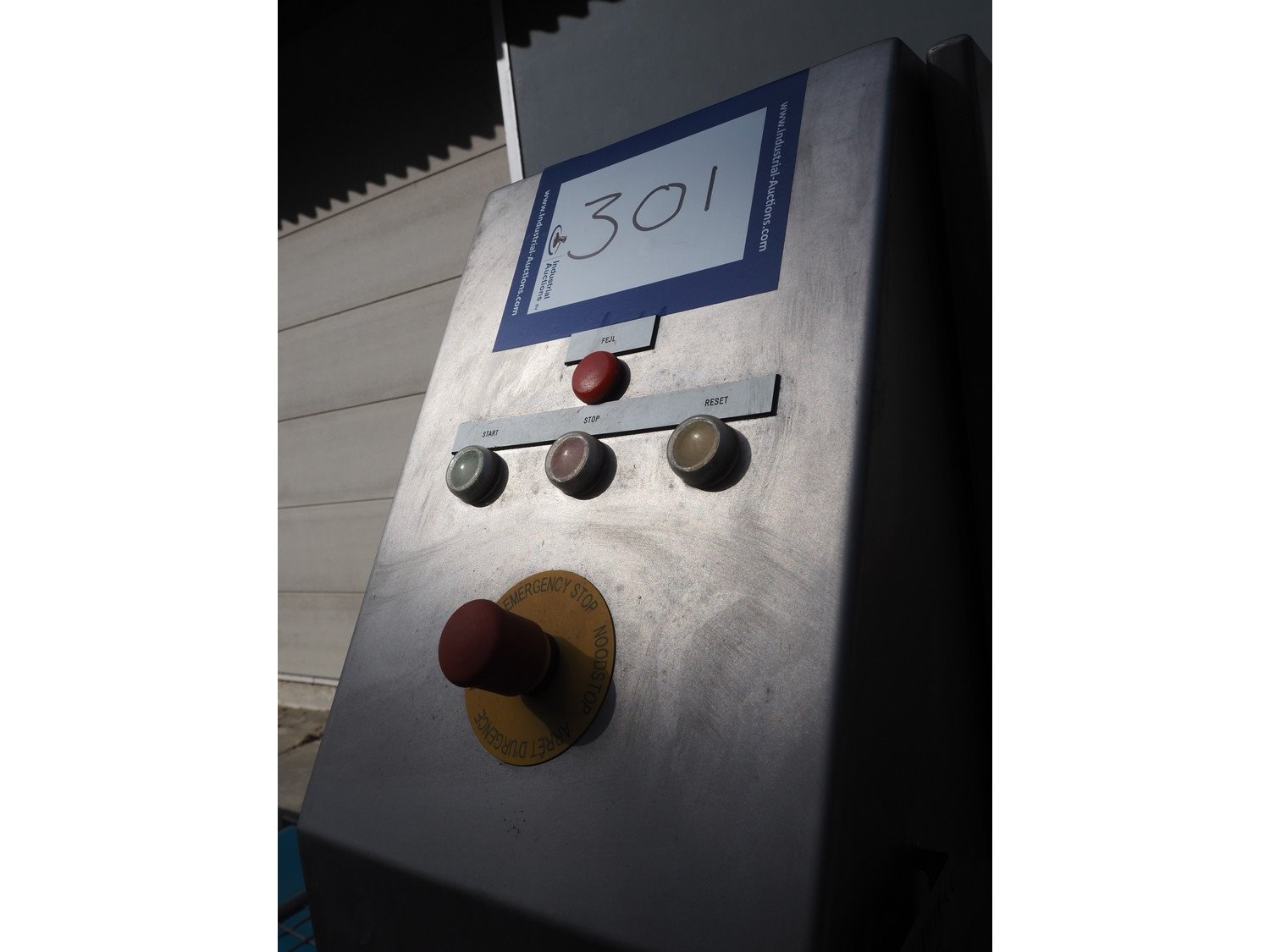 Feltracon melon slicer, type: 61D, number 3814-61D1, year of construction: 2010, 230/400 V, 0.6 kW, plastic belt, belt width: 400 mm, working width: 300 mm, distance between knives: 40 mm, vibrating gutter, gutter width: 330 mm, total dimensions: 2000 mm x 1400 mm x 1860 mm. Kavel locatie: Domineesweg 26, 8321 DZ Urk, Nederland