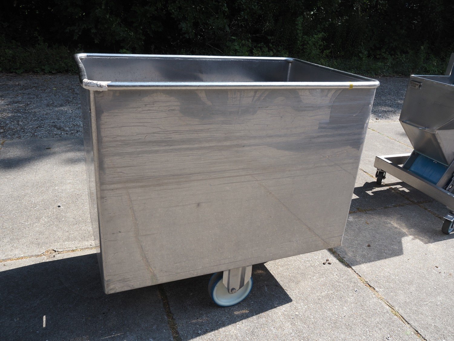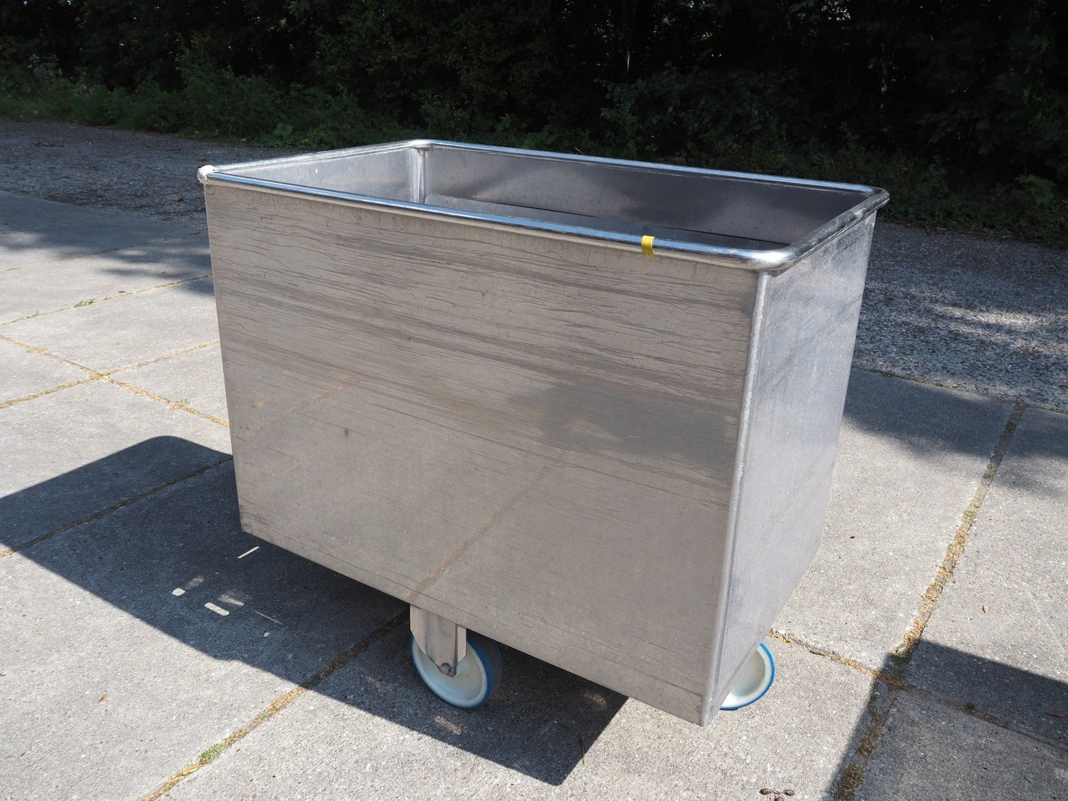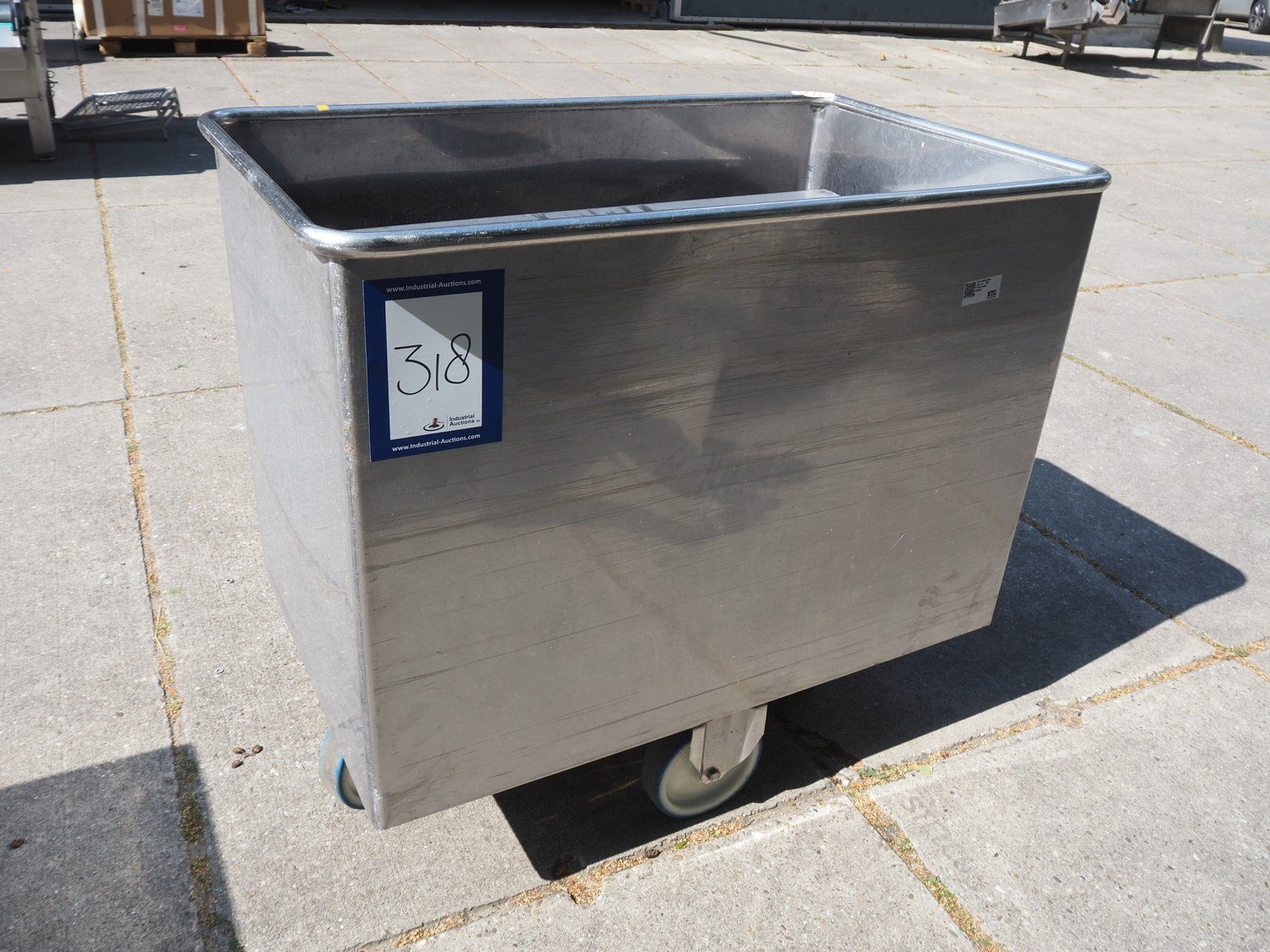 S/s mobile dispenser tub for plates, inside dimensions: 1060 mm x 660 mm, total dimensions: 1130 mm x 710 mm x 1020 mm. Kavel locatie: Domineesweg 26, 8321 DZ Urk, Nederland