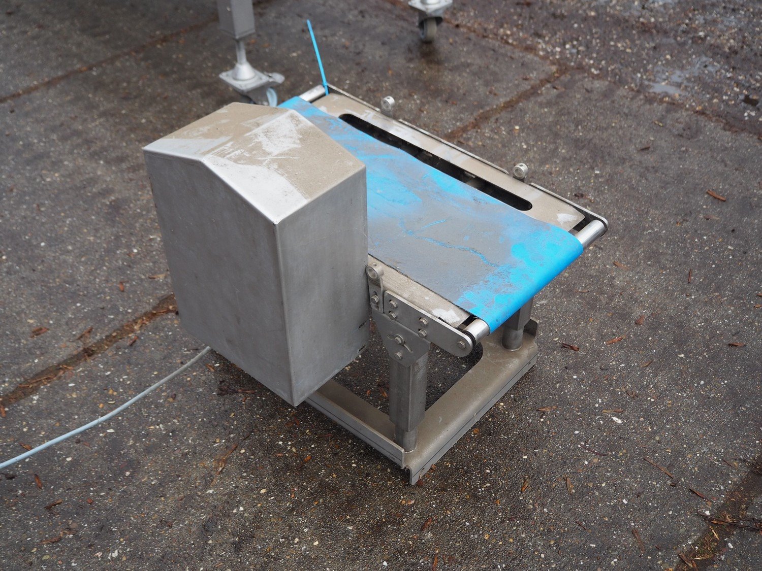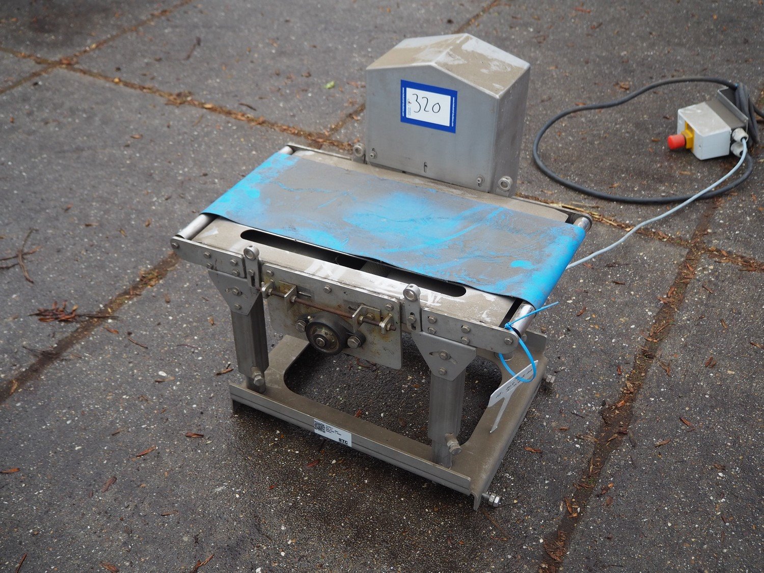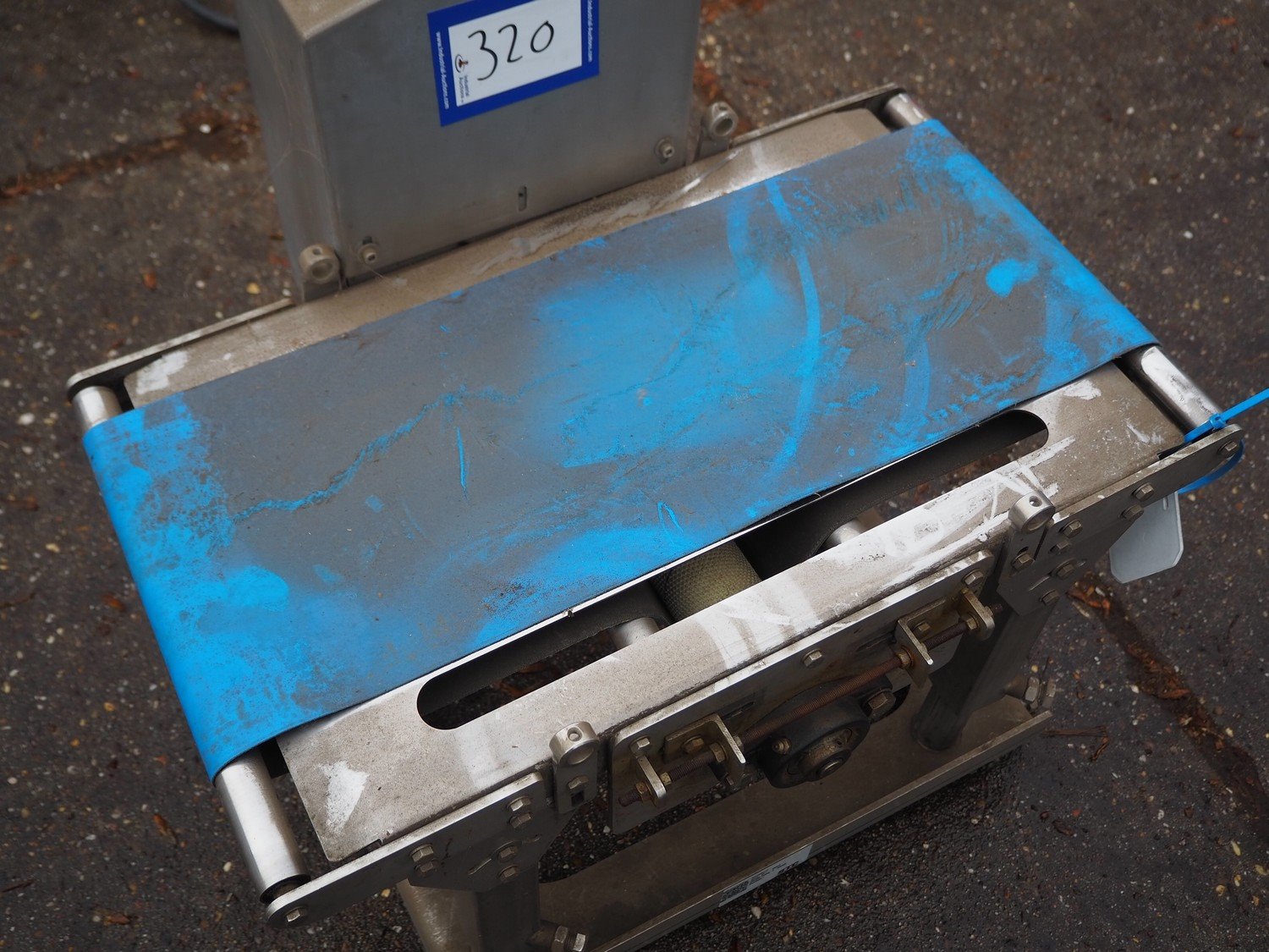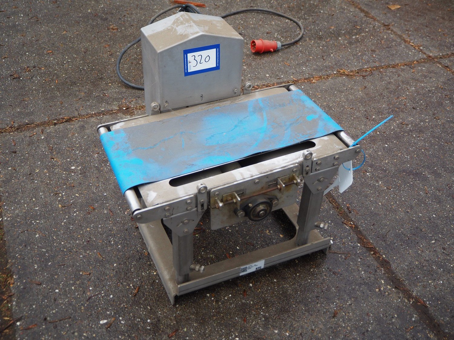 Transport belt with plastic belt, belt width: 220 mm, total dimensions: 600 mm x 510 mm x 570 mm. Kavel locatie: Domineesweg 26, 8321 DZ Urk, Nederland