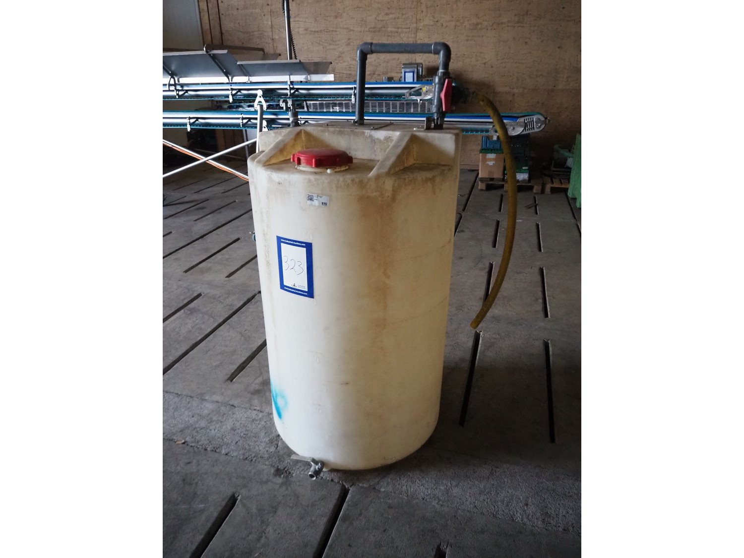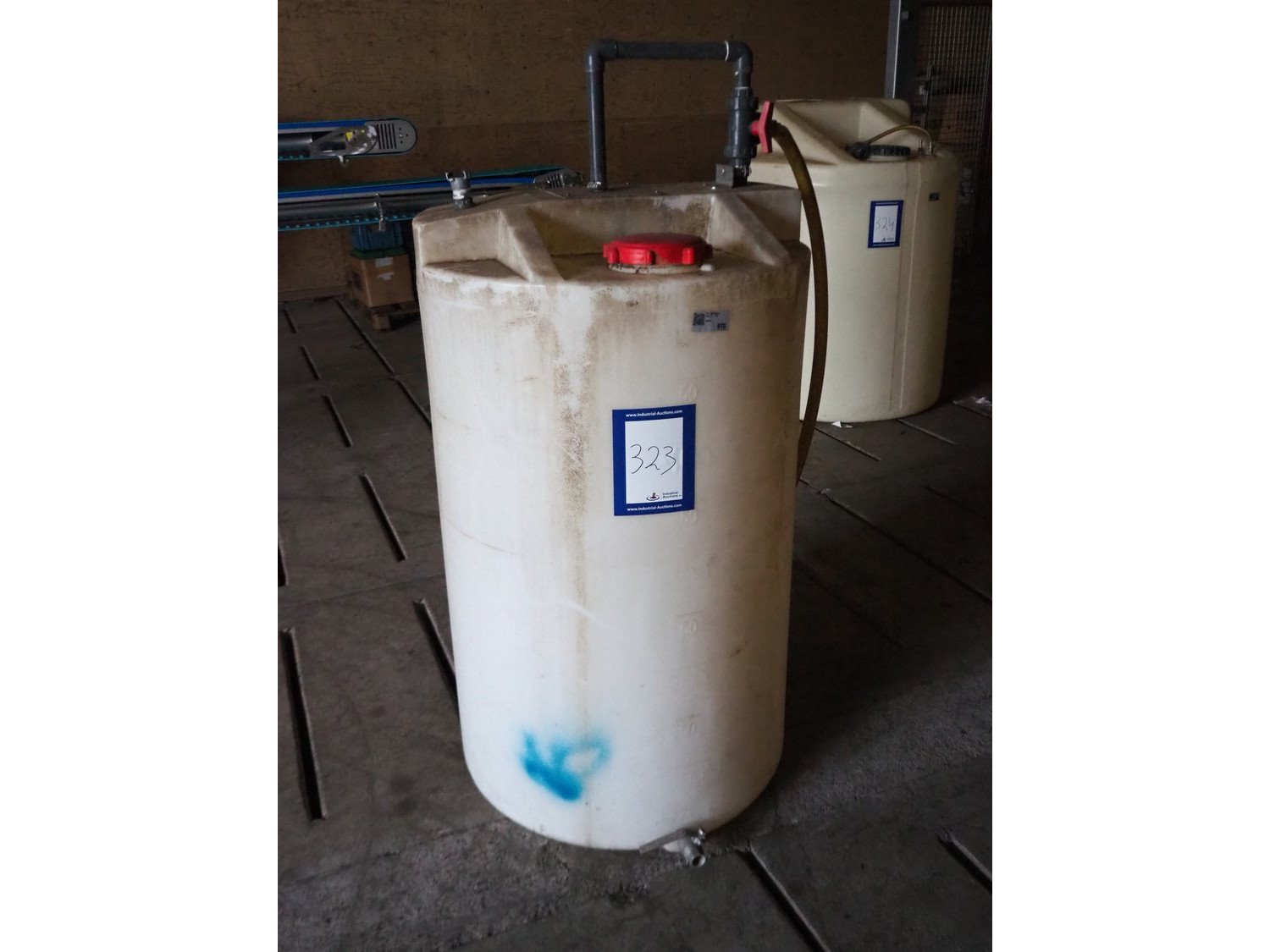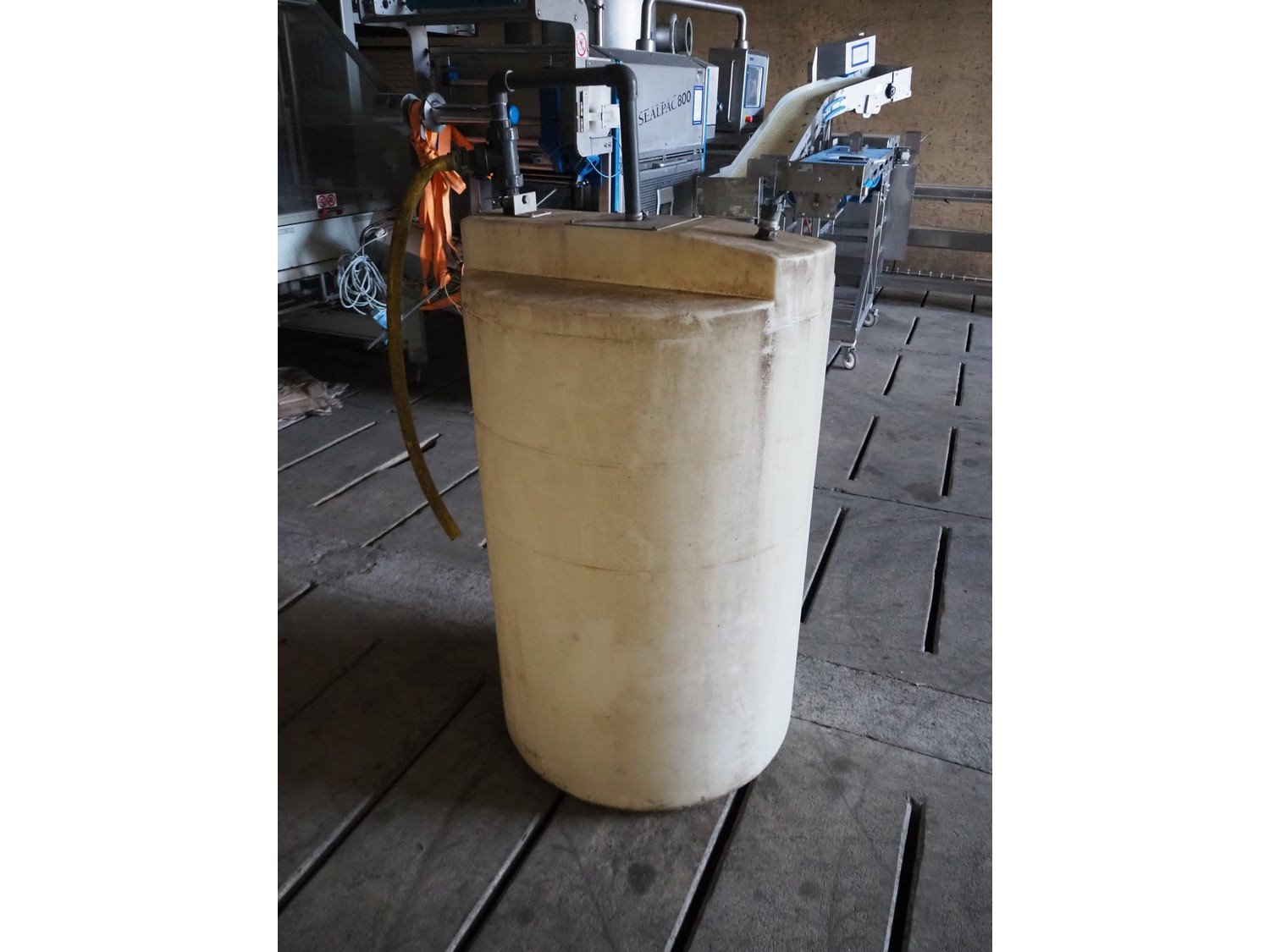 Plastic tank, volume: 500 liter, dimensions: Ø 770 mm x 1600 mm. Kavel locatie: Domineesweg 26, 8321 DZ Urk, Nederland