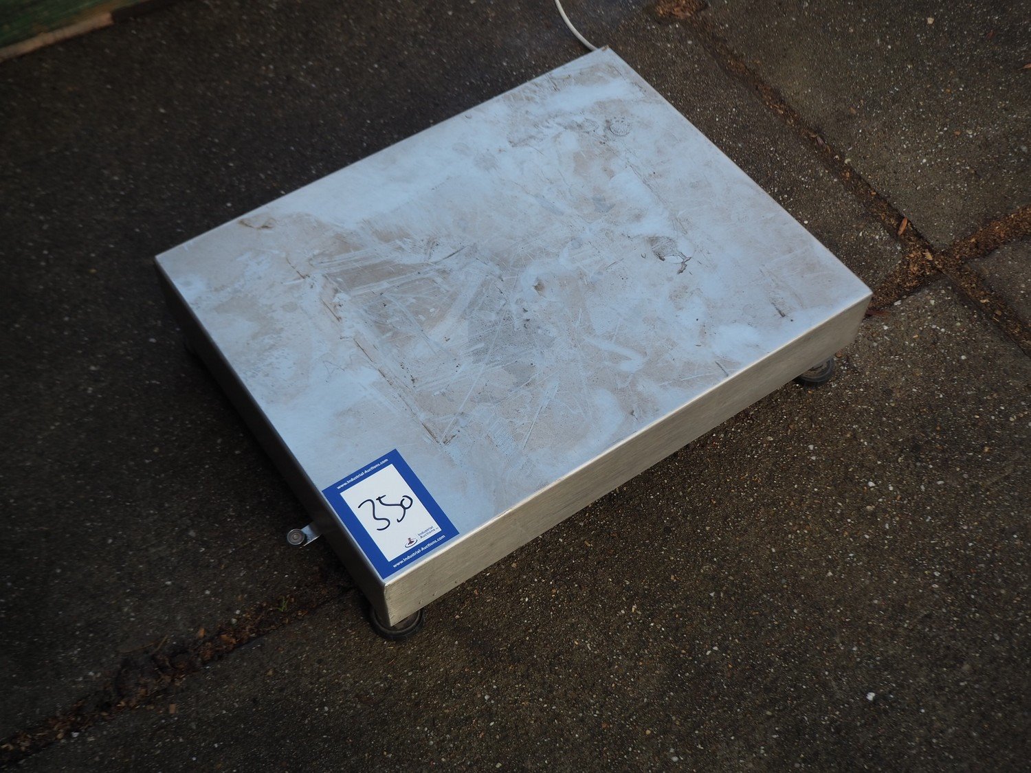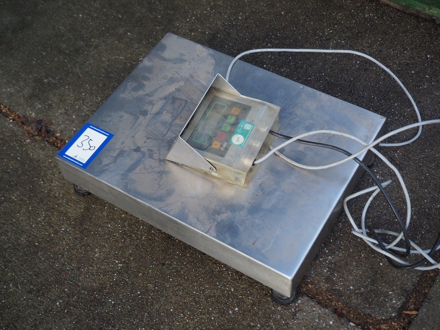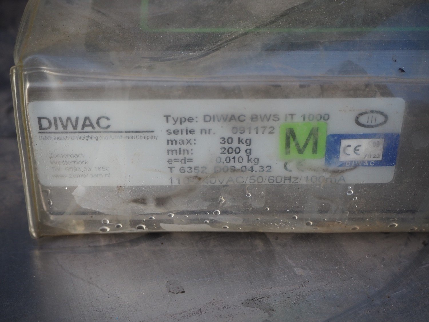 Ohaus weighing scale, model: D60BL, serial number: 1623177-6CK, capacity: 60 kg / 150 lb, Diwac indicator, type: Diwac BWS IT 1000, serial number: 091172, weighing range: 200 g - 30 kg, 110-240 V, 50-60 Hz, 100 mA, with Teda Huntleigh load cell, model: 1260, dimensions: 550 mm x 420 mm x 130 mm. Kavel locatie: Domineesweg 26, 8321 DZ Urk, Nederland