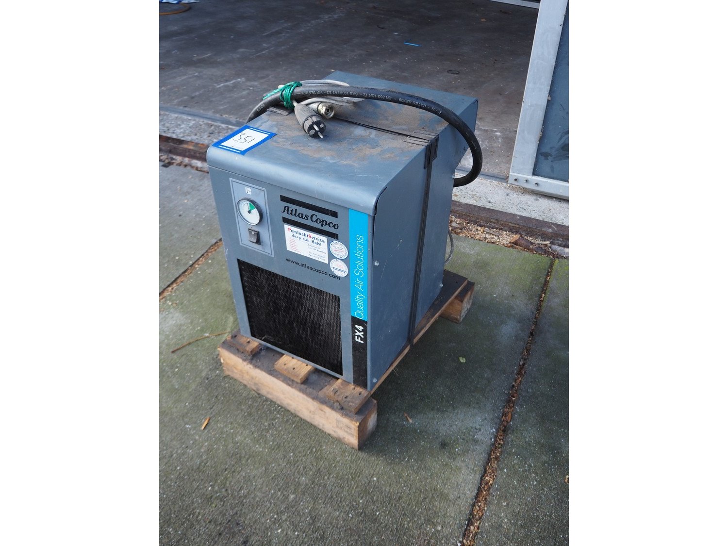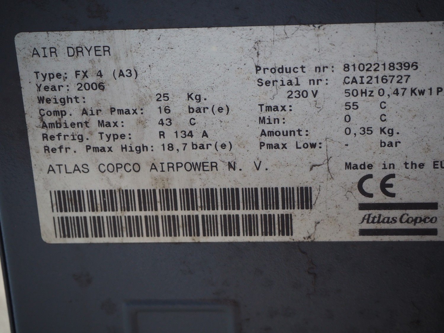 Atlas Copco air dryer, type: FX 4 (A3), serial number: CAI216727, year of construction: 2006, 230 V, 50 Hz, 0.47 kW, refrigerant: R 134 A/0.35 kg, weight: 25 kg, dimensions: 360 mm x 500 mm x 600 mm. Kavel locatie: Domineesweg 26, 8321 DZ Urk, Nederland