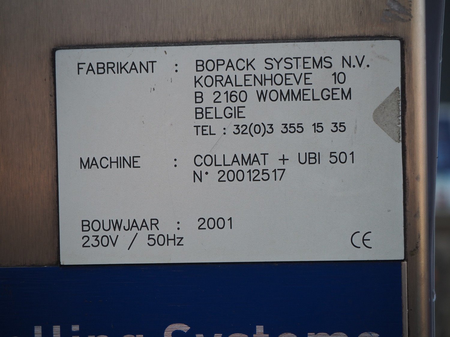 Bopack systems N.V. labelling machine, model: Collamat + UBI 501, serial number: 20012517, year of construction: 2001, 230 V, 50 Hz, plastic belt, belt width: 280 mm, total dimensions: 1520 mm x 600 mm x 1600 mm. Incomplete. Kavel locatie: Domineesweg 26, 8321 DZ Urk, Nederland