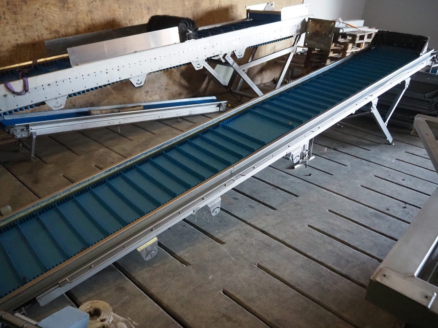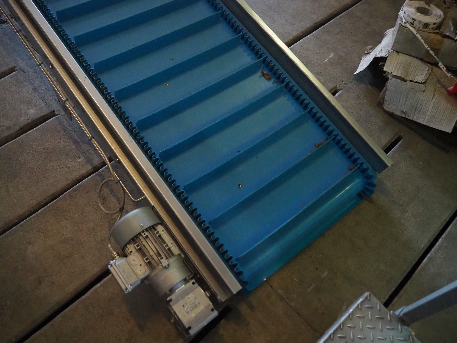 Jasa Packaging Systems elevating belt, type: SAM, OPVOERBAND, model: 18100760500000, machine number: 14127, year of construction: 2018, 400 V, 3 Ph, 3.05 A, 0.75 kW, plastic belt and dividers, belt width: 620 mm, distance between dividers: 150 mm, divider height: 50 mm, elevating height: 4250 mm, brush width: 770 mm, total dimensions: 4900 mm x 1150 mm x 4400 mm. Kavel locatie: Domineesweg 26, 8321 DZ Urk, Nederland
