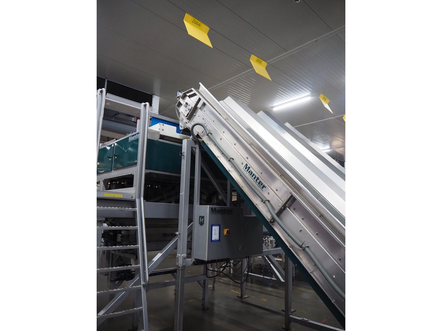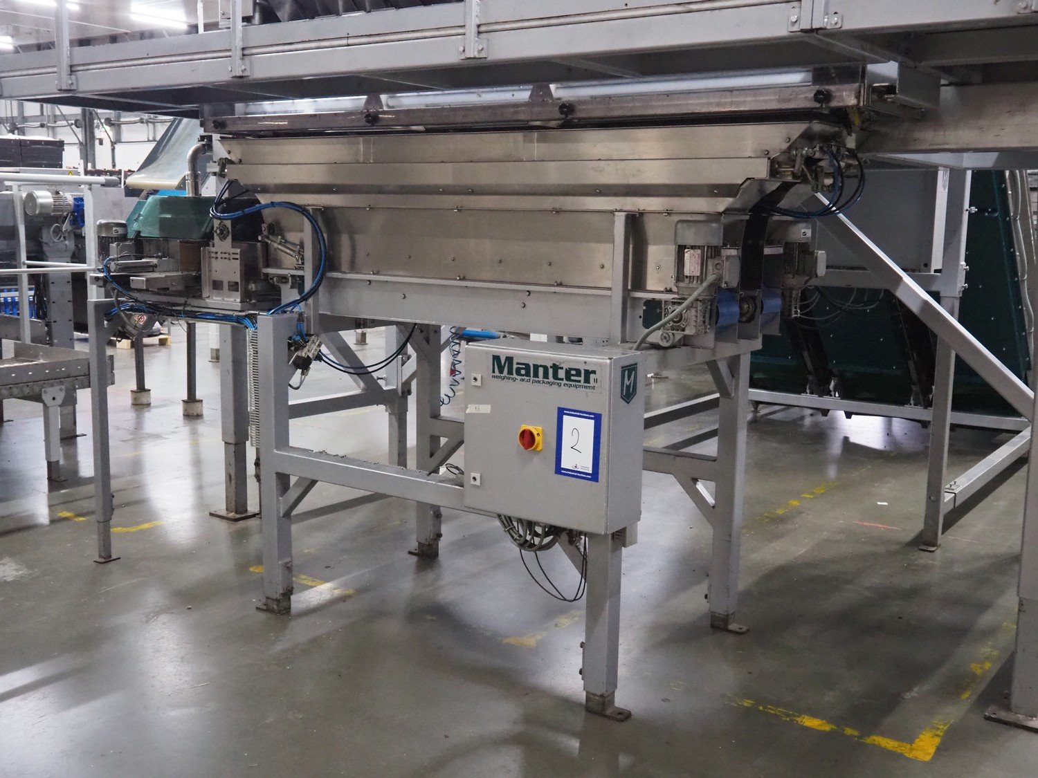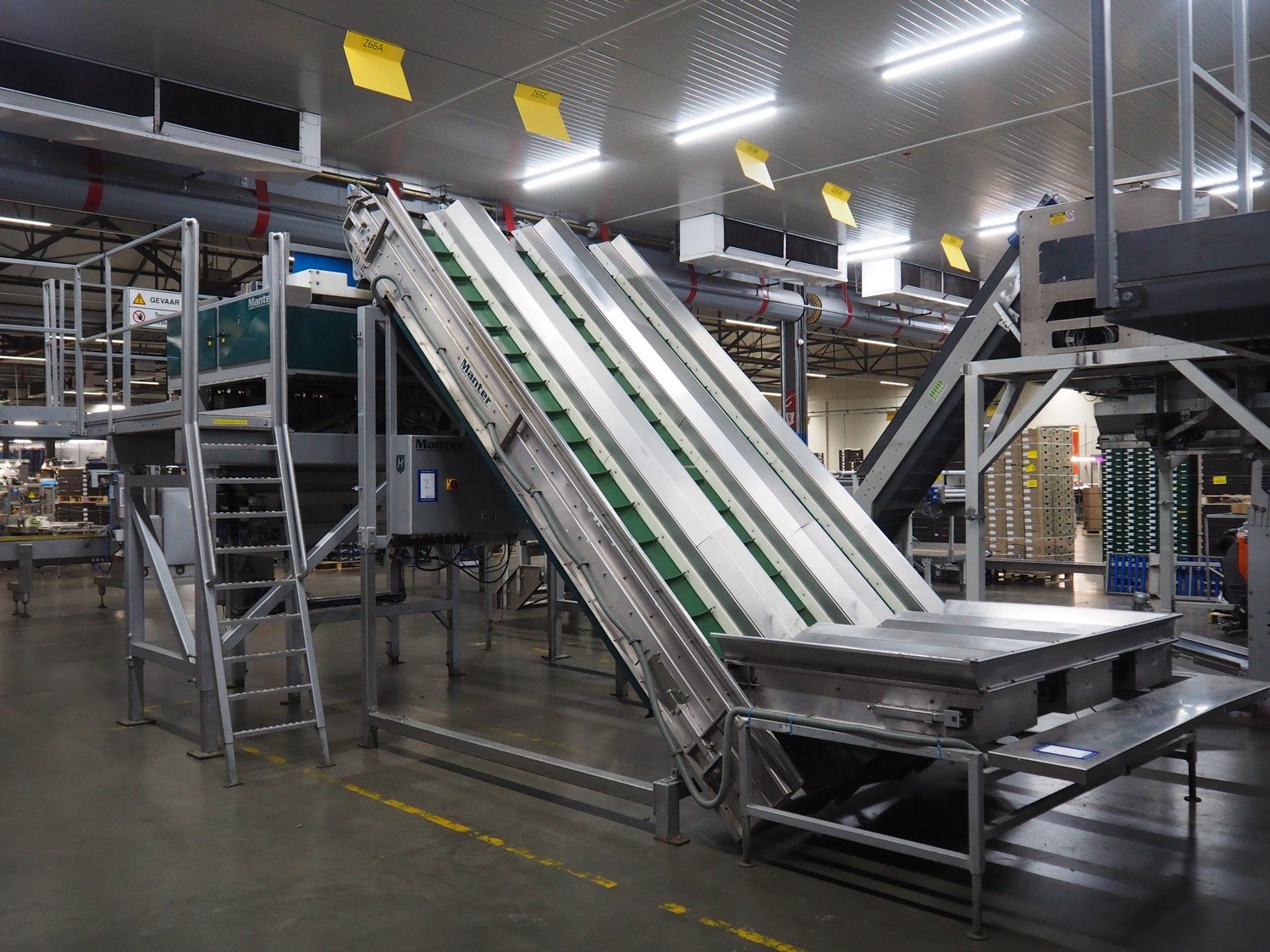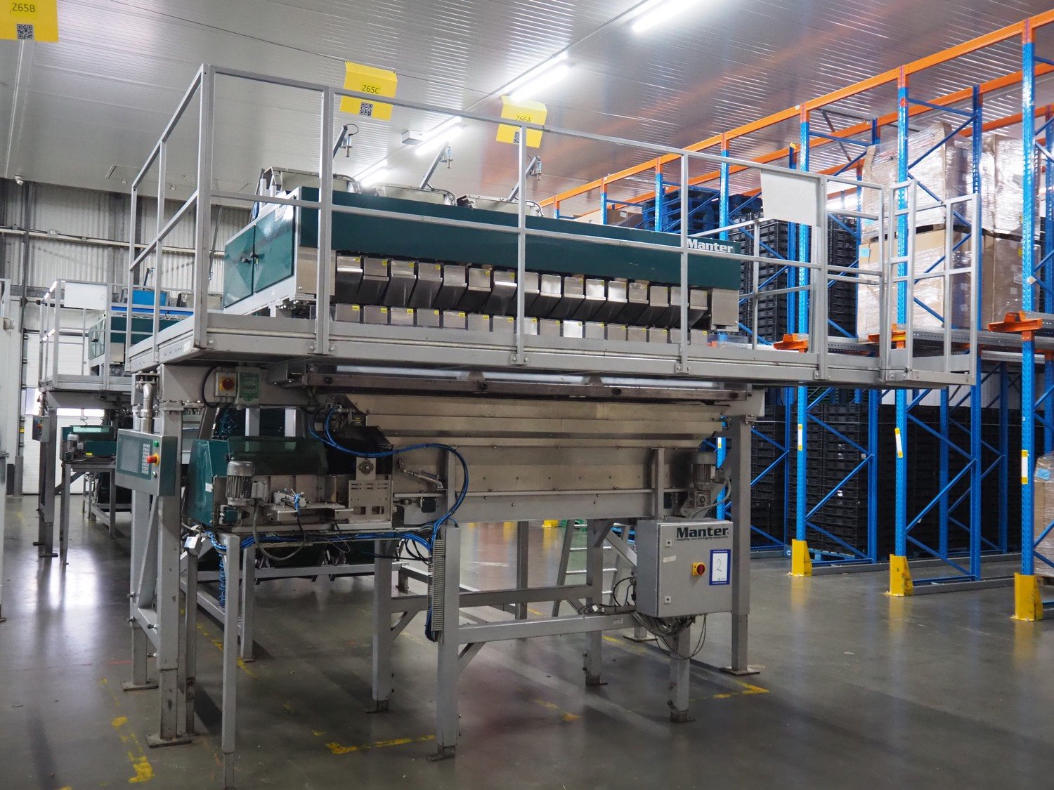 Manter linear weighing machine, type: 16000 Mix, machine number: 210-081, year of construction: 2010, 16 lanes, lane width: (16x) 140 mm, 2 outfeed belts, belt width: (2x) 150 mm, dimensions linear weighing machine: 4800 mm x 3200 mm x 3150 mm, elevating infeed belt, 3 lanes, plastic belt with dividers, belt width: 445 mm, divider height: 40 mm, distance between divides: 240 mm, elevating height: 2900 mm, dimensions elevating belt: 5200 mm x 2400 mm x 3700 mm. Kavel locatie: ABC Westland 210, 2685 DC Poeldijk, Nederland