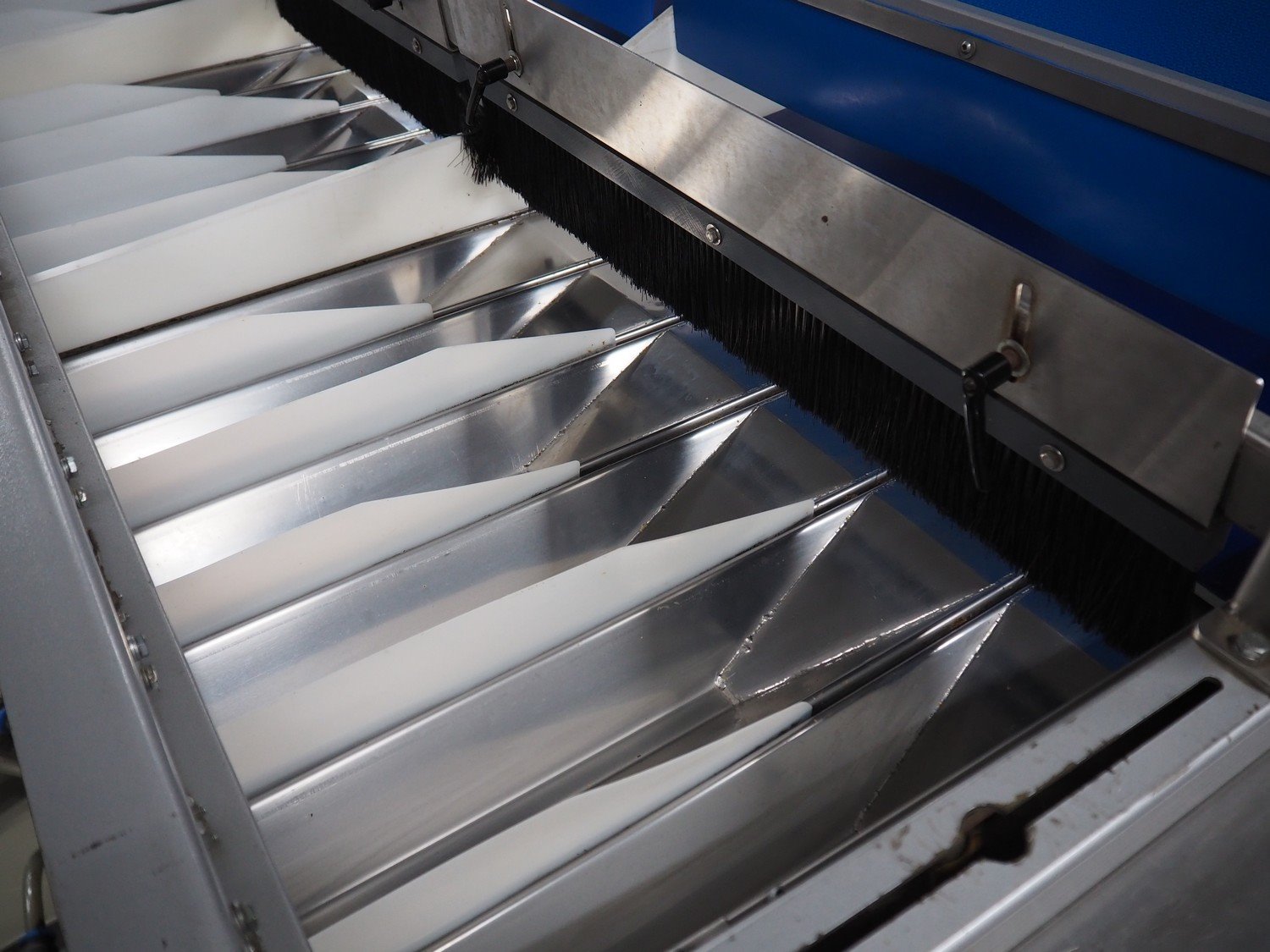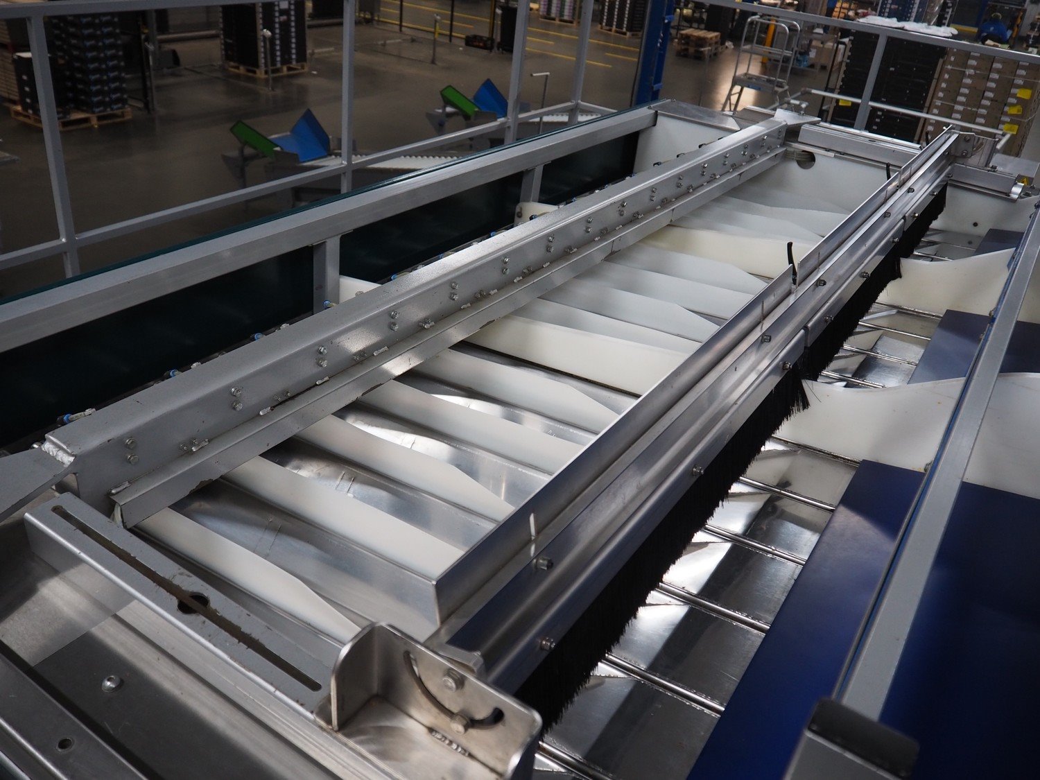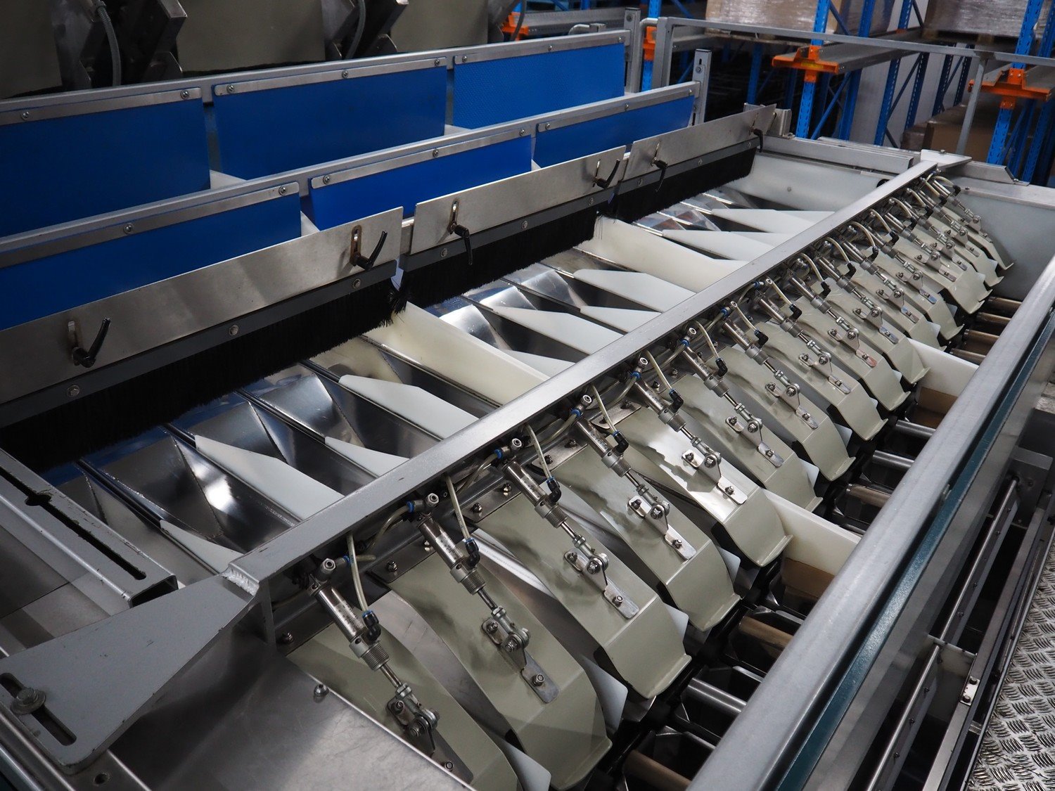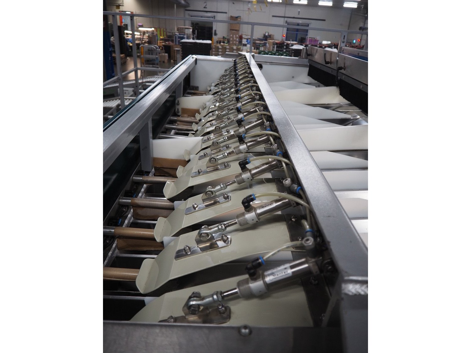 Manter linear weighing machine, type: 16000 Mix, machine number: 210-081, year of construction: 2010, 16 lanes, lane width: (16x) 140 mm, 2 outfeed belts, belt width: (2x) 150 mm, dimensions linear weighing machine: 4800 mm x 3200 mm x 3150 mm, elevating infeed belt, 3 lanes, plastic belt with dividers, belt width: 445 mm, divider height: 40 mm, distance between divides: 240 mm, elevating height: 2900 mm, dimensions elevating belt: 5200 mm x 2400 mm x 3700 mm. Kavel locatie: ABC Westland 210, 2685 DC Poeldijk, Nederland