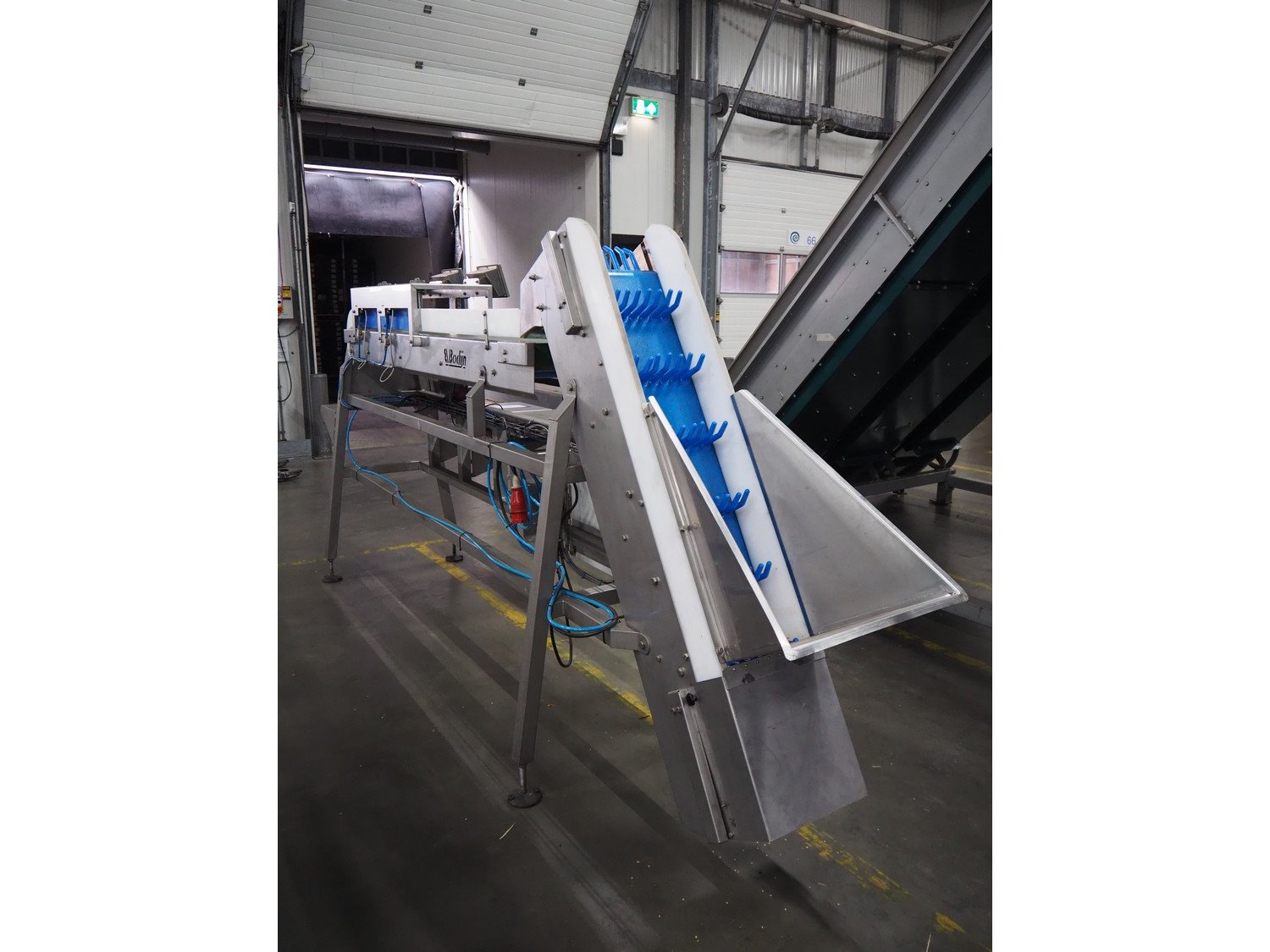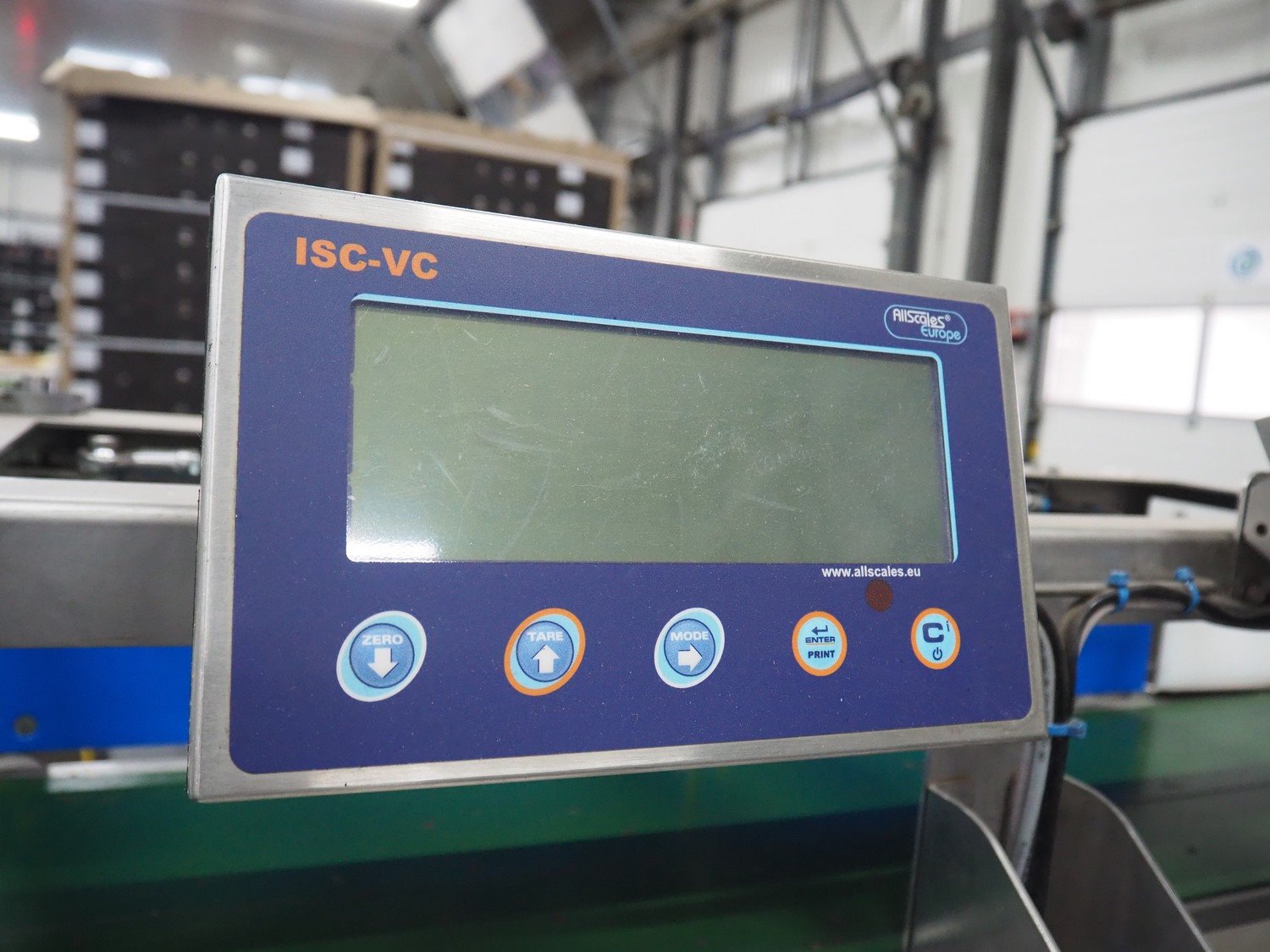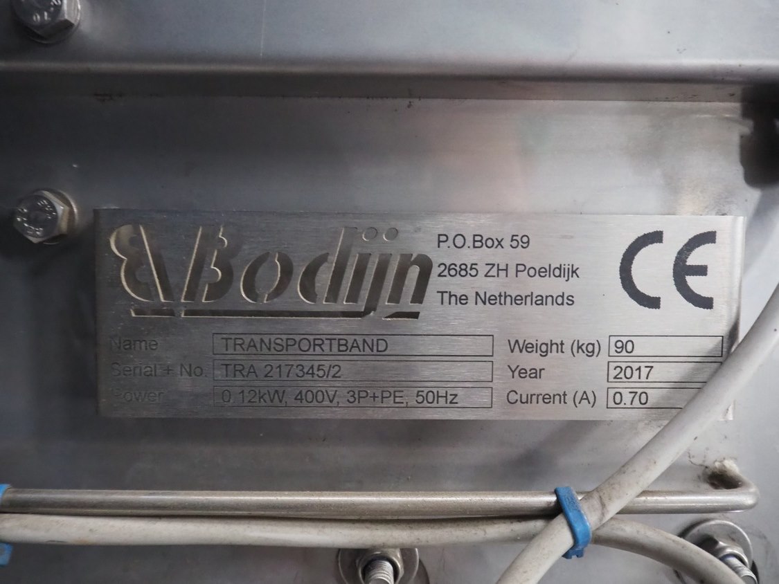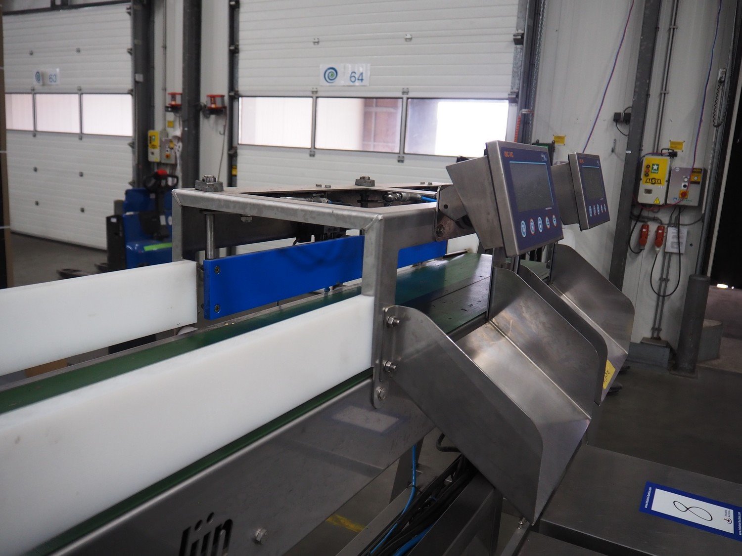 Bodijn grader with 2 Henk Maas Scales weighing scales, year of construction: 2017, 400 V, 3 Ph, 50 Hz, 0,27 kW, 1.60 A, plastic belt with dividers, belt width: 265 mm, divider height: 110 mm, distance between dividers: 180 mm, plastic belt, belt width: 280 mm, total dimensions: 3850 mm x 1100 mm x 1700 mm. Kavel locatie: ABC Westland 210, 2685 DC Poeldijk, Nederland