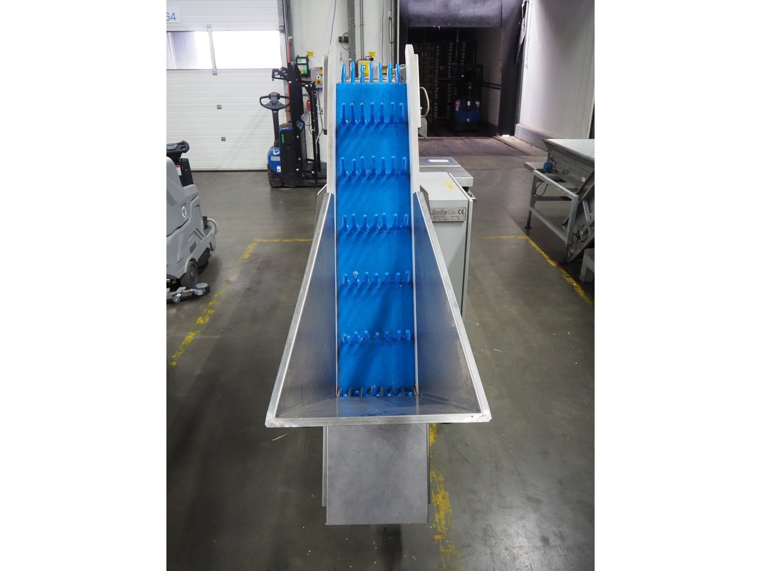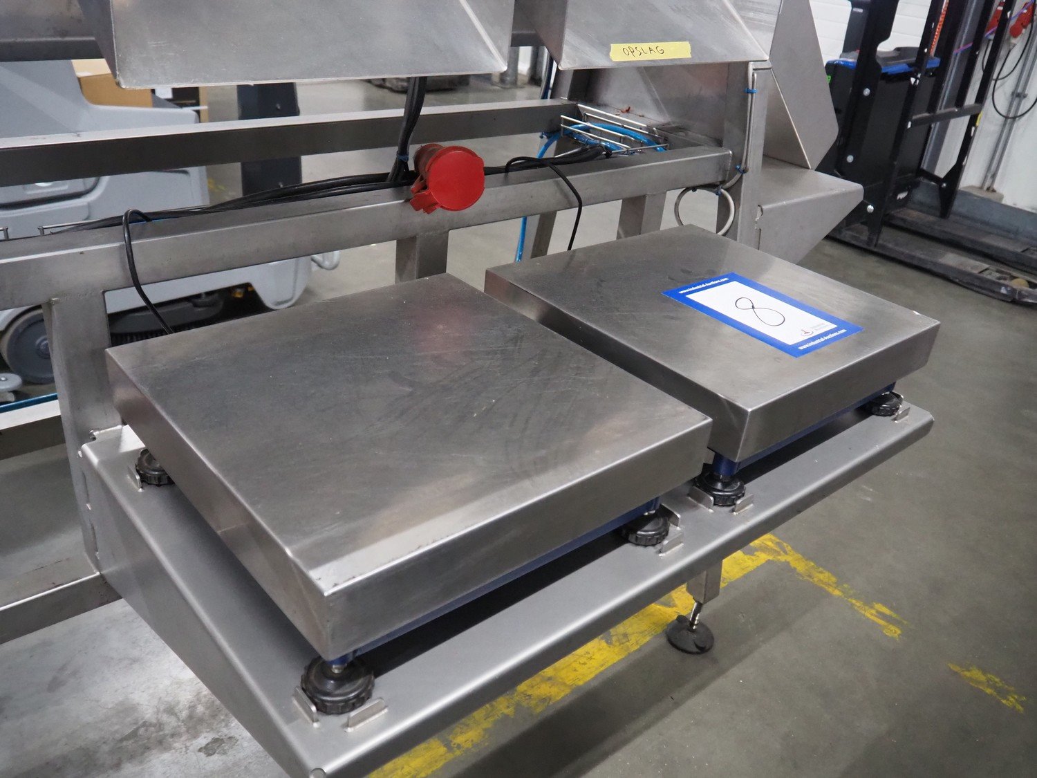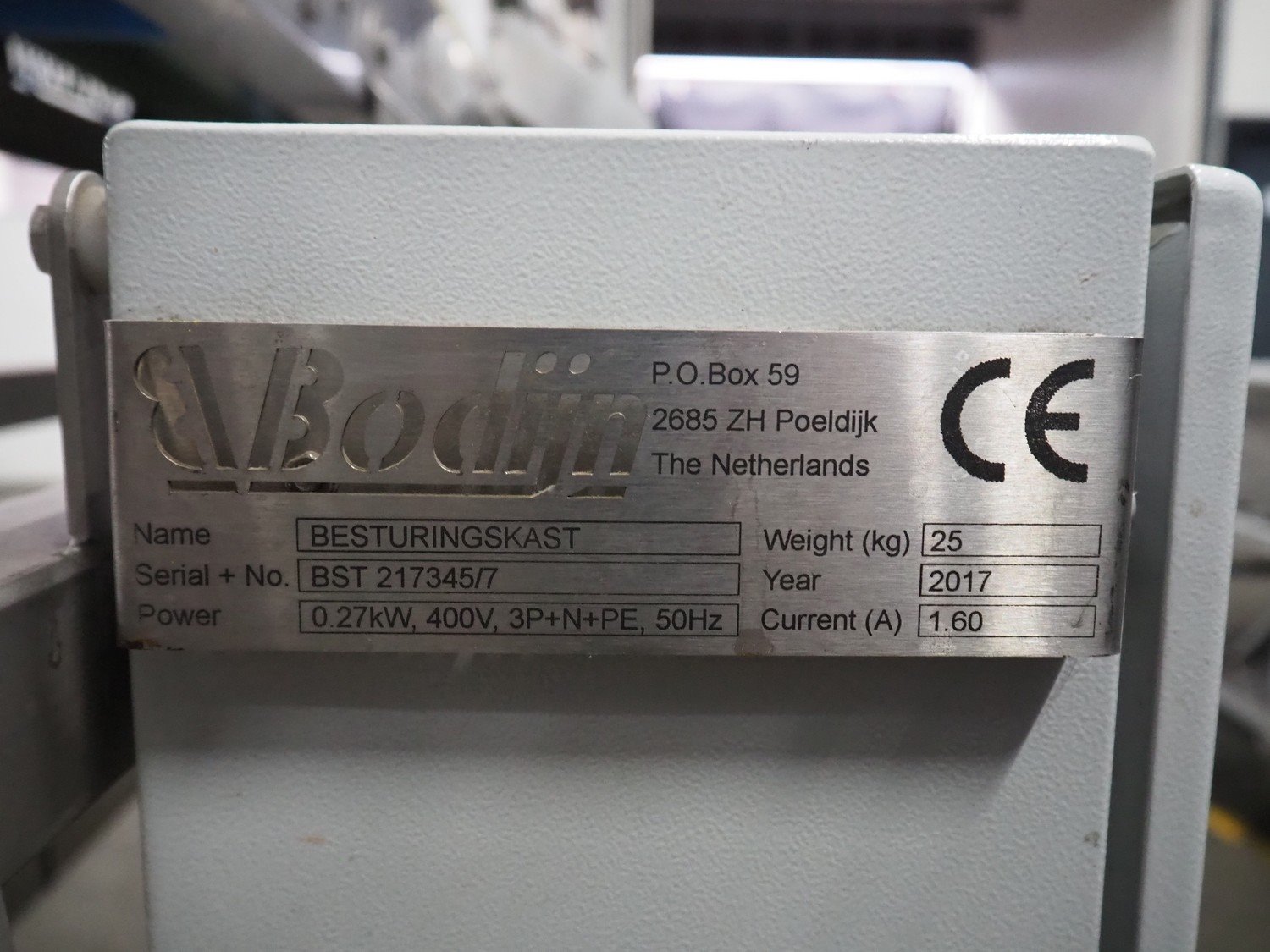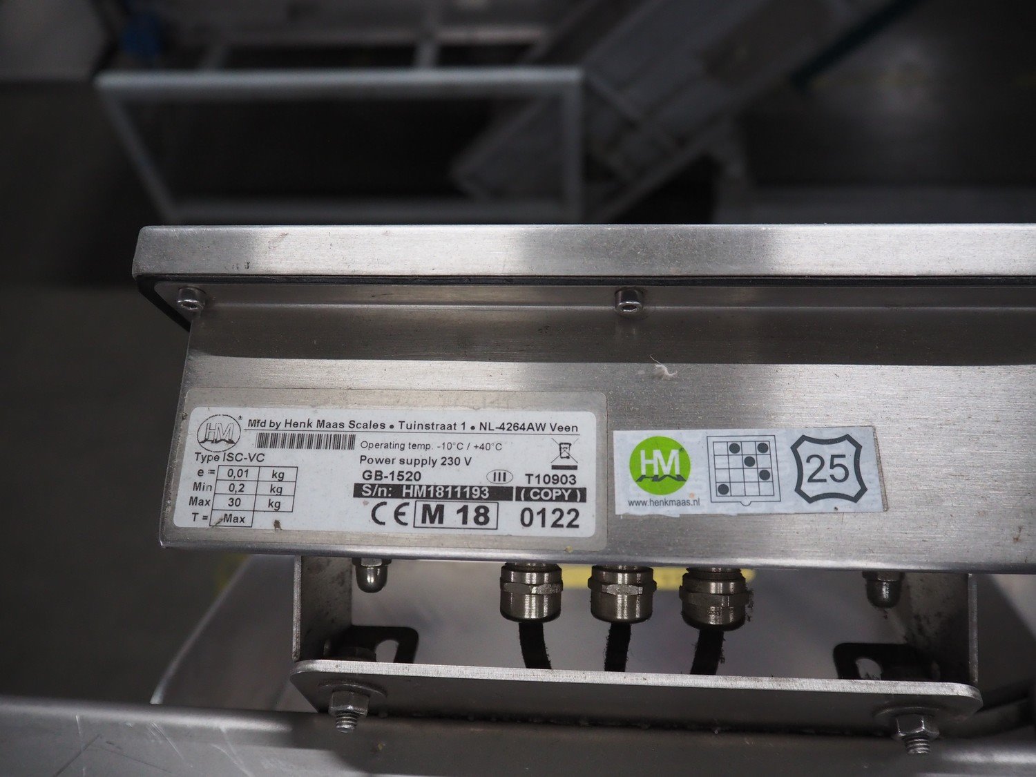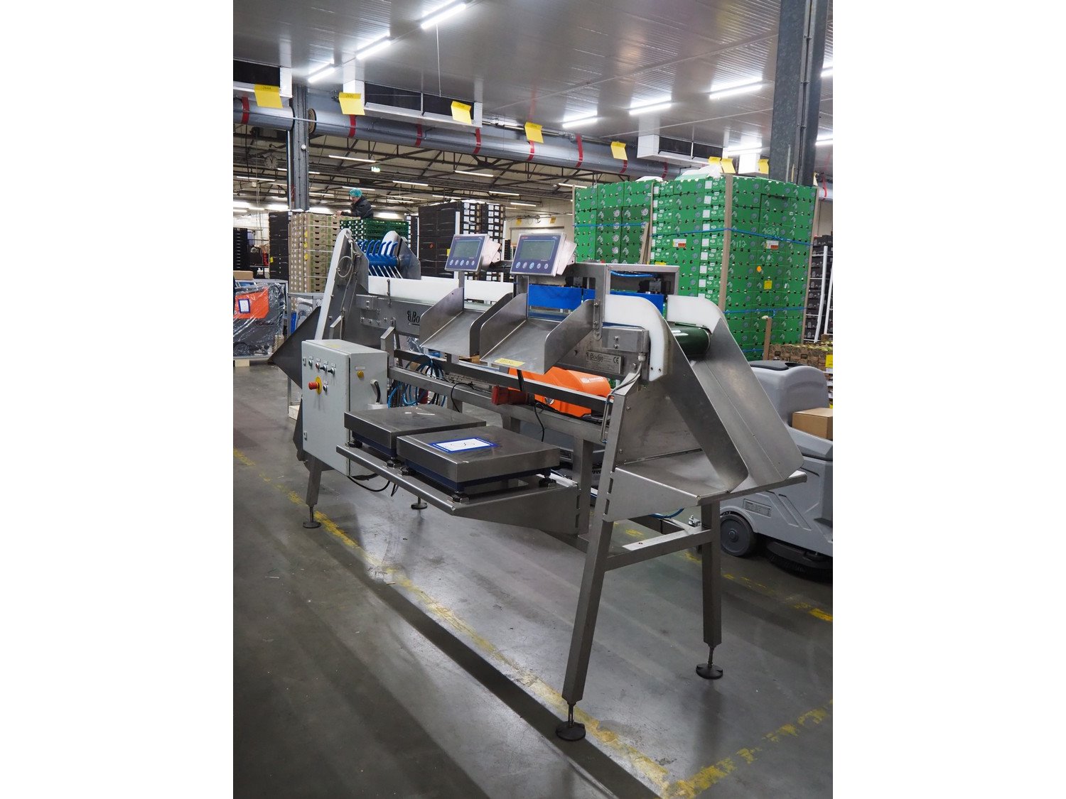 Bodijn grader with 2 Henk Maas Scales weighing scales, year of construction: 2017, 400 V, 3 Ph, 50 Hz, 0,27 kW, 1.60 A, plastic belt with dividers, belt width: 265 mm, divider height: 110 mm, distance between dividers: 180 mm, plastic belt, belt width: 280 mm, total dimensions: 3850 mm x 1100 mm x 1700 mm. Kavel locatie: ABC Westland 210, 2685 DC Poeldijk, Nederland