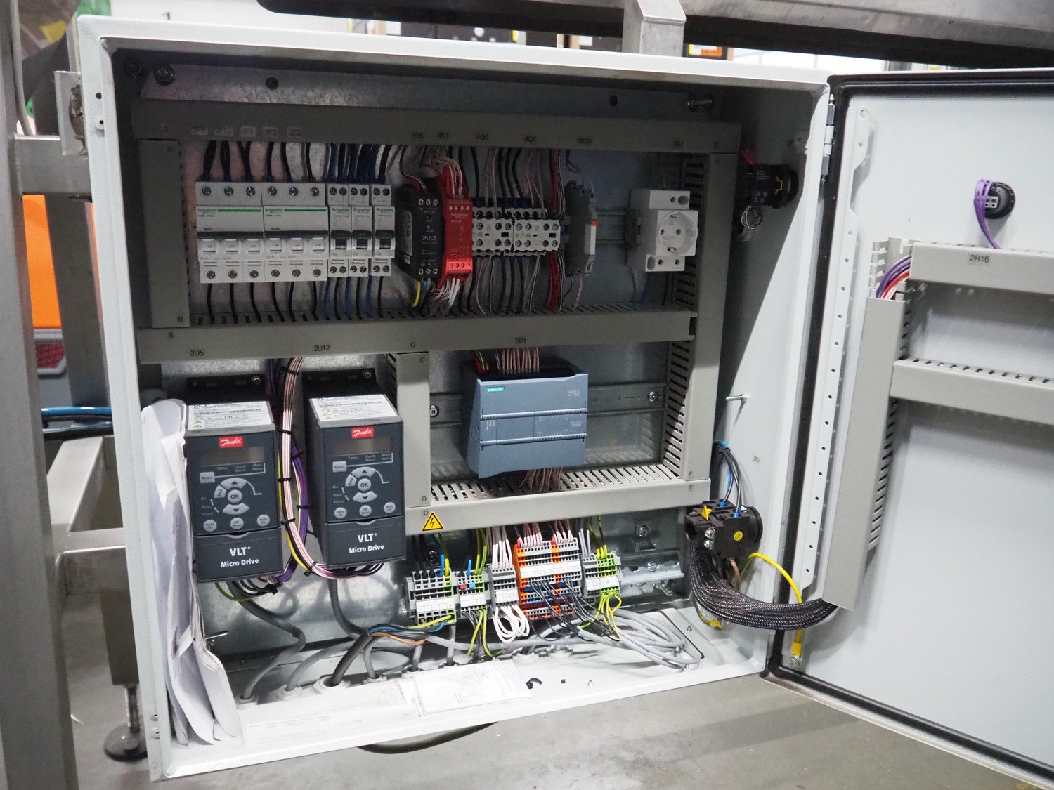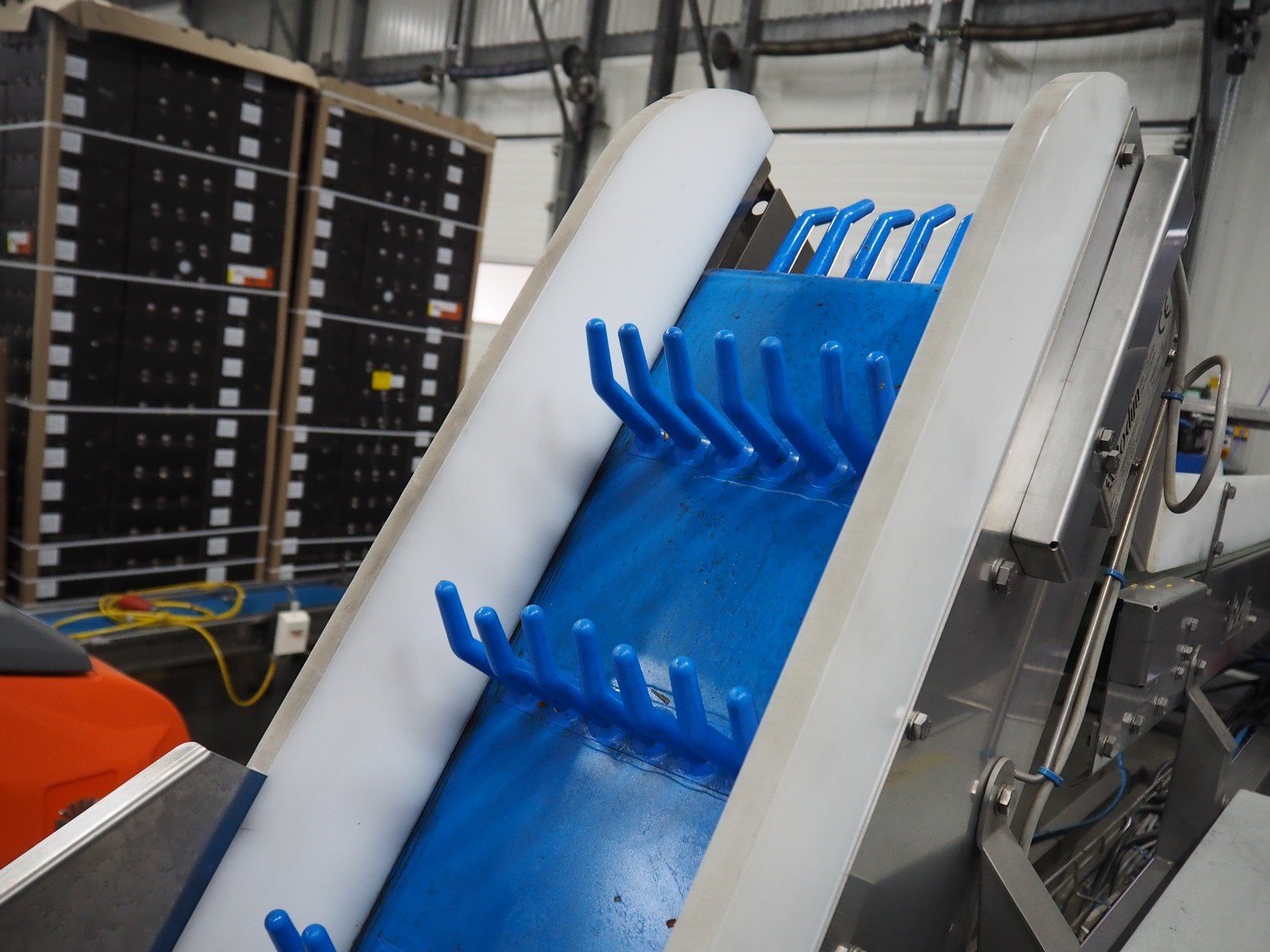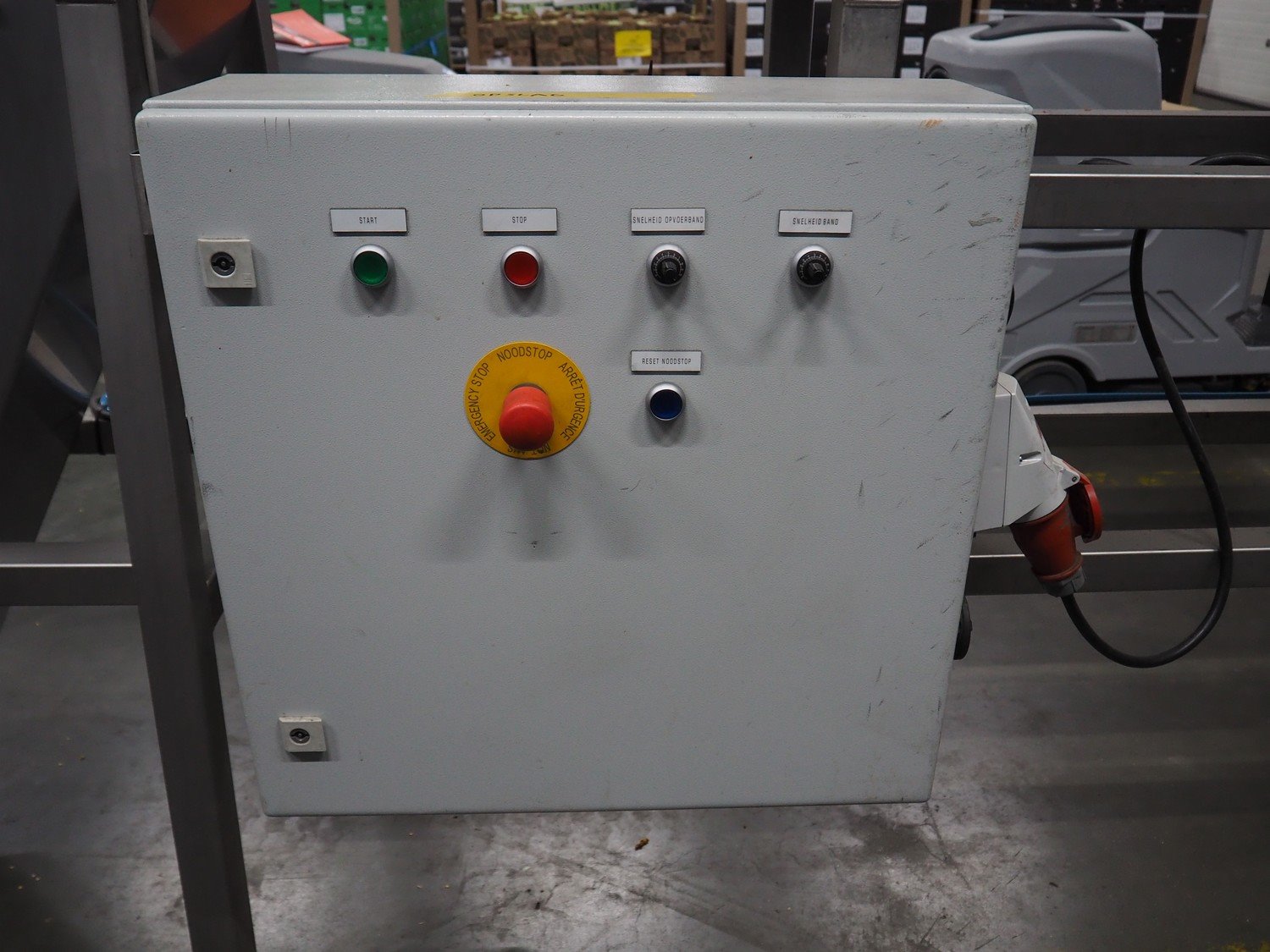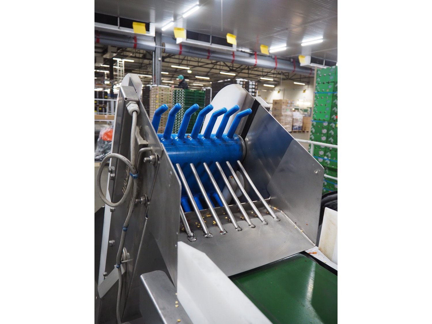 Bodijn grader with 2 Henk Maas Scales weighing scales, year of construction: 2017, 400 V, 3 Ph, 50 Hz, 0,27 kW, 1.60 A, plastic belt with dividers, belt width: 265 mm, divider height: 110 mm, distance between dividers: 180 mm, plastic belt, belt width: 280 mm, total dimensions: 3850 mm x 1100 mm x 1700 mm. Kavel locatie: ABC Westland 210, 2685 DC Poeldijk, Nederland