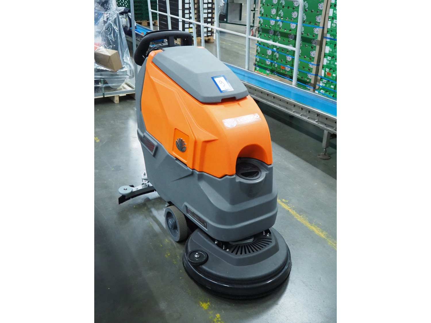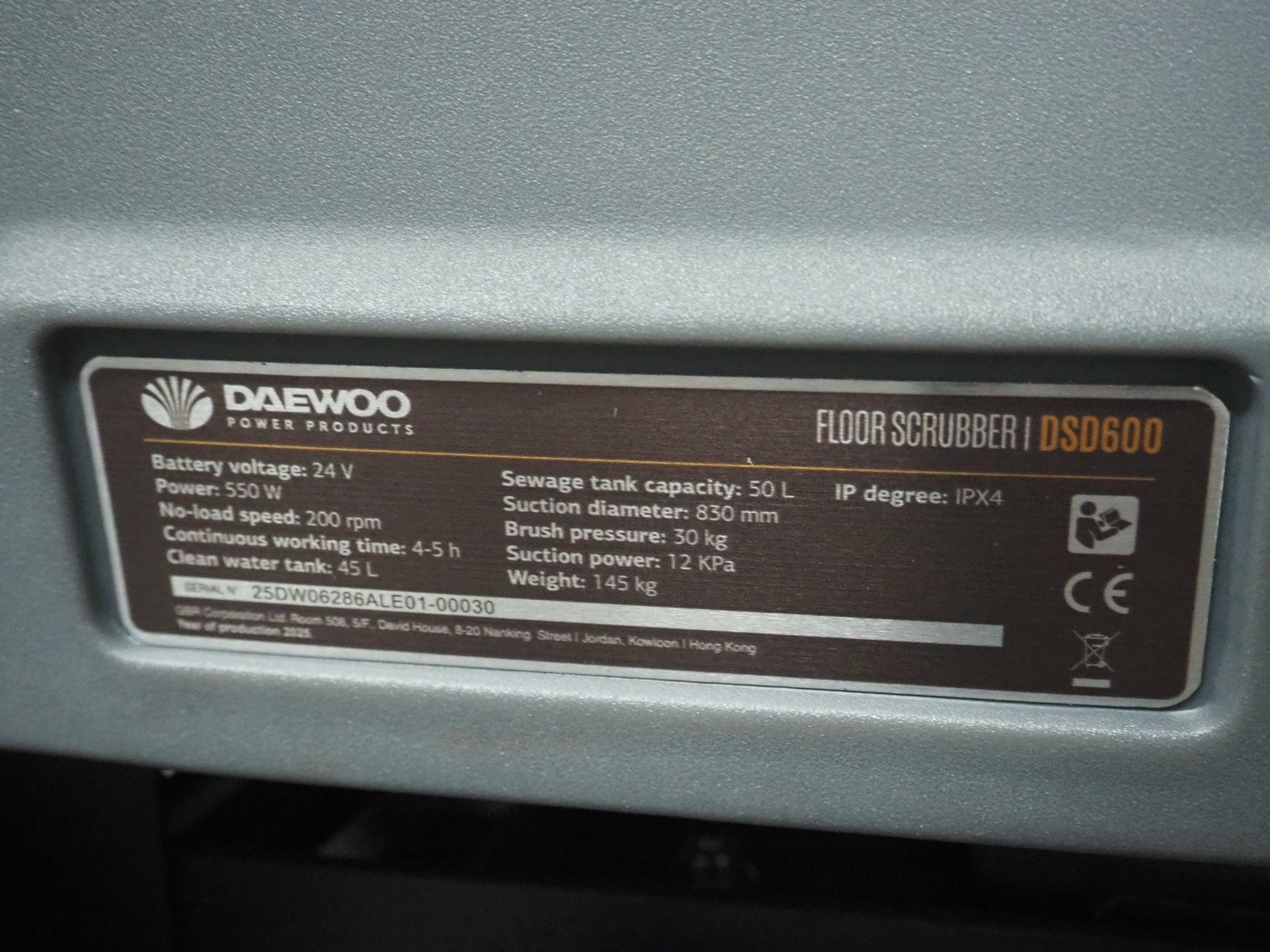 Daewoo floor scrubbing machine, type: DSD600, serial number: 25DW06286ALE01-00033, year of construction: 2025, battery voltage: 24 V, power: 550 W, No-load speed: 200 rpm, continuous working time: 4-5 h, clean water tank: 45 litres, sewage tank capacity: 50 litres, suction diameter: 830 mm, brush pressure: 30 kg, suction power: 12 KPa, weight: 145 kg, dimensions: 1250 mm x 800 mm x 1100 mm. Including battery charger. New. Kavel locatie: ABC Westland 210, 2685 DC Poeldijk, Nederland