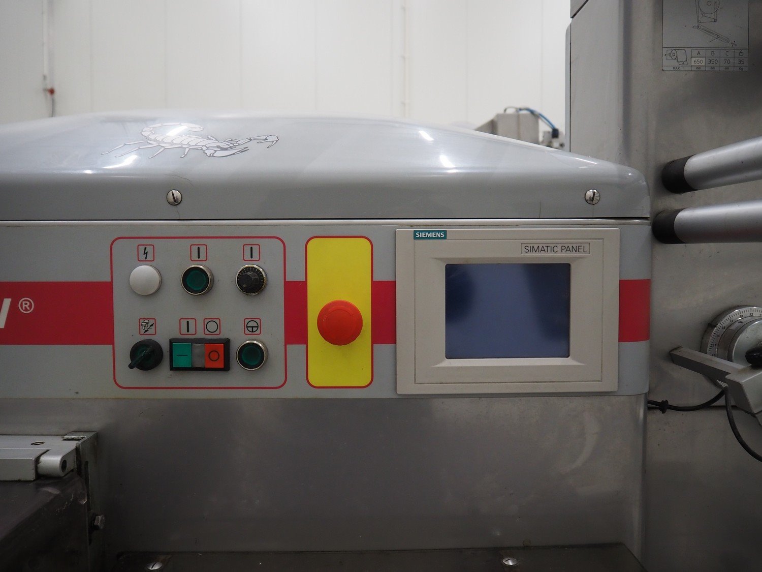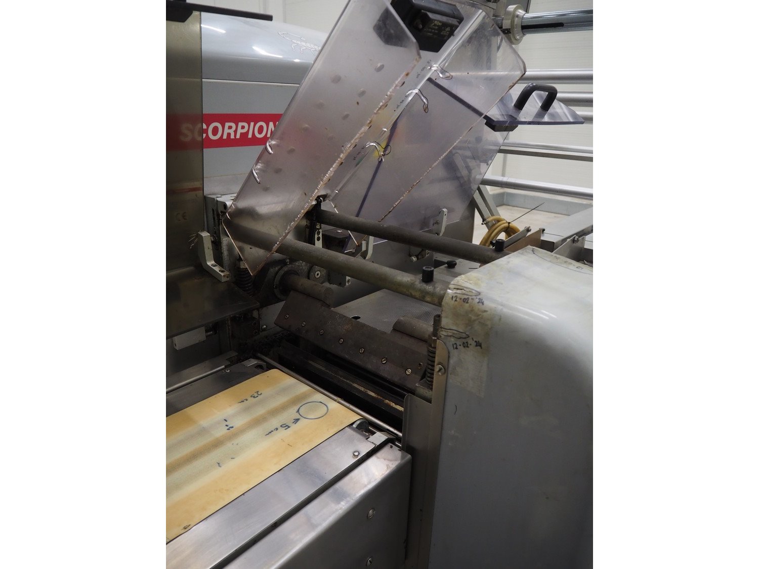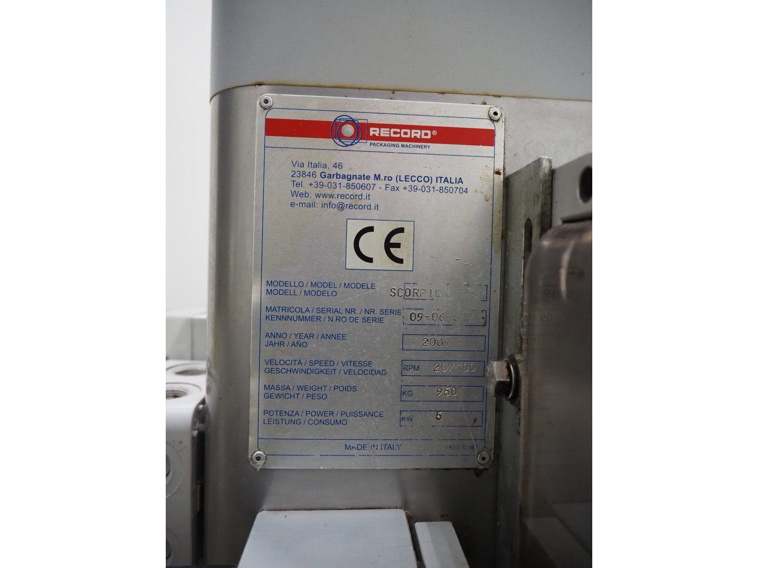 Record flowpacker, type: SCORPION E S., serial number: 09-06-612, year of construction: 2007, weight: 950 kg, 5 kW, distance between dividers: 300 mm, seal width: 350 mm, plastic belt, belt width: 210 mm, total dimensions: 6300 mm x 1500 mm x 2250 mm. Kavel locatie: ABC Westland 210, 2685 DC Poeldijk, Nederland