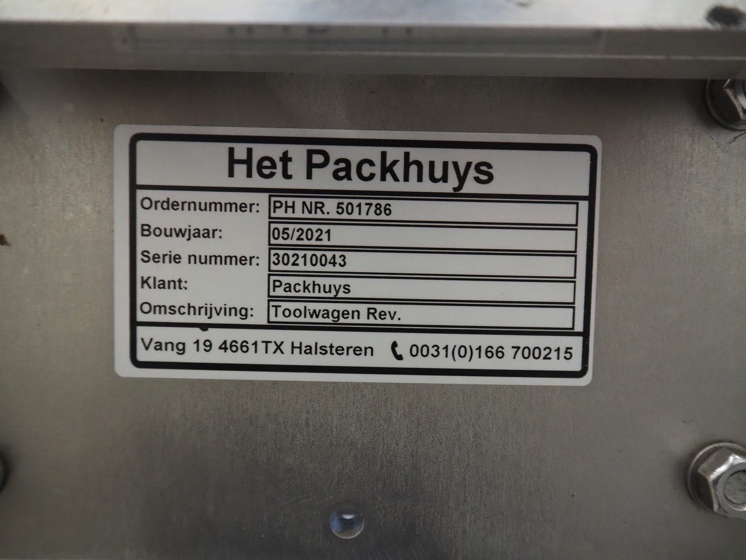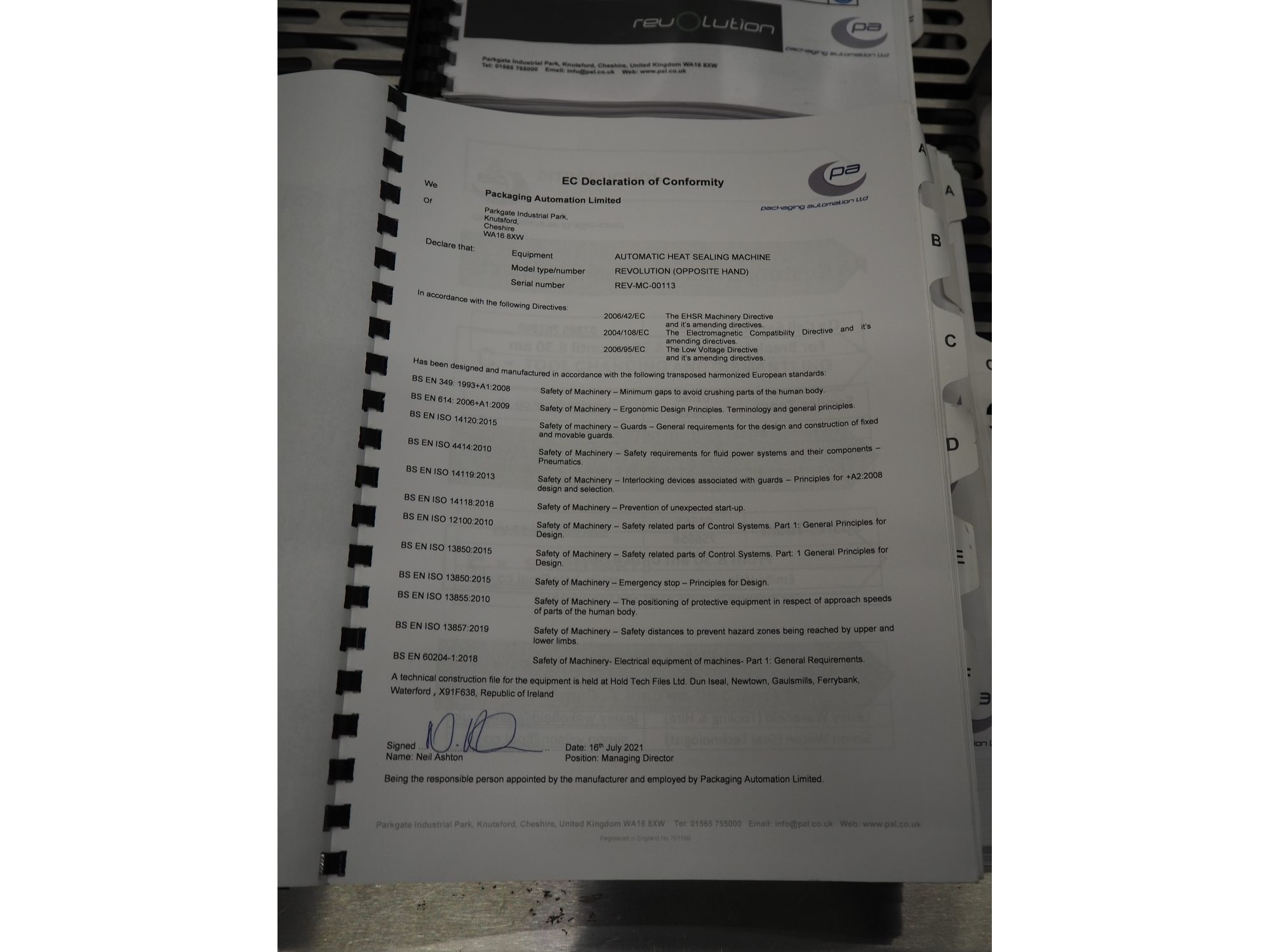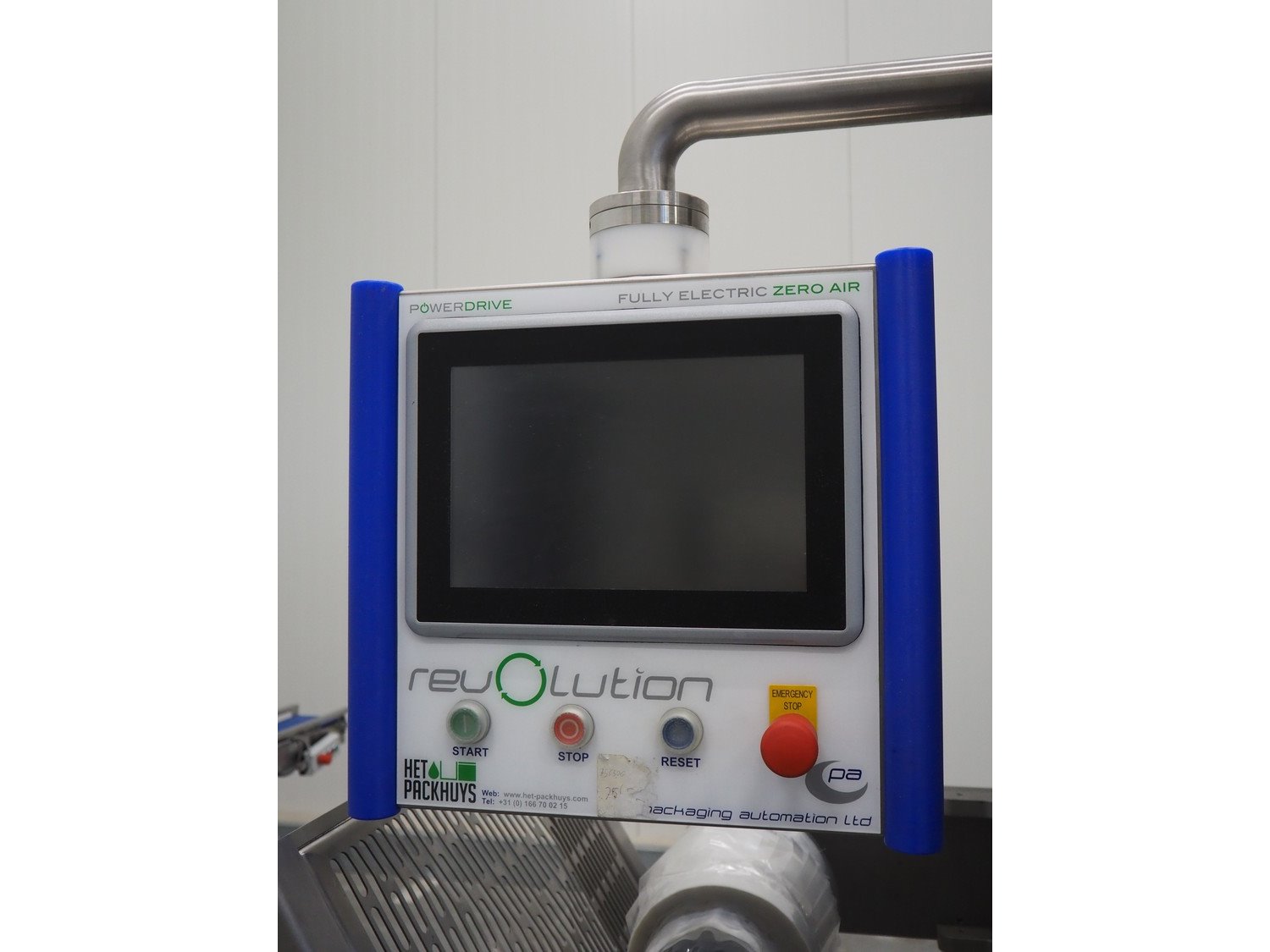 Packaging Automation Ltd traysealer, model: REVOLUTION (OPPOSITE HAND), serial number: REV-MC-00113, year of construction: 2021, 415 V, 3 Ph, 50 Hz, 32 A, plastic belt, belt width: 290 mm, film width: 235 mm, dimensions dyes: (8x) 110 mm x 180 mm, total dimensions: 4100 mm x 950 mm x 2150 mm. Including 2 s/s trolley with parts, dimensions dyes: (8x) 110 mm x 130 mm, dimensions trolleys: 750 mm x 1000 mm x 1400 mm, 750 mm x 1000 mm x 2450 mm. Kavel locatie: ABC Westland 210, 2685 DC Poeldijk, Nederland