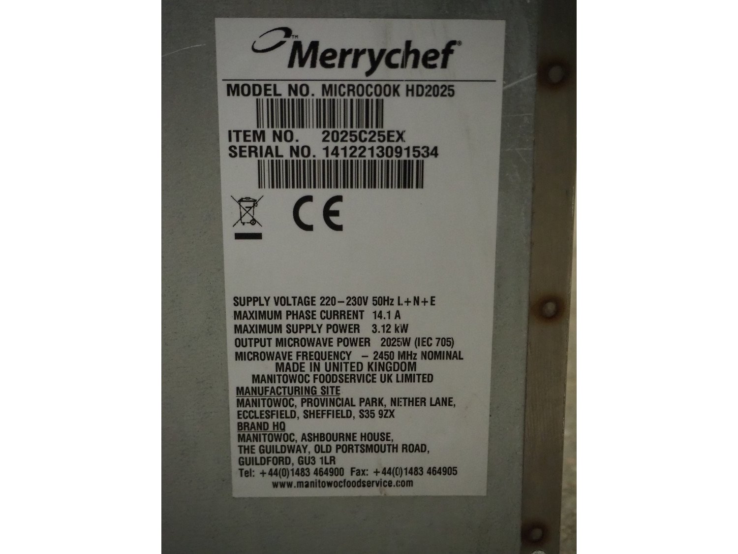 Merrychef Microcook, model number: MICROCOOK HD2025, serial number: 1412213091534 , 220-230 V, 50 Hz, 14.1 A, 3.12 kW, dimensions inside: 540 mm x 360 mm x 200 mm, total dimensions: 650 mm x 520 mm x 480 mm. Kavel locatie: Kaldenkerkerweg 5, 5932 CS Tegelen, Nederland
