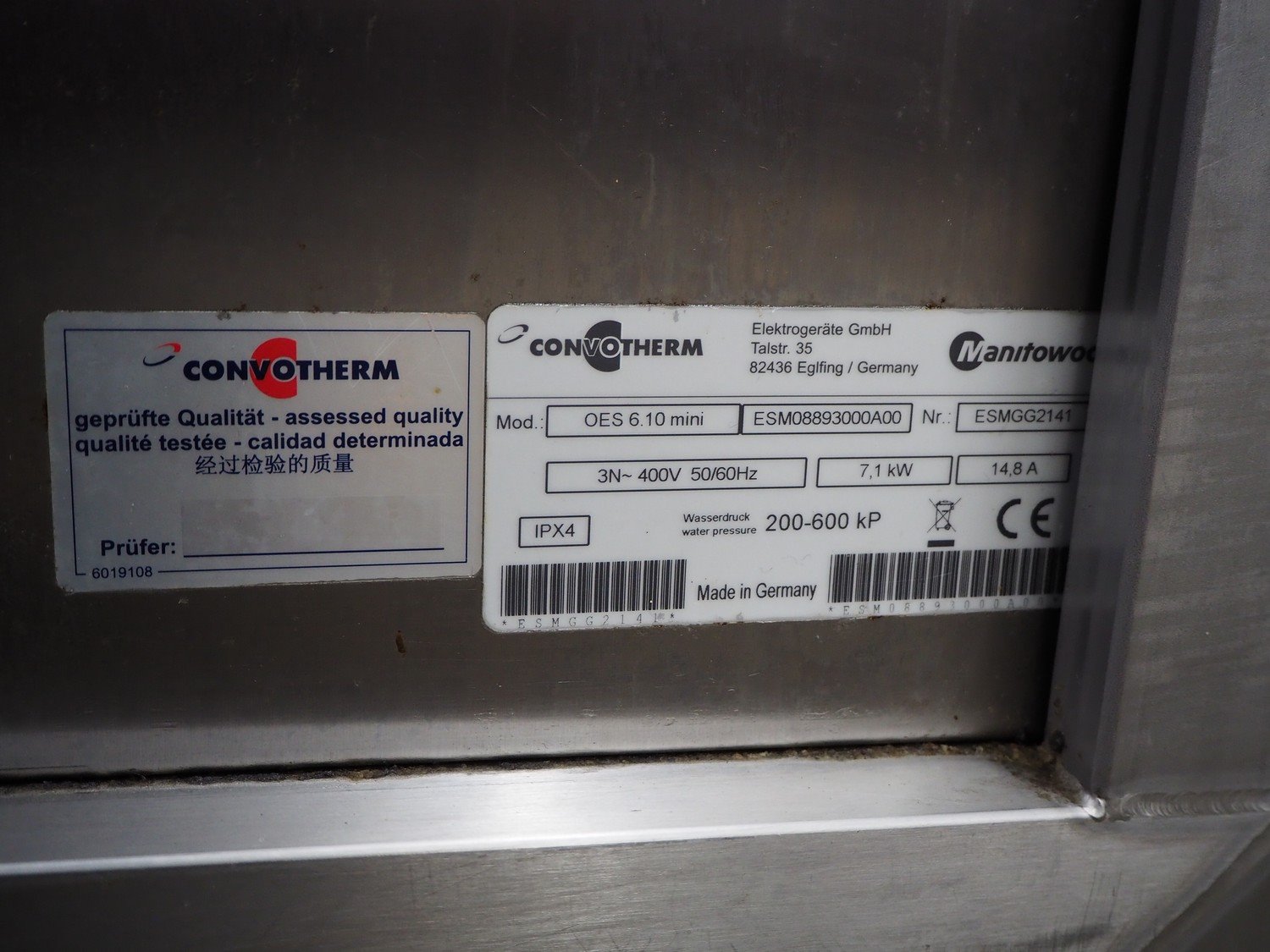 Convotherm double combi steamer, model: (2x) OES 6.10 mini, number: EIMFL1252 and ESMGG2141, 400 V, 3 Ph, 50/60 Hz, 14.8 A, 7.1 kW, (2x) 12 floors, dimensions each floor: 500 mm x 330 mm, total dimensions: 900 mm x 560 mm x 1800 mm. Kavel locatie: Kaldenkerkerweg 5, 5932 CS Tegelen, Nederland