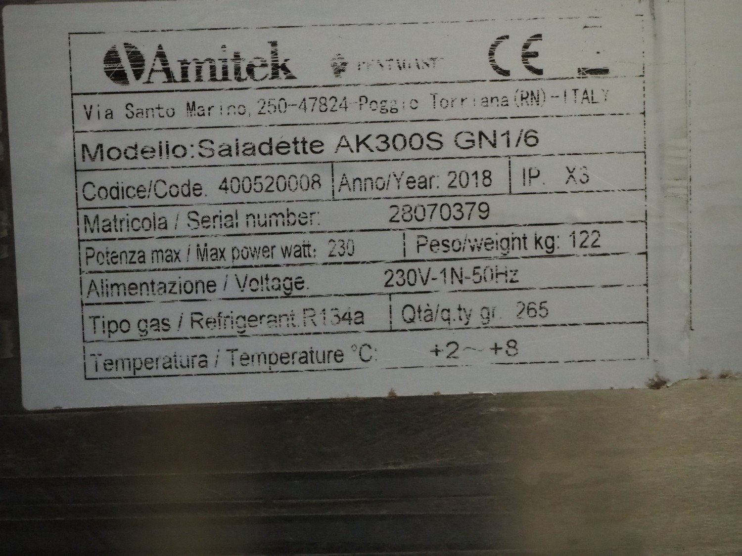 Amitek saladette, model: Saladette AK300S GN1/6, serial number: 28070379, year of construction: 2018, 230 V, 1 Ph, 50 Hz, weight: 122 kg, temperature: 2-8 °C, dimensions inside: (3x) 590 mm x 335 mm, total dimensions: 1370 mm x 700 mm x 1000 mm. Kavel locatie: Kaldenkerkerweg 5, 5932 CS Tegelen, Nederland