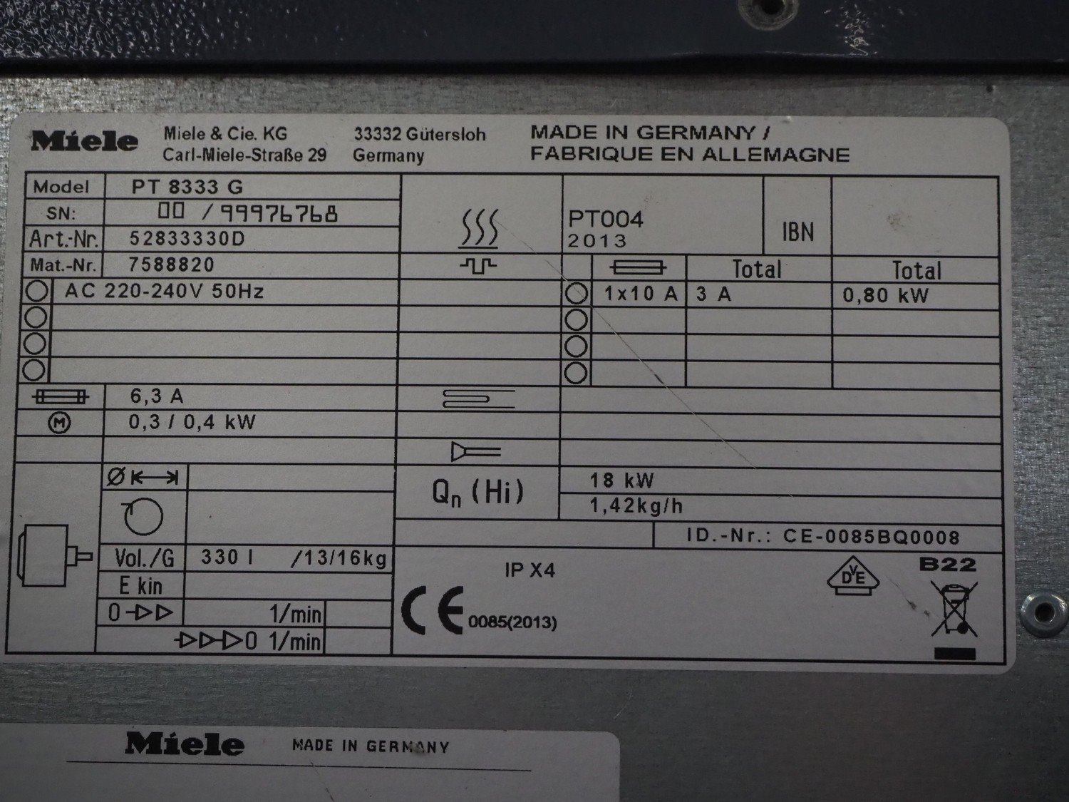 Miele dryer, model: PT 8333 G, serial number: 00/99976768, 220/240 V, 50 Hz, 6.3 A, 0.3/0.4 kW, capacity: 13/16 Kg, total dimensions: 1020 mm x 910 mm x 1400 mm. Kavel locatie: Kaldenkerkerweg 5, 5932 CS Tegelen, Nederland