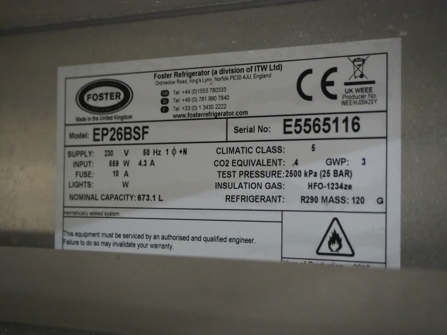Foster mobile refrigerator, model: EP 26 BSF, serial number: E5565116, 230 V, 1 Ph, 50 Hz, 4.3 A, 559 W, capacity: 673.1 liter, refrigerant: R290/120 g, 16 floors, dimensions each floor: 730 mm x 420 mm, total dimensions: 940 mm x 700 mm x 2300 mm. Kavel locatie: Kaldenkerkerweg 5, 5932 CS Tegelen, Nederland