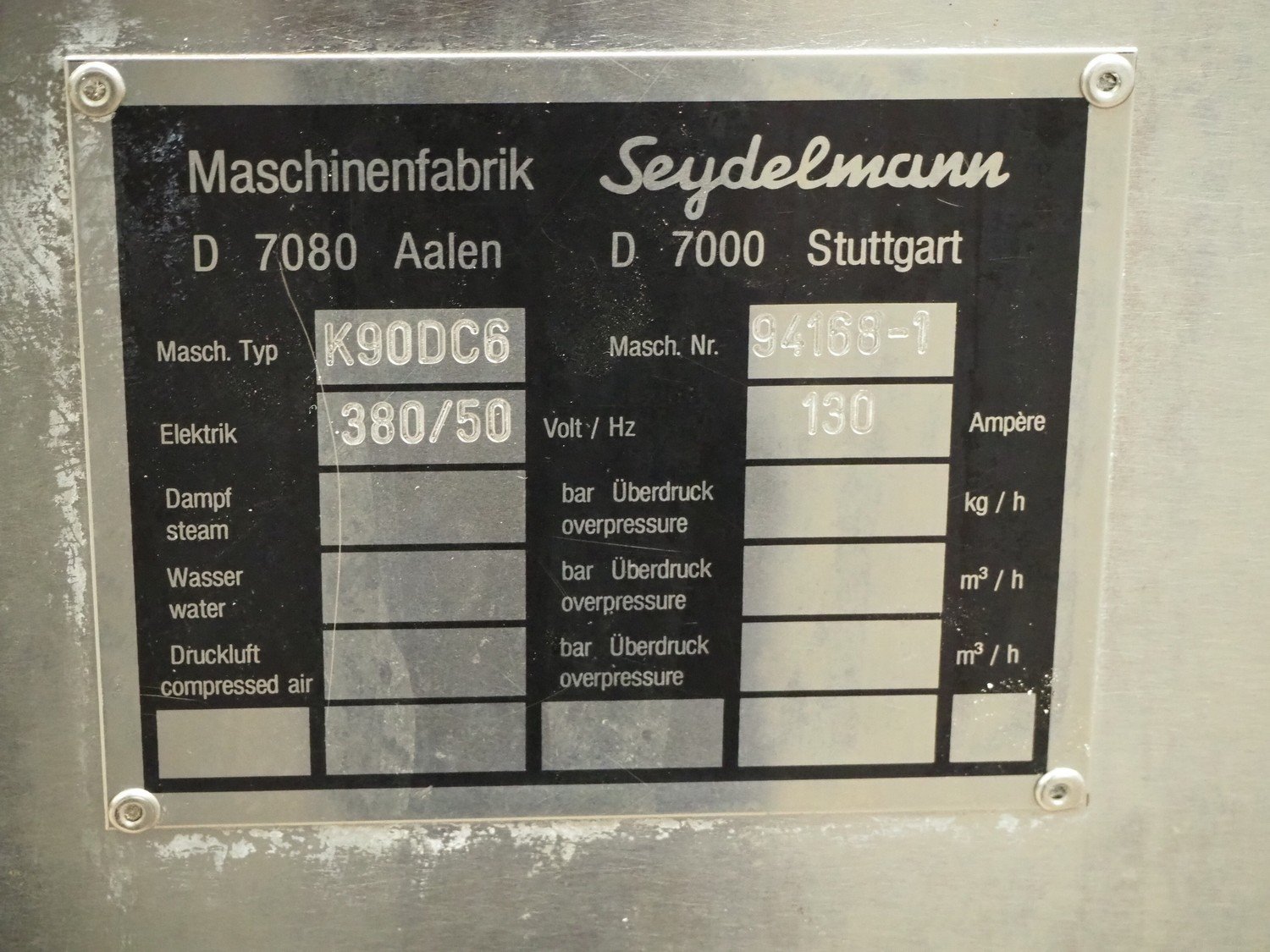 Seydelmann cutter, type: K90DC6, machine number: 94168-1, 380 V, 50 Hz, 130 A, volume: 90 liter, s/s bowl, type control panel: Micro-12, dimensions: 1330 mm x 2050 mm x 1600 mm. Kavel locatie: Kaldenkerkerweg 5, 5932 CS Tegelen, Nederland