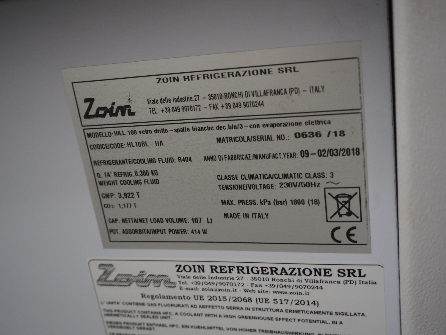 Zoin Refrigerazione Srl mobile refrigerated showcase, model: HILL 100, serial number: 0636/18, year of construction: 2018, 230 V, 50 Hz, refrigerant: R404/0.300 kg, dimensions: 1070 mm x 800 mm x 1300 mm. Kavel locatie: Kaldenkerkerweg 5, 5932 CS Tegelen, Nederland